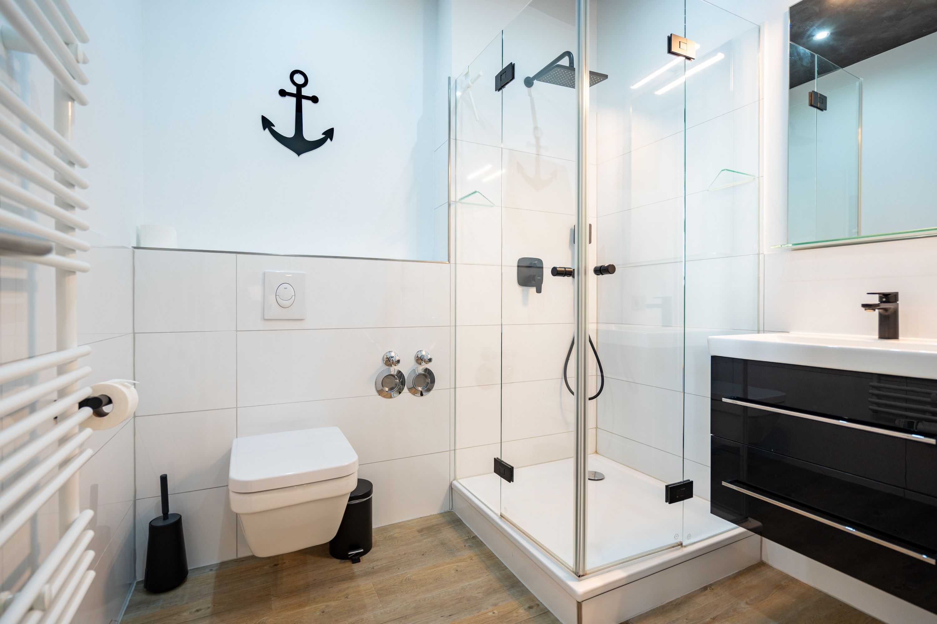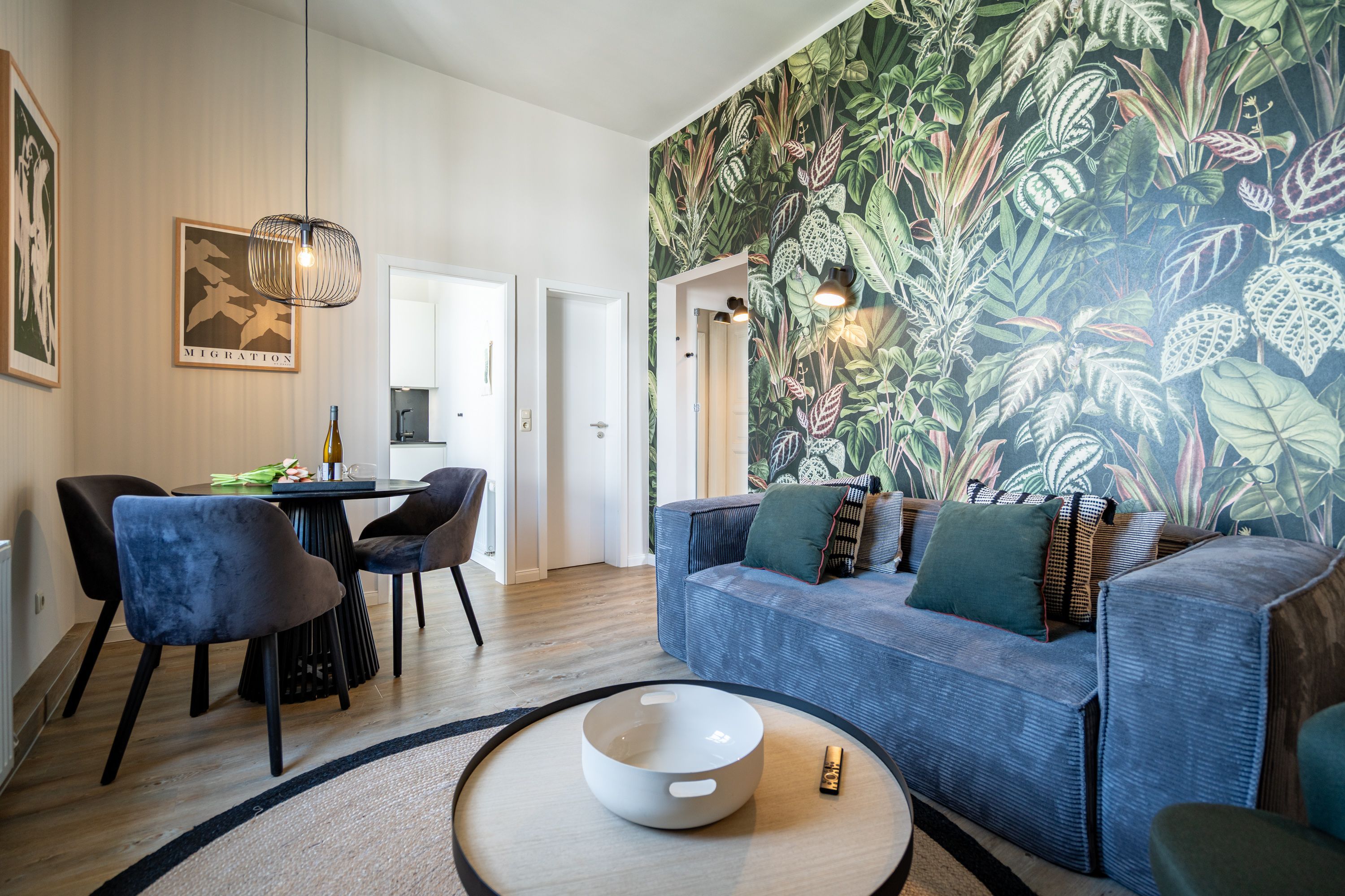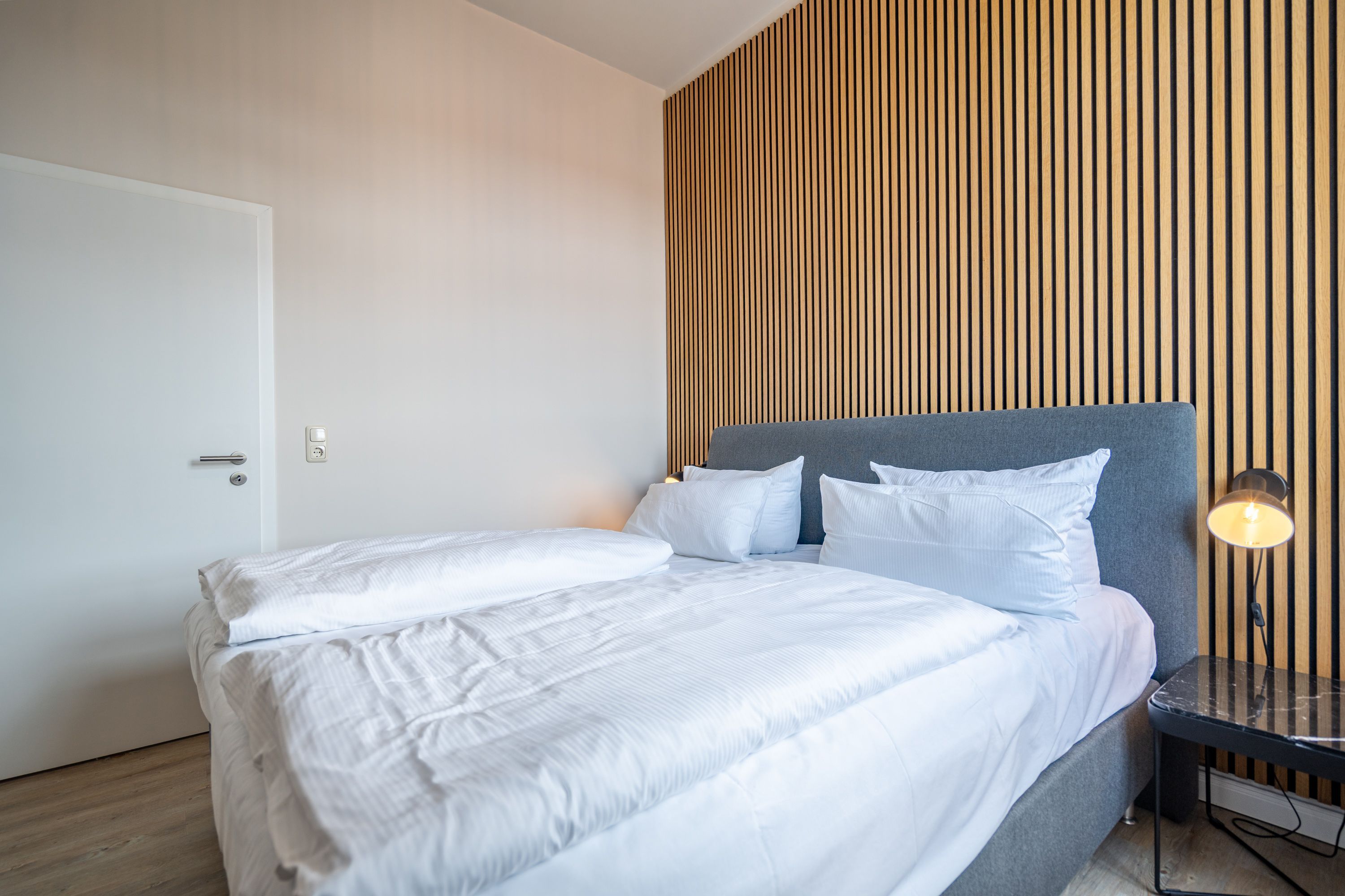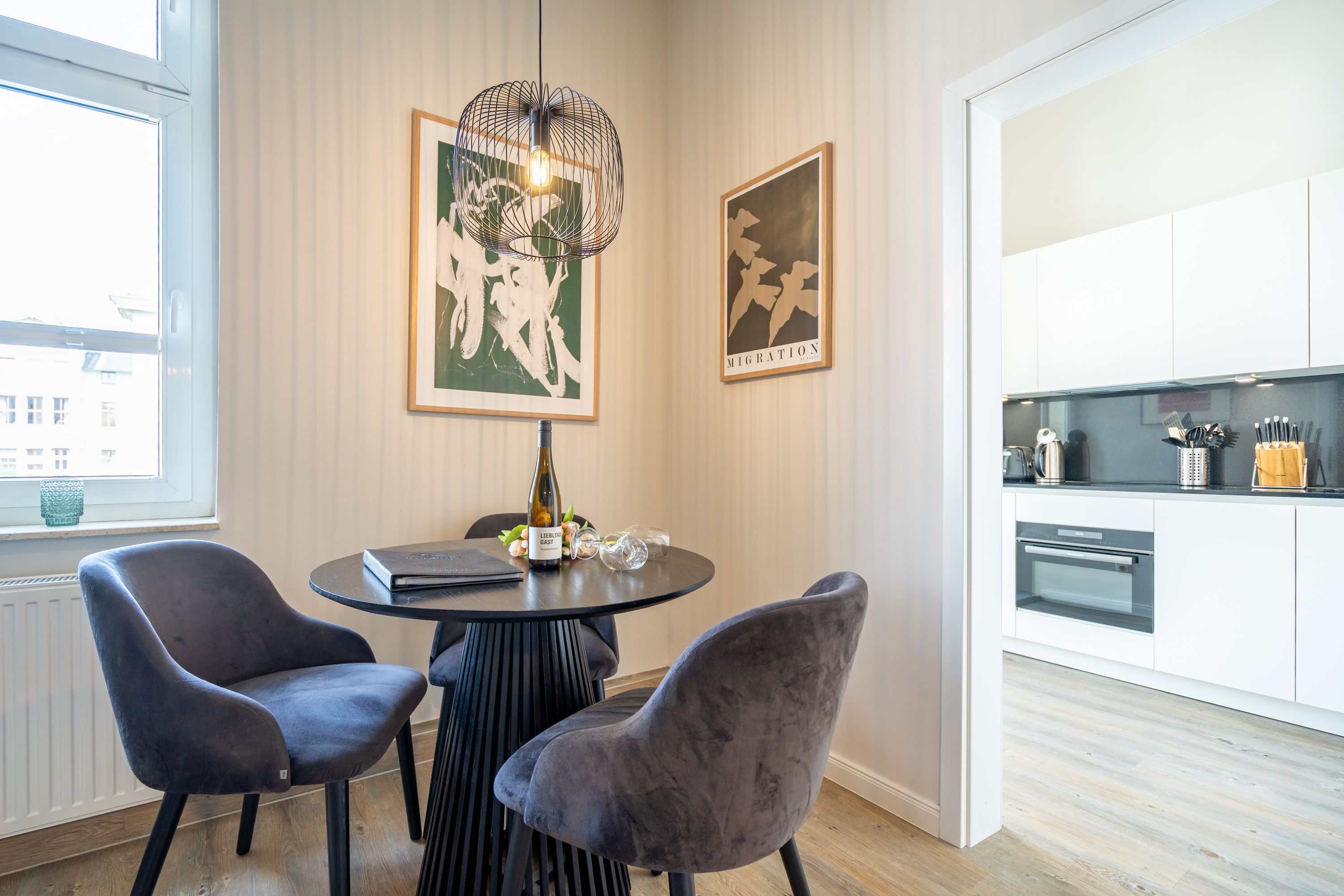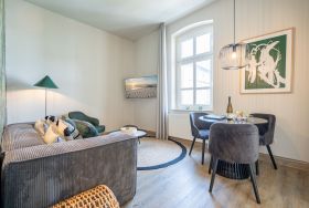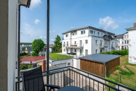 Diese stilvolle 2-Raum-Ferienwohnung (36 qm) für 2 Personen befindet sich im 1. Obergeschoss und liegt zur Nord-West-Seite. Der Wohnbereich bietet eine gemütliche Couch, einen Flachbildfernseher und einen ansprechenden Essplatz. Die separate Küche ist komplett ausgestattet und bietet Zugang zu einem kleinen Balkon, der nach Nord-Westen ausgerichtet ist. Im Schlafzimmer befindet sich ein komfortables Boxspringdoppelbett (1,80 m x 2,00 m), ein Kleiderregal und ein weiterer Flachbildfernseher. Das innenliegende Bad ist mit einer Dusche, Waschtisch und einer Toilette ausgestattet. Ein PKW-Stellplatz steht in der Tiefgarage neben dem Gebäude zur Verfügung. Darüber hinaus können Sie das WLAN kostenfrei nutzen.