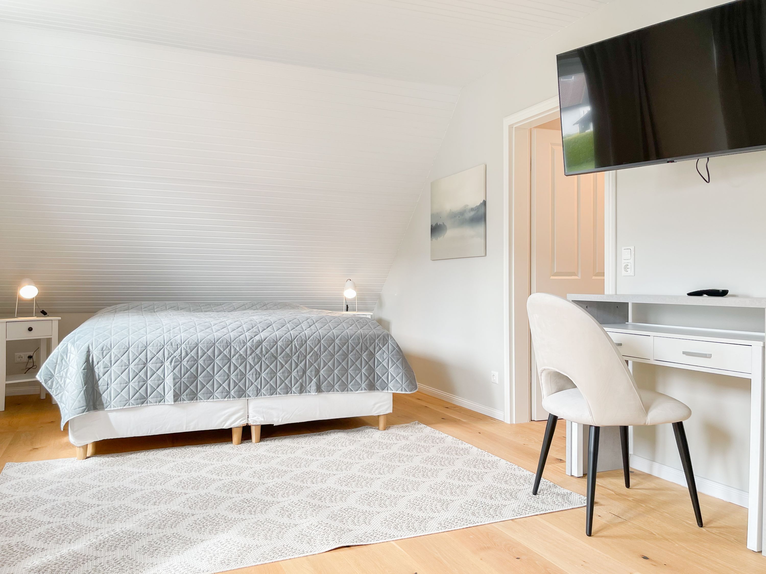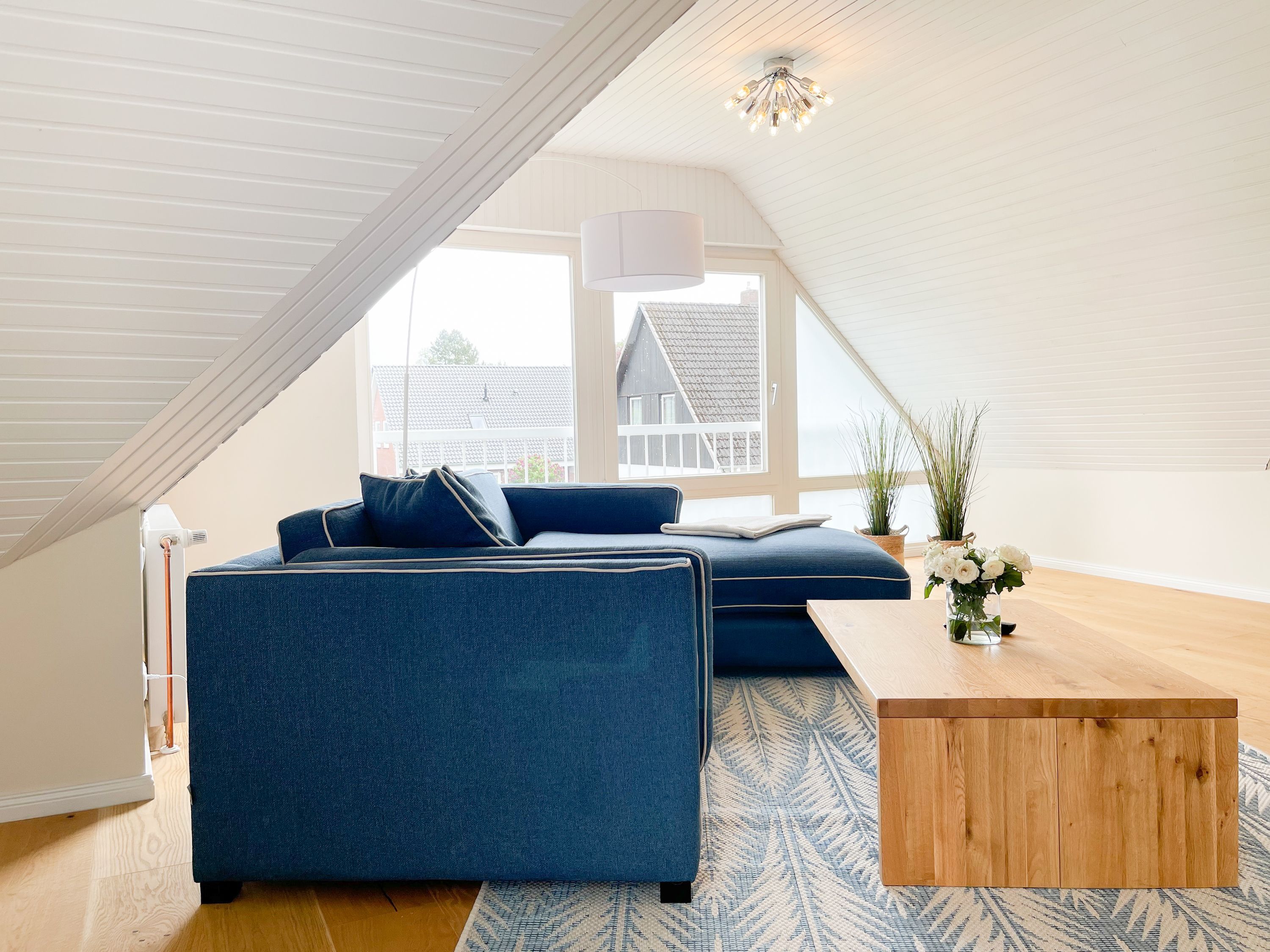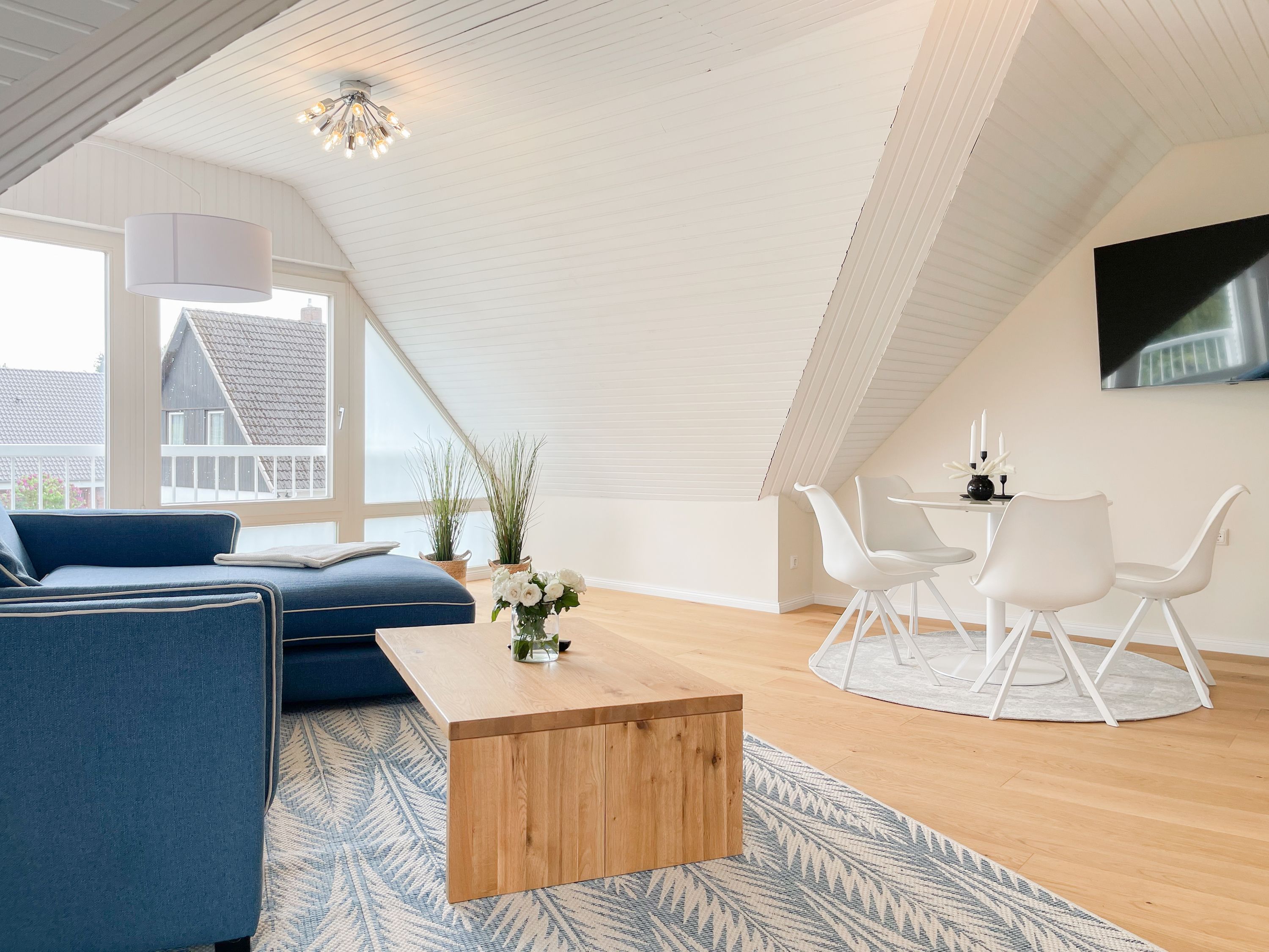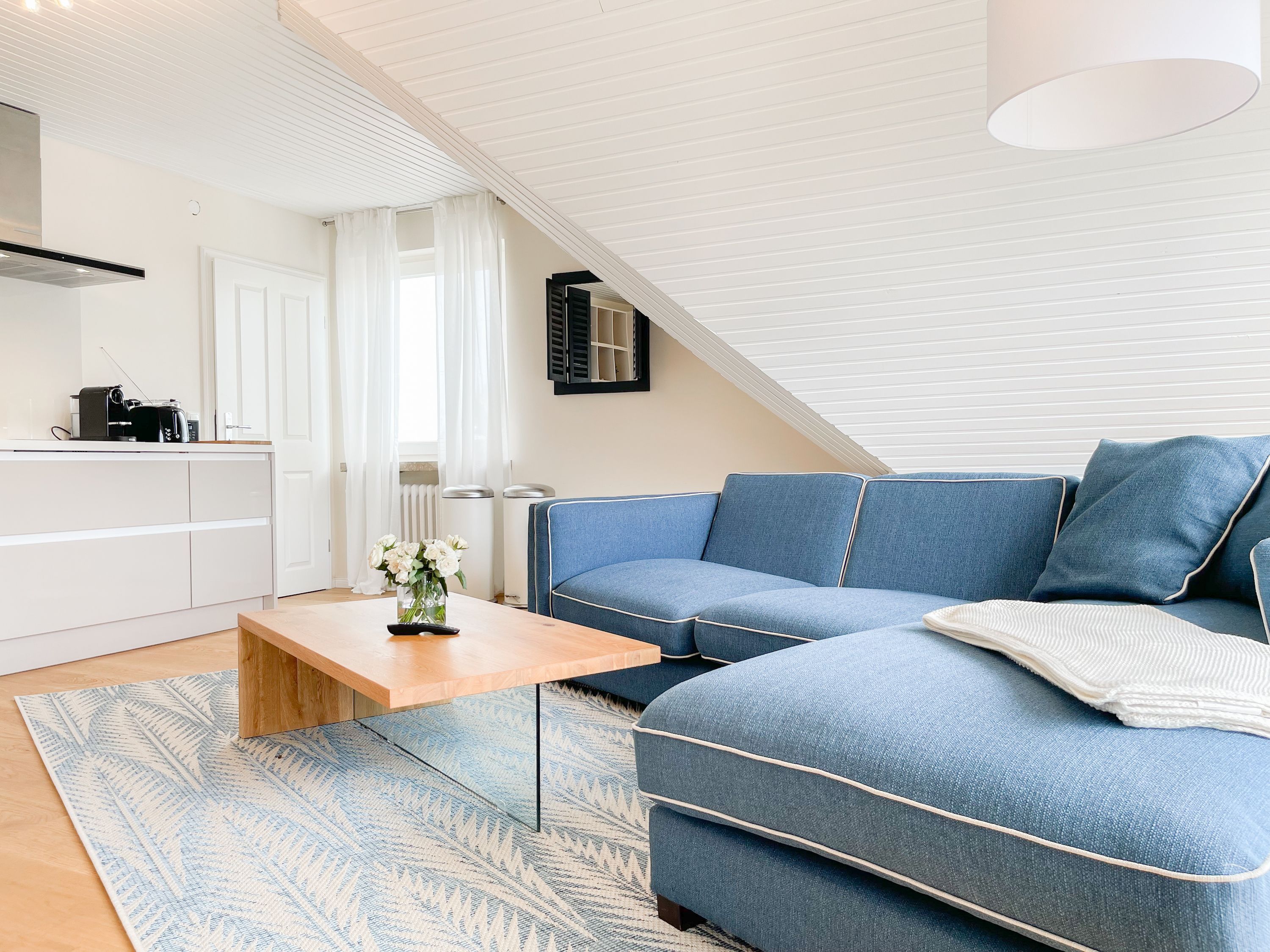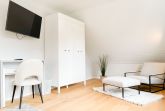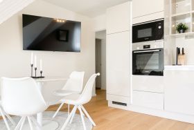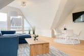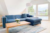 Es erwarten Sie großzügige, sonnige Räumlichkeiten zum wohlfühlen, aufwendig renoviert und geschmackvoll eingerichtet. Mittelpunkt bildet der lichtdurchflutete Wohnbereich, der mit einer XL Sofalandschaft und Smart TV ausgestattet ist. Die integrierte Wohnküche ist bestens ausgestattet und lädt zum gemeinsamen Kochen ein und der anschießende Essbereich ist für 4 Personen eingerichtet. Vom Wohnbereich gelangt man ins erste Schlafzimmer, das mit einem Doppelbett (140x200) ausgestattet ist und über ein modernes Duschbad ensuite verfügt, in dem auch ein kombinierter Waschtrockner untergebracht ist. Das zweite großzügig angelegte Schlafzimmer ist mit einem Doppelbett, Smart TV, Schreibtisch und einer gemütlichen Leseecke eingerichtet. Das moderne Duschbad mit reichlich Tageslicht befindet sich direkt neben dem Schlafzimmer. Es steht ein weiterer Raum mit einem Schreibtisch und einem Schlafsessel zur Verfügung, das bestens als Home Office genutzt werden kann. Zur Wohnung gehört eine eigene Terrasse in Südwestausrichtung, die mit Gartenmöbeln ausgestattet ist. Sie liegt auf der gegenüberliegenden Seite des Hauseinganges, d.h. es besteht keine direkte Verbindung zur Wohnung. 1 Außenstellplatz befindet sich auf dem Grundstück. Fahrräder können sicher und trocken im Holzhaus auf dem Grundstück untergestellt werden.
