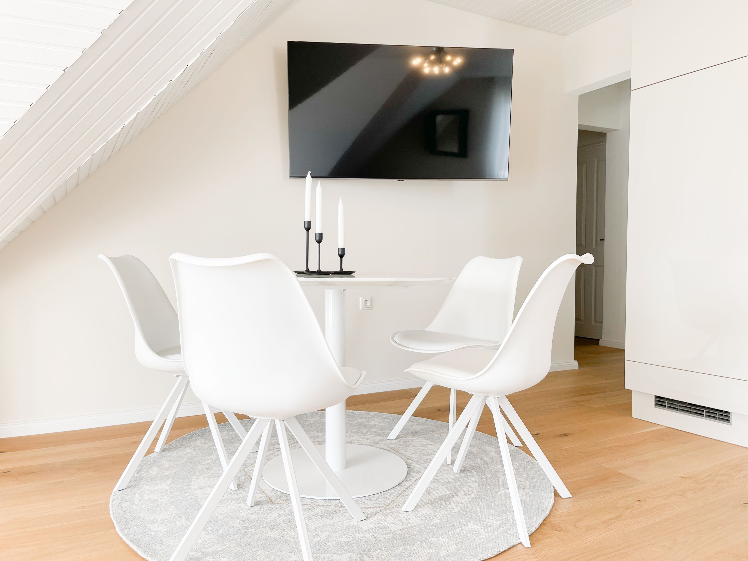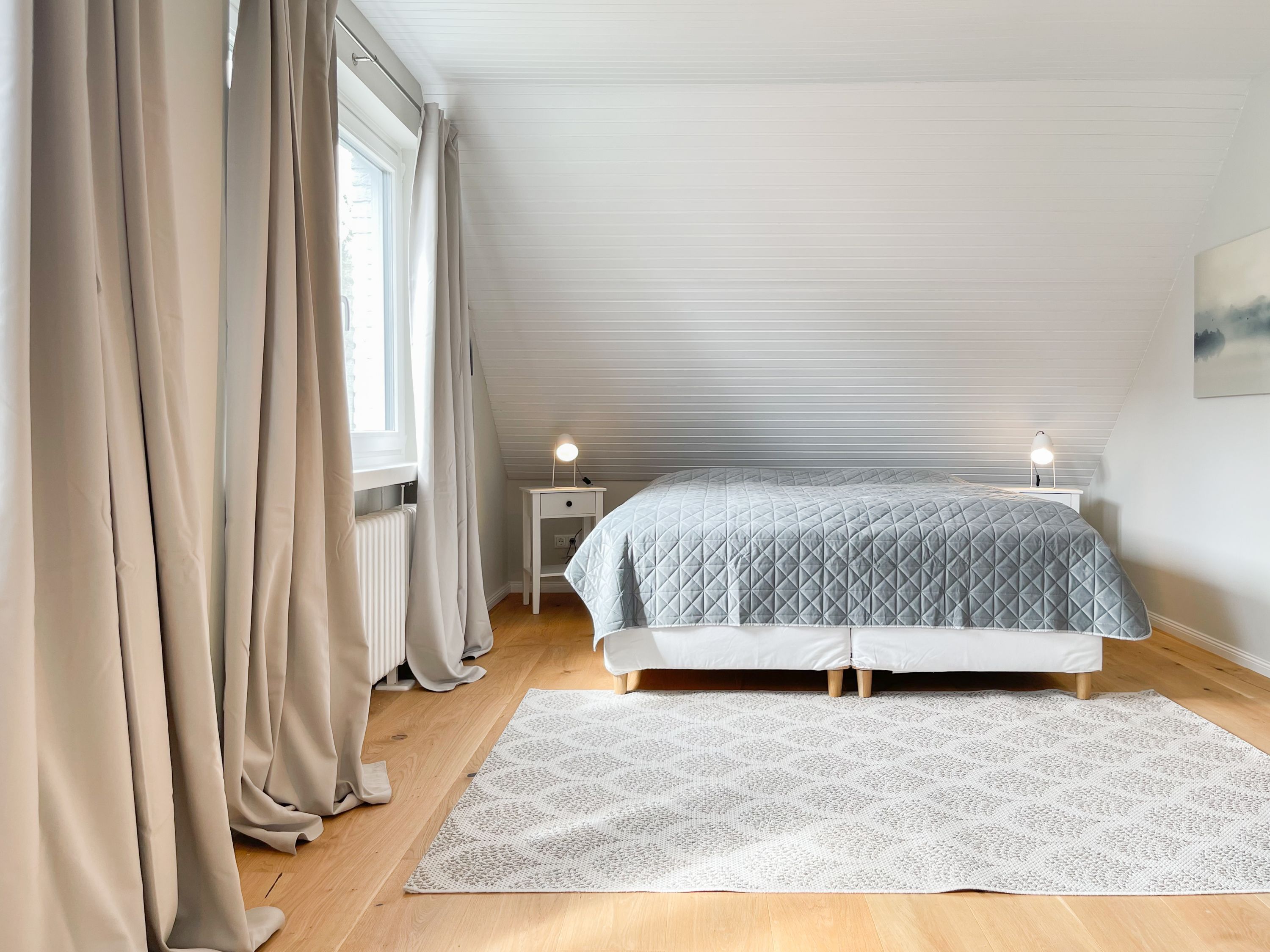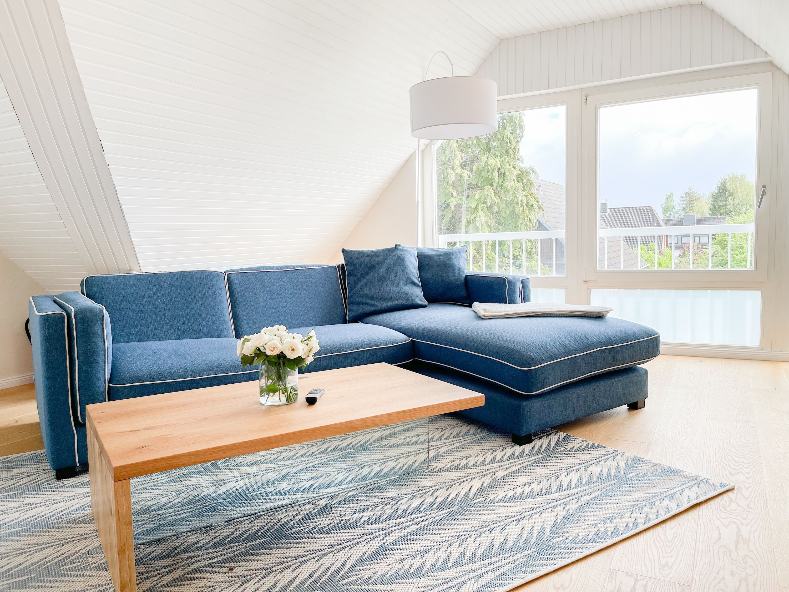 Es erwarten Sie großzügige, sonnige Räumlichkeiten zum wohlfühlen, aufwendig renoviert und geschmackvoll eingerichtet. Mittelpunkt bildet der lichtdurchflutete Wohnbereich, der mit einer XL Sofalandschaft und Smart TV ausgestattet ist. Die integrierte Wohnküche ist bestens ausgestattet und lädt zum gemeinsamen Kochen ein und der anschießende Essbereich ist für 4 Personen eingerichtet. Vom Wohnbereich gelangt man ins erste Schlafzimmer, das mit einem Doppelbett (140x200) ausgestattet ist und über ein modernes Duschbad ensuite verfügt, in dem auch ein kombinierter Waschtrockner untergebracht ist. Das zweite großzügig angelegte Schlafzimmer ist mit einem Doppelbett, Smart TV, Schreibtisch und einer gemütlichen Leseecke eingerichtet. Das moderne Duschbad mit reichlich Tageslicht befindet sich direkt neben dem Schlafzimmer. Es steht ein weiterer Raum mit einem Schreibtisch und einem Schlafsessel zur Verfügung, das bestens als Home Office genutzt werden kann. Zur Wohnung gehört eine eigene Terrasse in Südwestausrichtung, die mit Gartenmöbeln ausgestattet ist. Sie liegt auf der gegenüberliegenden Seite des Hauseinganges, d.h. es besteht keine direkte Verbindung zur Wohnung. 1 Außenstellplatz befindet sich auf dem Grundstück. Fahrräder können sicher und trocken im Holzhaus auf dem Grundstück untergestellt werden.