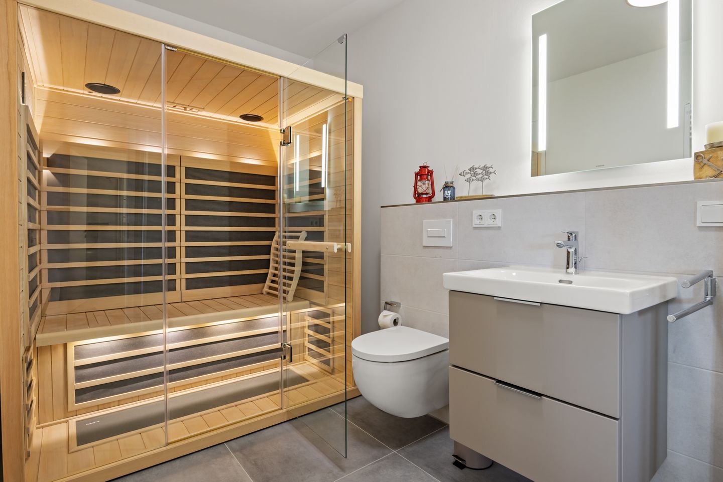 Beide stilvollen Badezimmer beinhalten jeweils eine ebenerdige Dusche, Waschtisch, Föhn und Handtuchheizkörper. Ein weiteres Highlight des Apartments: Im größeren Badezimmer steht euch eine Infrarotkabine zur Verfügung! Hier lässt sich wundervoll entspannen. Das Apartment verfügt über Verdunklungsplissees in allen Räumen.