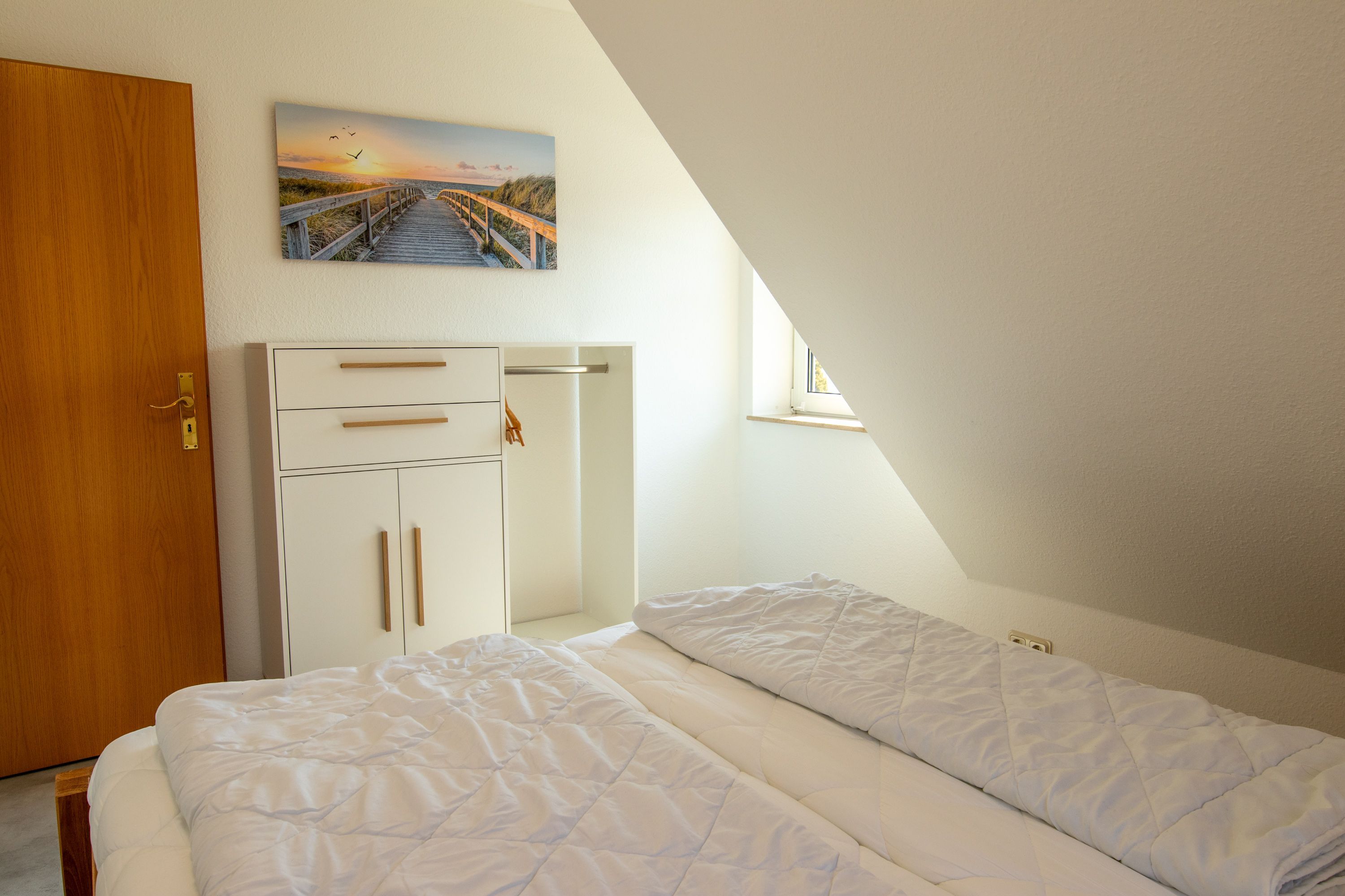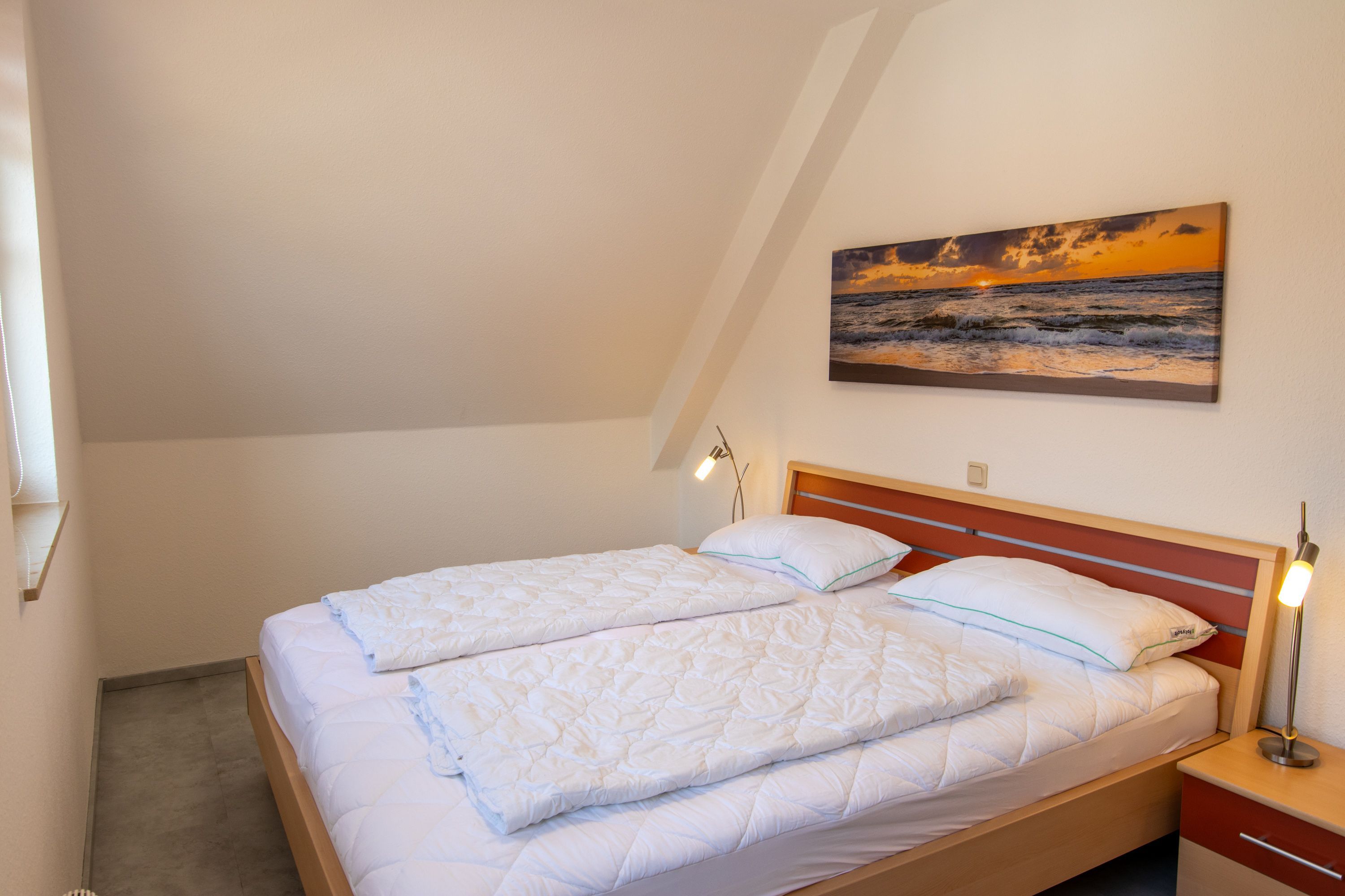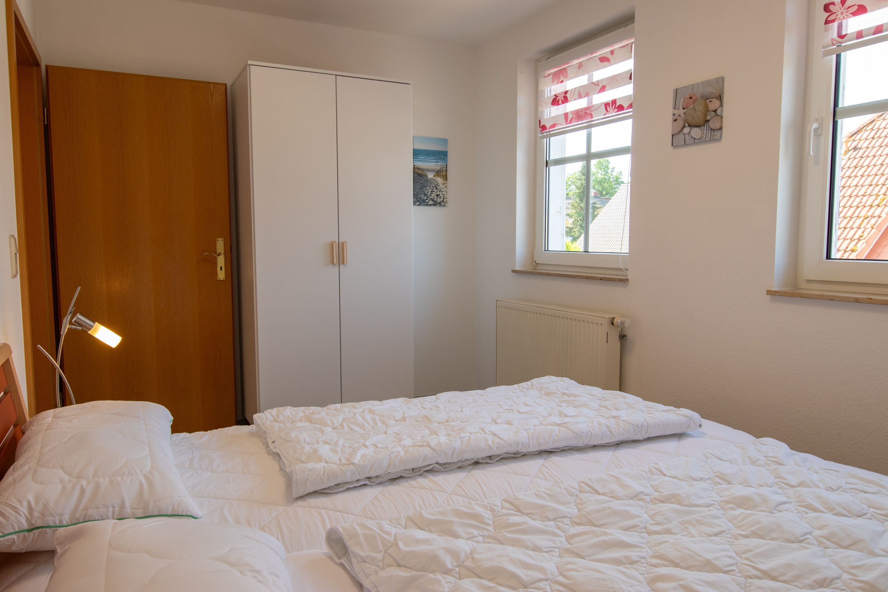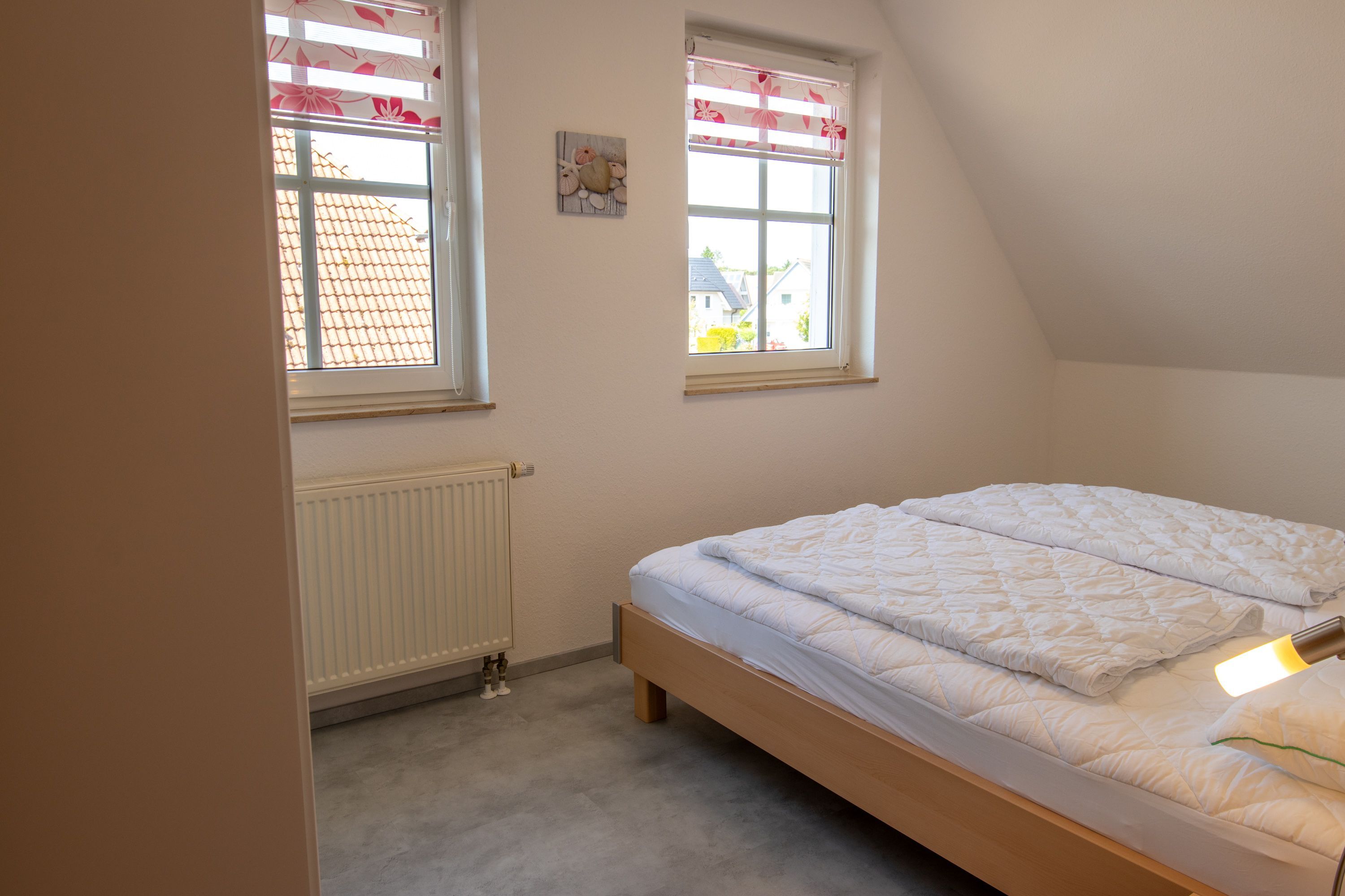 Die Ferienwohnung besticht mit ihrem maritimen Charakter und den 2 Etagen für 4 Personen. Im Erdgeschoss befinden sich das Wohnzimmer und das Bad mit WC und ebenerdiger Dusche. Die offen gestaltete Küche ist mit einem Backofen, Herd, Spülmaschine, Kühlschrank und Kochutensilien des täglichen Bedarf ausgestattet. Als Essbereich eignet sich sowohl der Esstisch im Wohnzimmer, als auch die Sitzmöglichkeiten auf der angrenzenden Terrasse. Dort gibt es des Weiteren die Möglichkeit den Grill für entspannte BBQ Abende zu nutzen. Die beiden separaten Schlafzimmer befinden sich im Obergeschoss des Hauses und sind jeweils mit einem Doppelbett (180x200) und einem Kleiderschrank oder einer Kommode ausgestattet.
