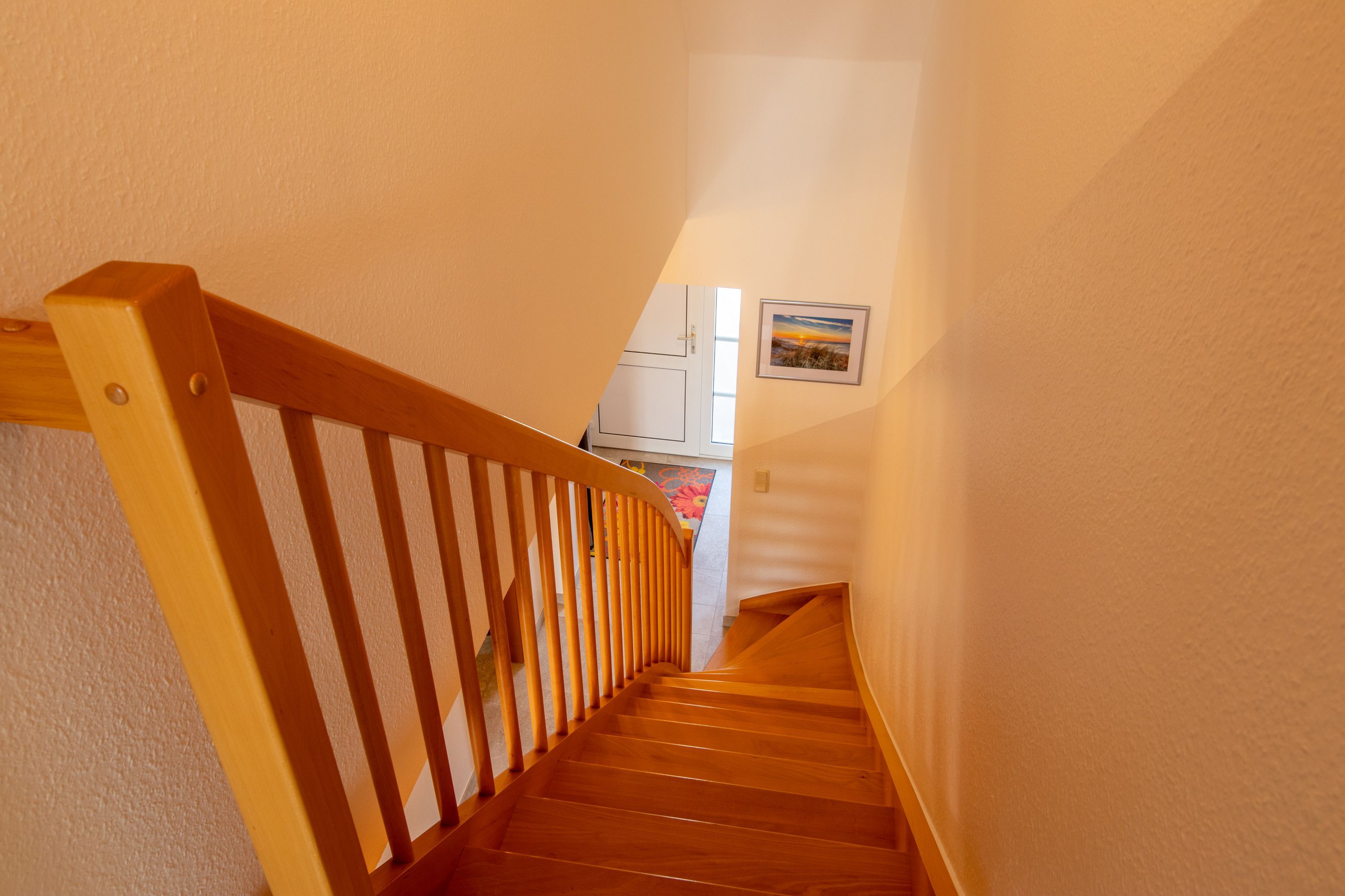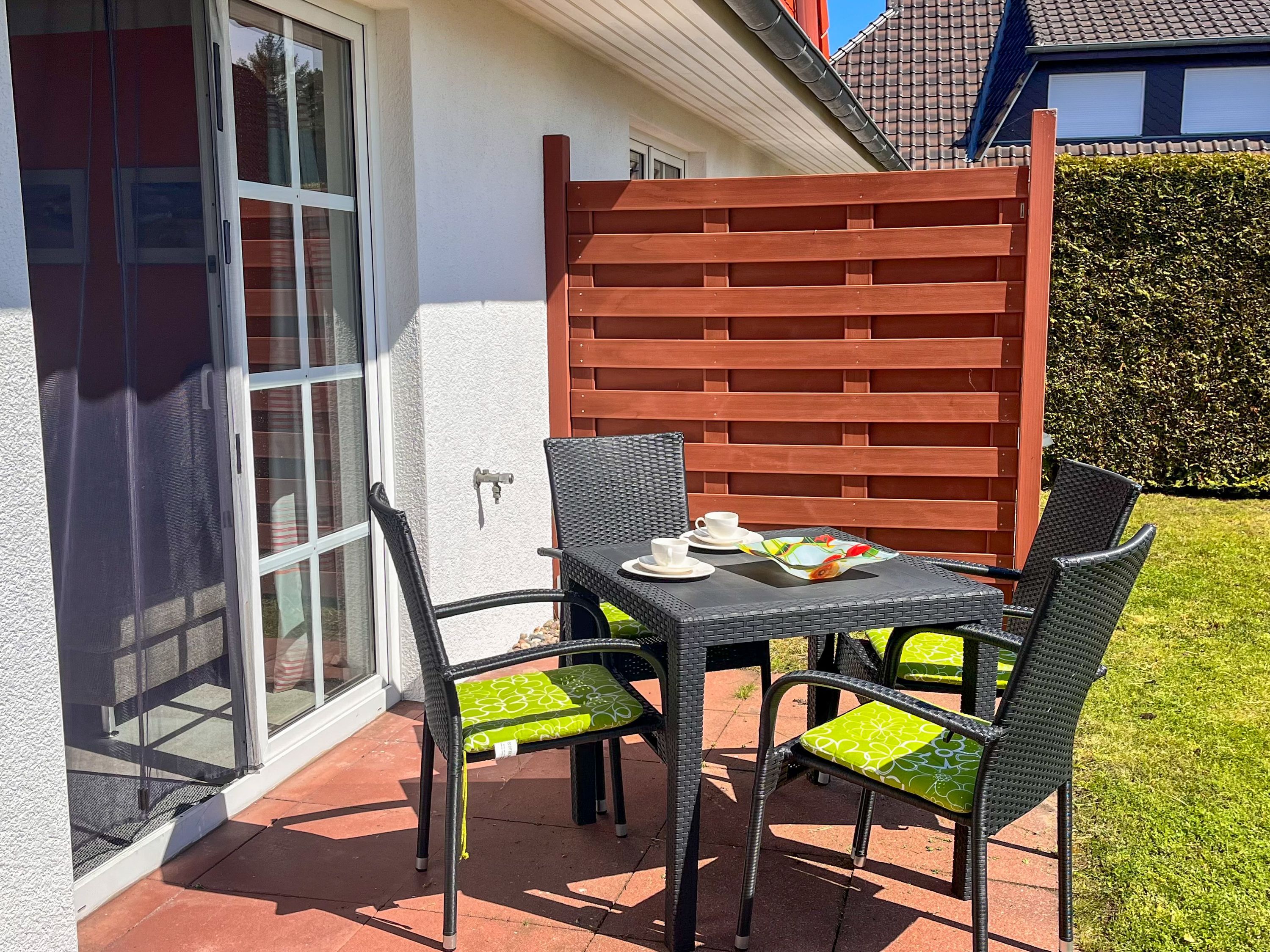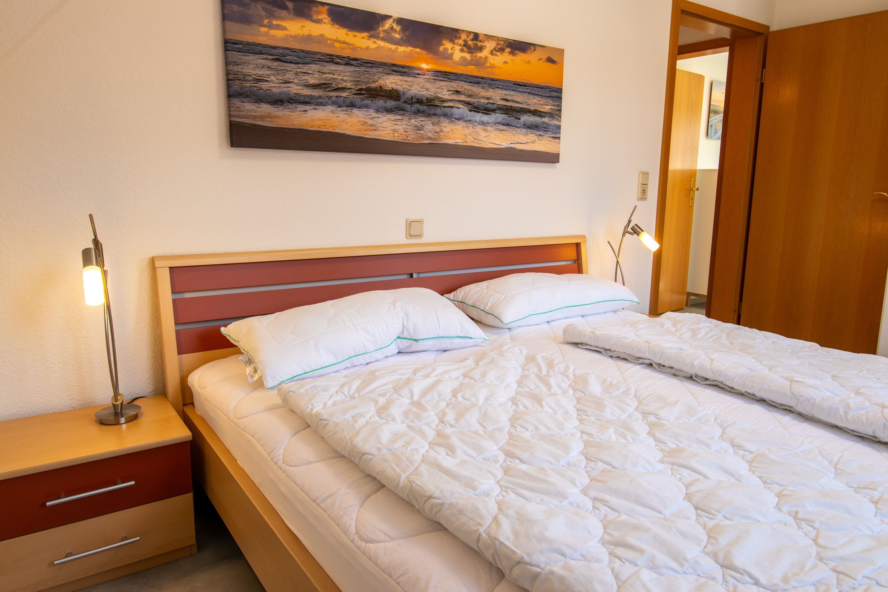 Die Ferienwohnung besticht mit ihrem maritimen Charakter und den 2 Etagen für 4 Personen. Im Erdgeschoss befinden sich das Wohnzimmer und das Bad mit WC und ebenerdiger Dusche. Die offen gestaltete Küche ist mit einem Backofen, Herd, Spülmaschine, Kühlschrank und Kochutensilien des täglichen Bedarf ausgestattet. Als Essbereich eignet sich sowohl der Esstisch im Wohnzimmer, als auch die Sitzmöglichkeiten auf der angrenzenden Terrasse. Dort gibt es des Weiteren die Möglichkeit den Grill für entspannte BBQ Abende zu nutzen. Die beiden separaten Schlafzimmer befinden sich im Obergeschoss des Hauses und sind jeweils mit einem Doppelbett (180x200) und einem Kleiderschrank oder einer Kommode ausgestattet.