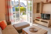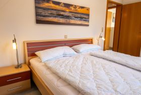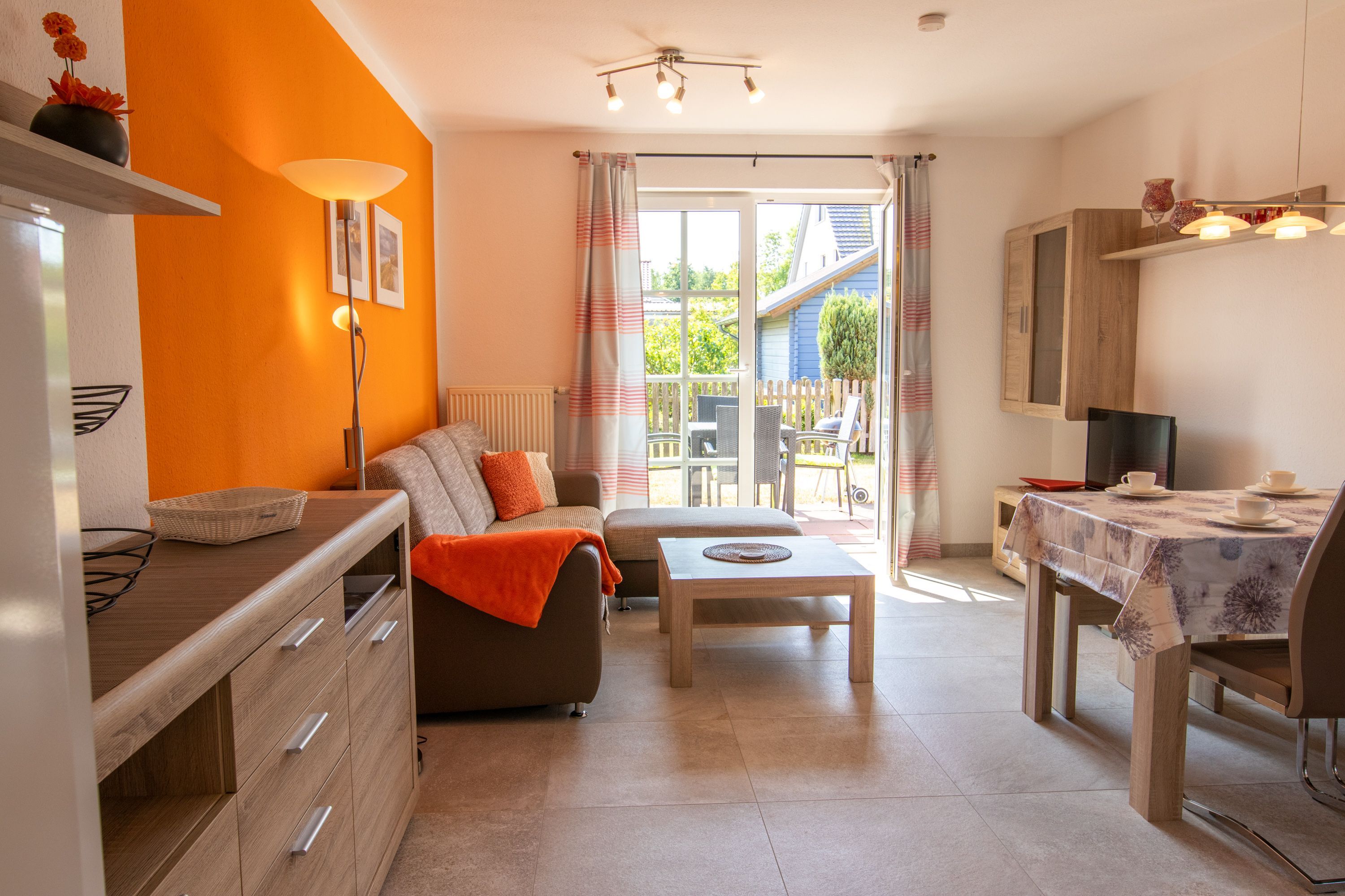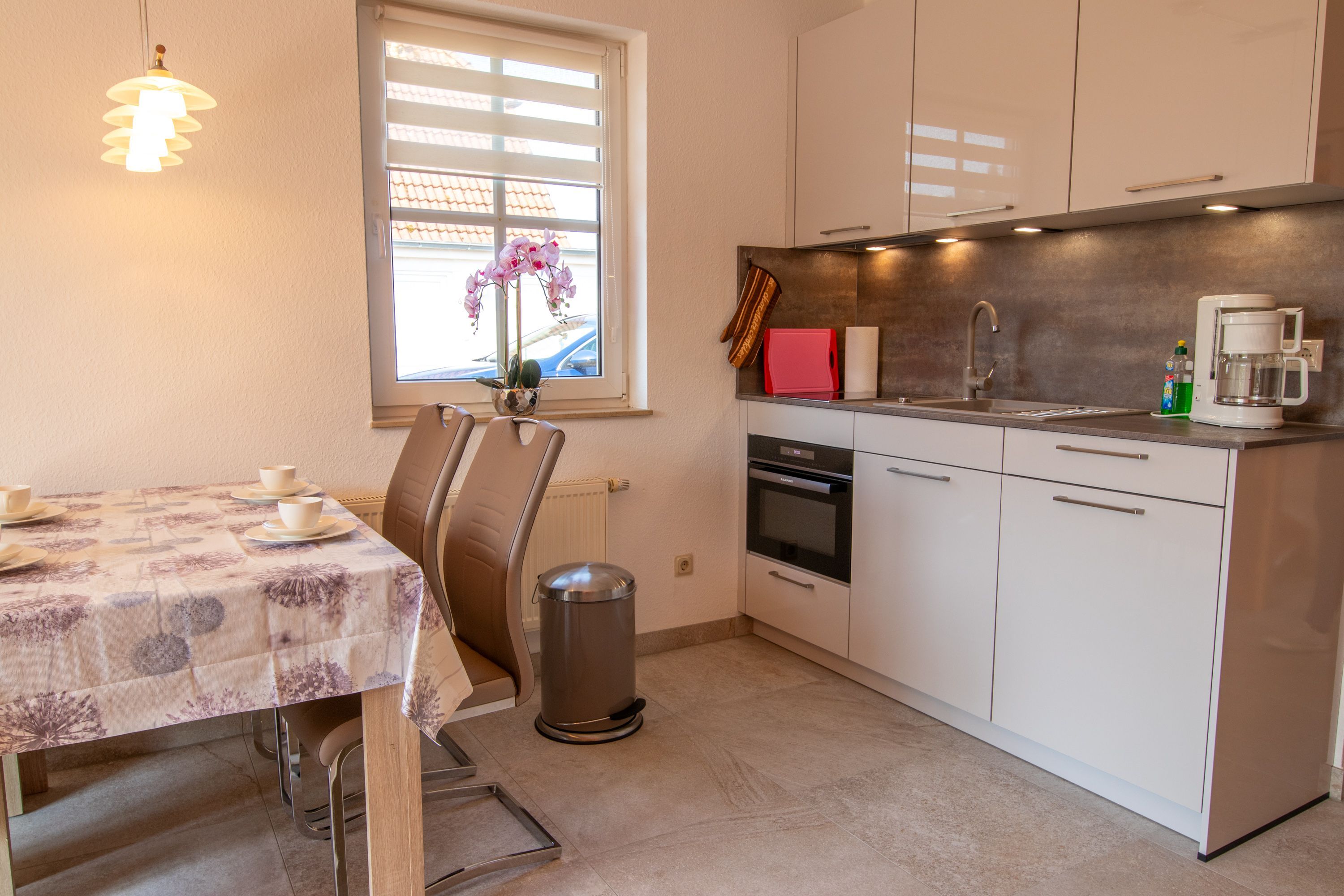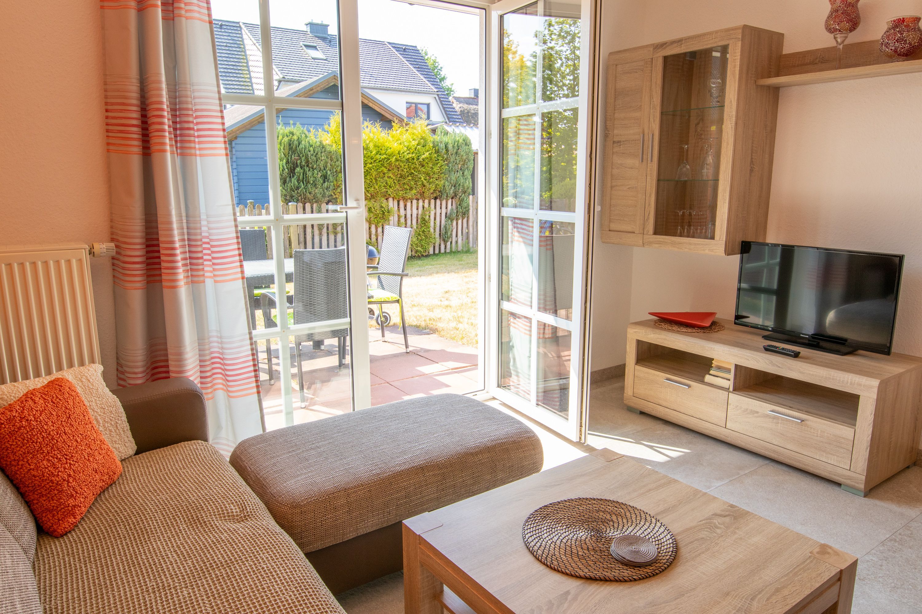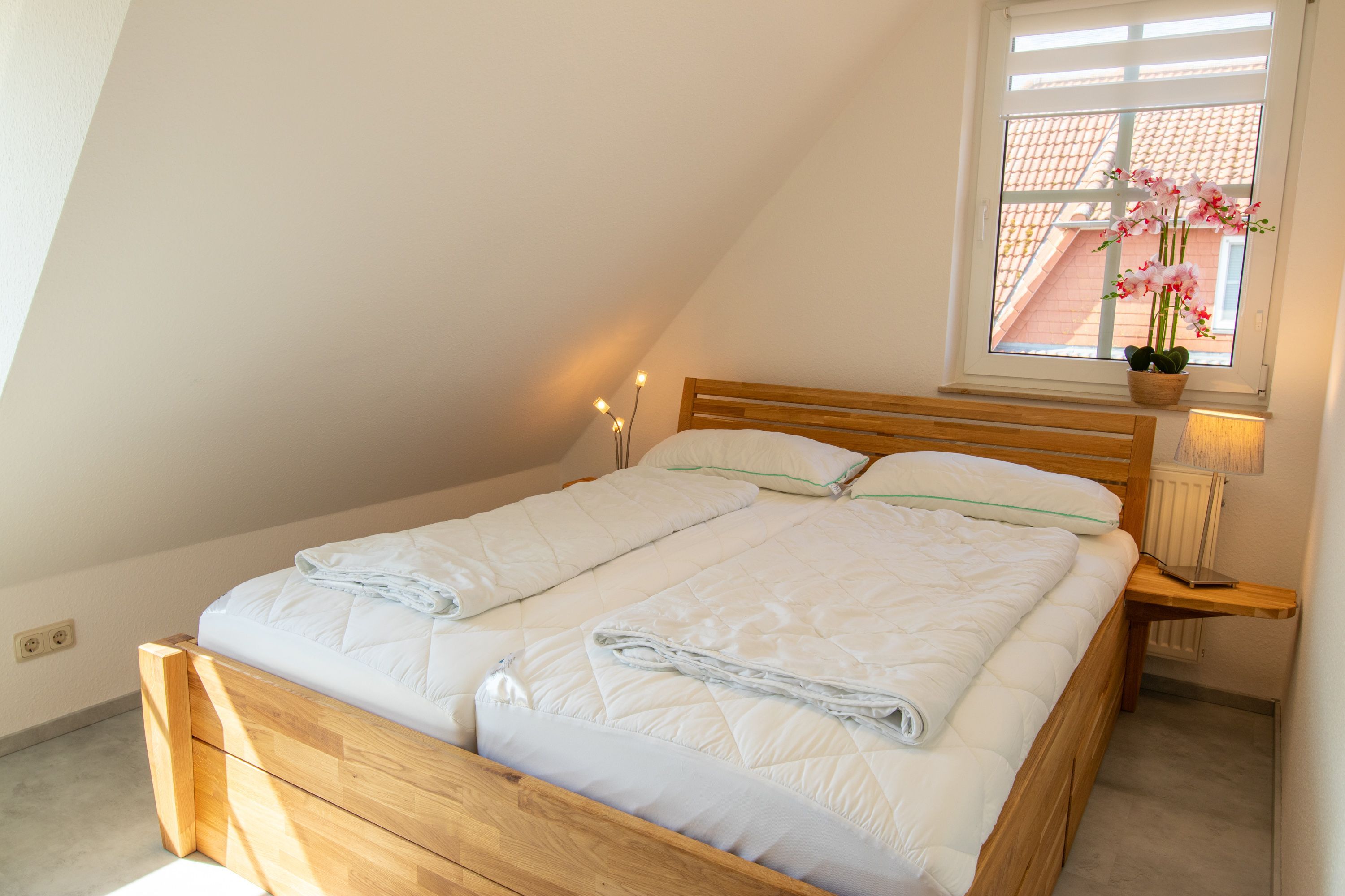 Die Ferienwohnung besticht mit ihrem maritimen Charakter und den 2 Etagen für 4 Personen. Im Erdgeschoss befinden sich das Wohnzimmer und das Bad mit WC und ebenerdiger Dusche. Die offen gestaltete Küche ist mit einem Backofen, Herd, Spülmaschine, Kühlschrank und Kochutensilien des täglichen Bedarf ausgestattet. Als Essbereich eignet sich sowohl der Esstisch im Wohnzimmer, als auch die Sitzmöglichkeiten auf der angrenzenden Terrasse. Dort gibt es des Weiteren die Möglichkeit den Grill für entspannte BBQ Abende zu nutzen. Die beiden separaten Schlafzimmer befinden sich im Obergeschoss des Hauses und sind jeweils mit einem Doppelbett (180x200) und einem Kleiderschrank oder einer Kommode ausgestattet.