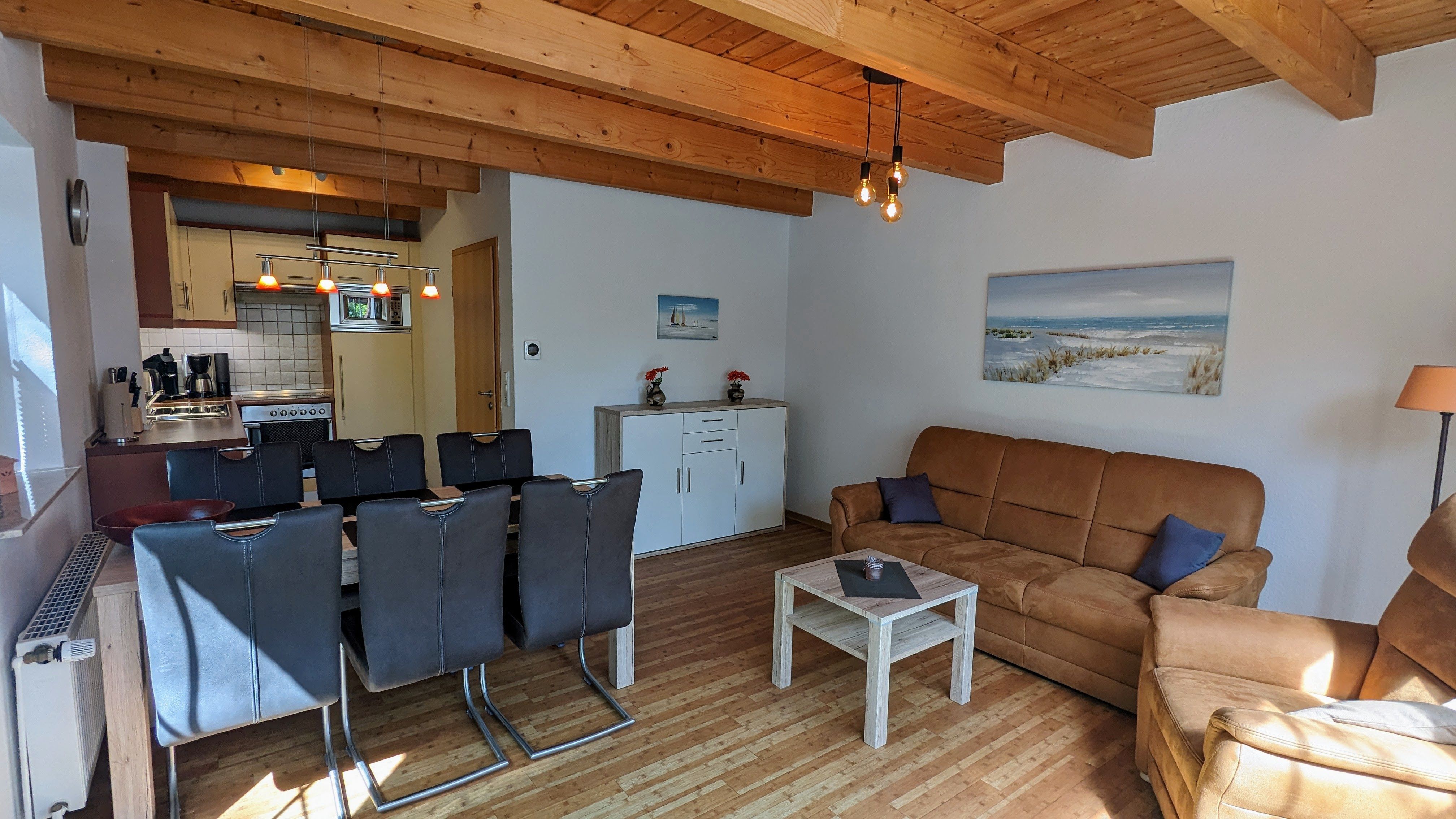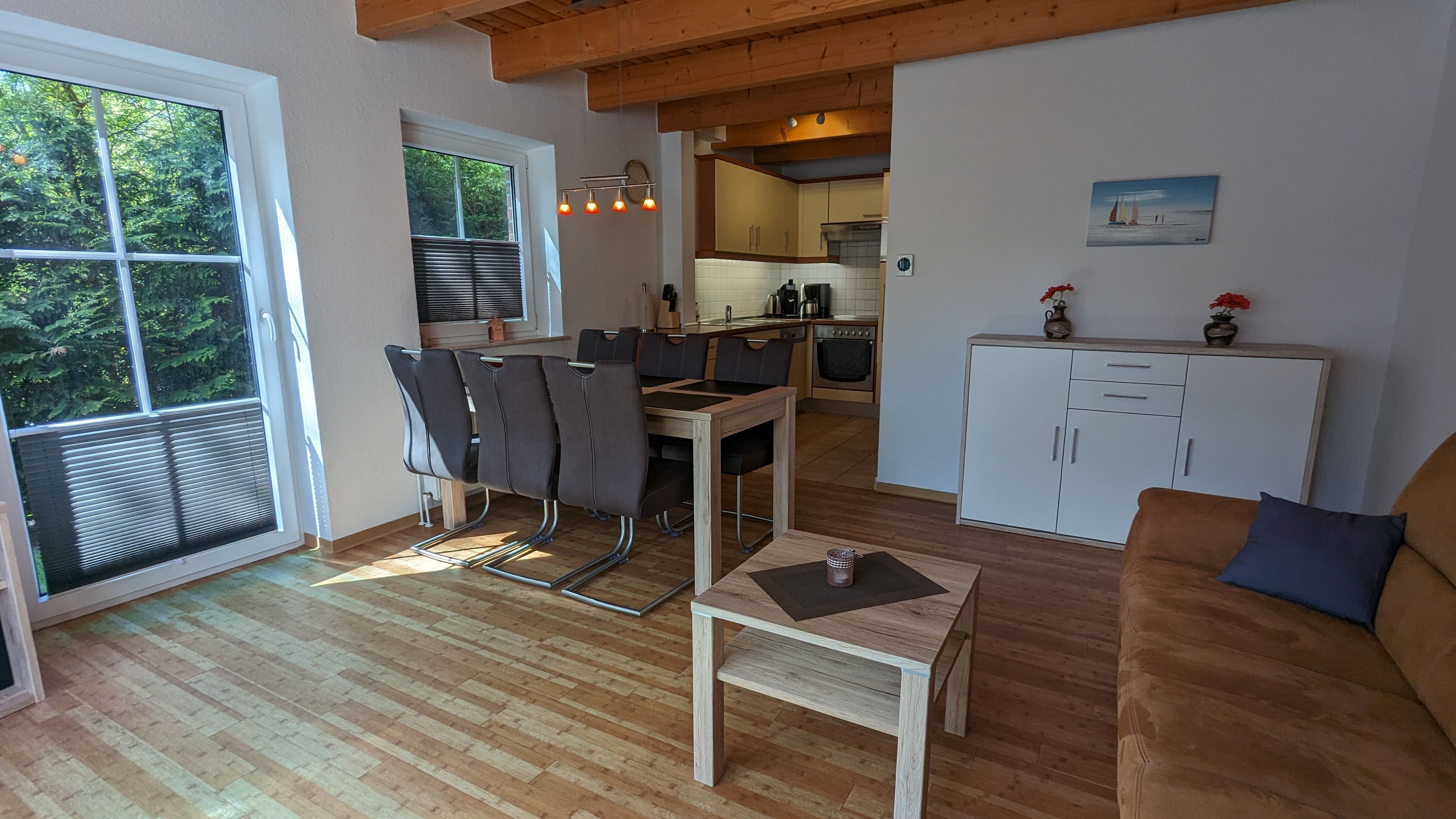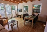 Der großzügige Wohnraum mit großen Fensterelementen ist farblich ansprechend aufeinander abgestimmt. Eine Couch sowie Sessel laden zum Lesen (kleine Bibliothek ist vorhanden), Kuscheln oder Fernsehen ein. Selbstverständlich haben Sie auch von dem separaten Essplatz aus einen sehr guten Blick auf den großen SAT-LCD-TV mit DVD-/Blu-ray-Player. Eine Musikanlage und diverse Spiele stehen für Sie zur Verfügung. Die offene Einbauküche mit allem Komfort (Geschirrspüler, Mikrowelle, Backofen, Ceranfeld, Kaffeemaschine, Senseo Maschine, Toaster, Wasserkocher, Handmixer) fügt sich harmonisch in den Wohnbereich ein. Geschmackvolle Dekorationen und Bilder runden die Einrichtung für Ihre Behaglichkeit ab.