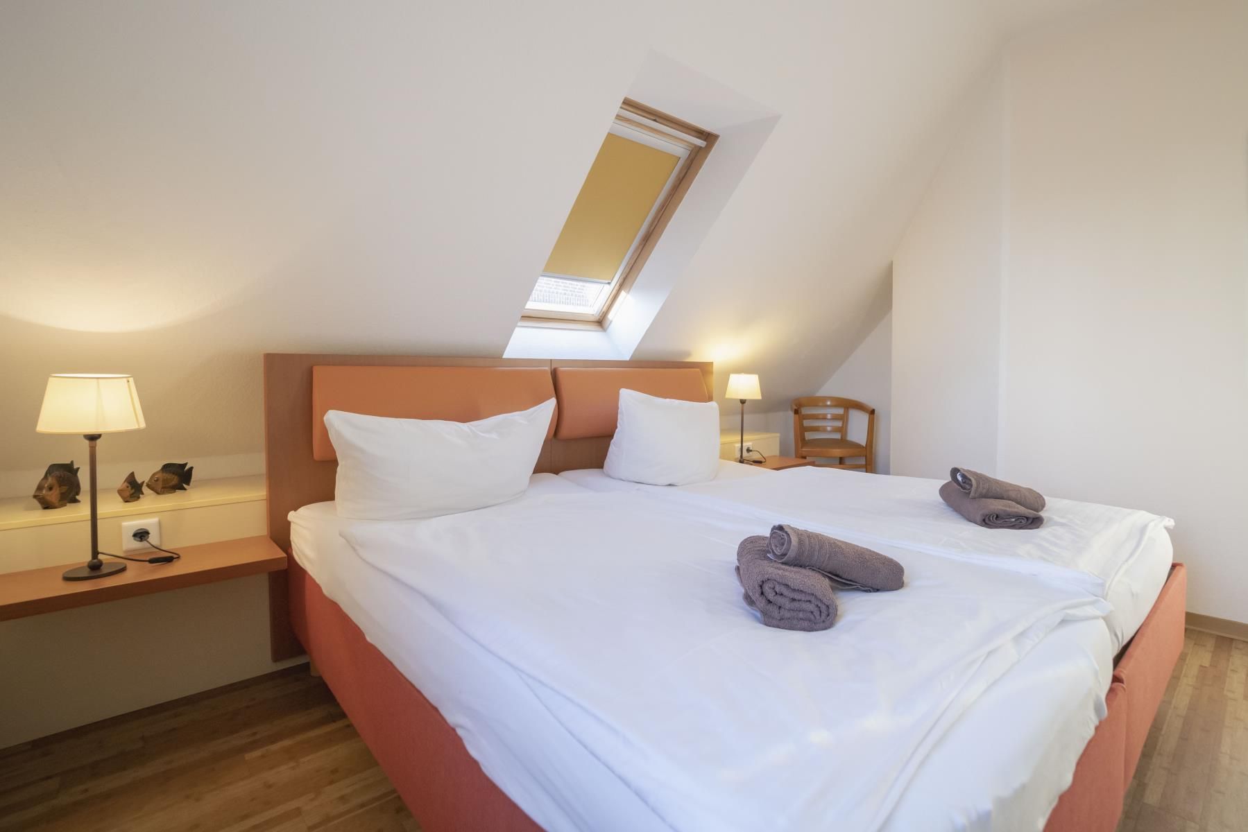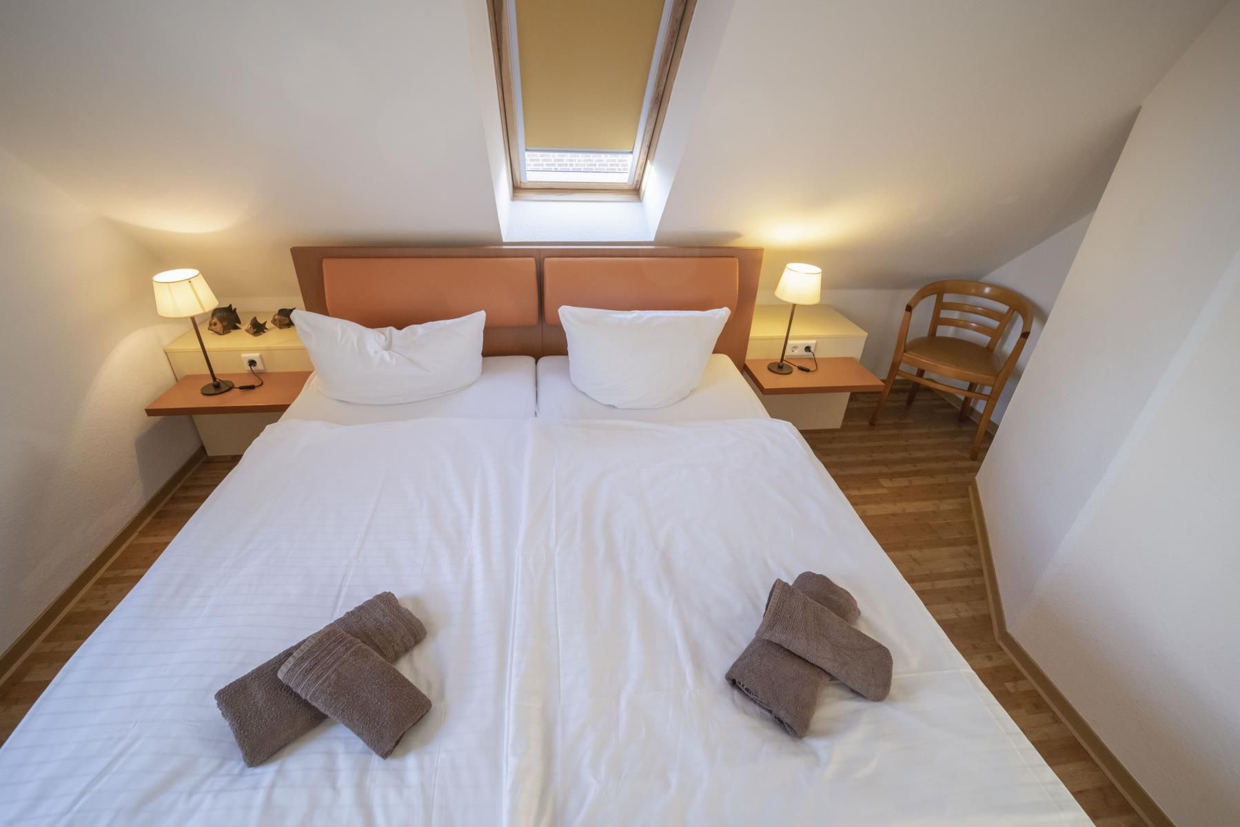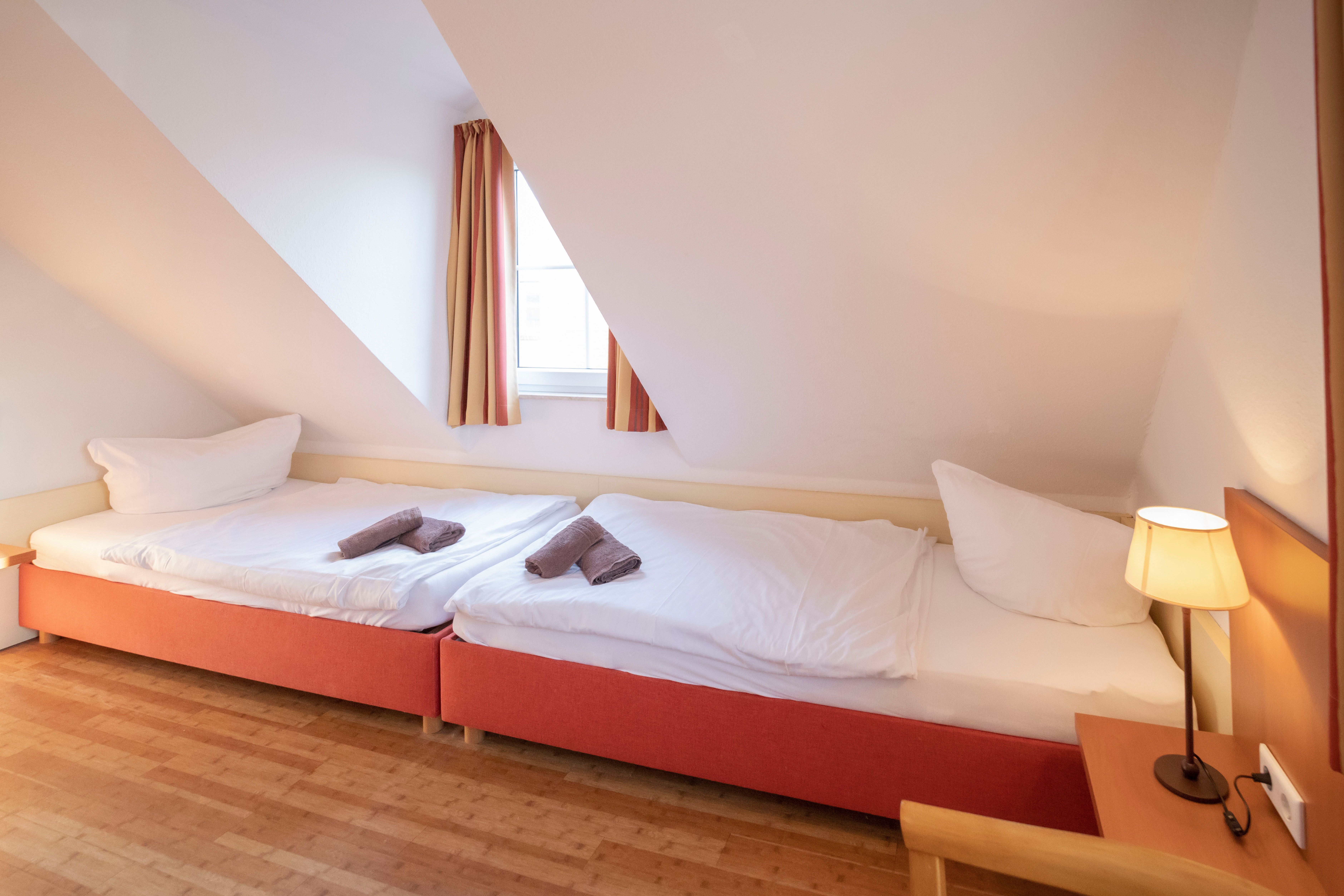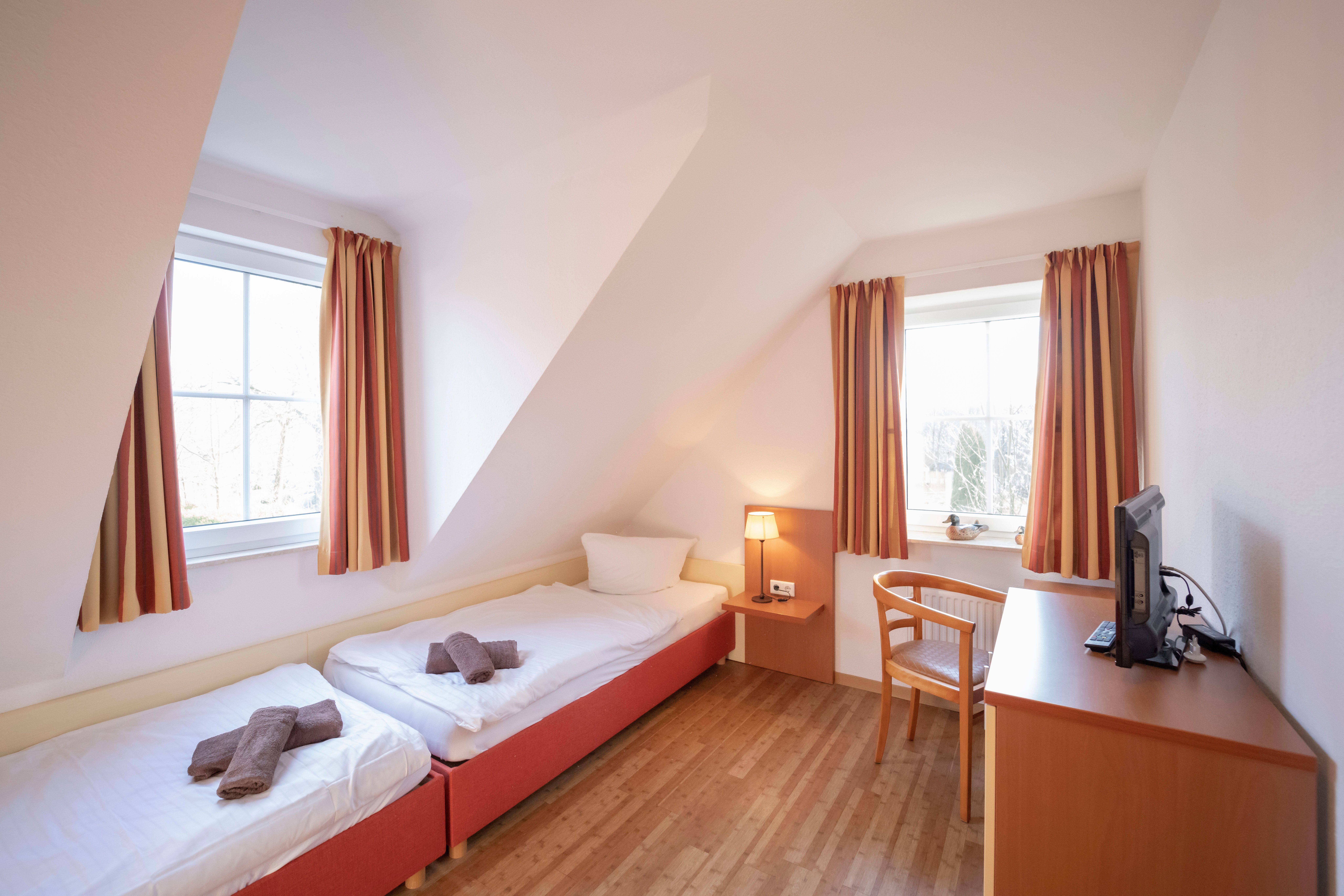 Schlafraum mit zwei Einzelbetten (auch als Doppelbett möglich) und Kommode.