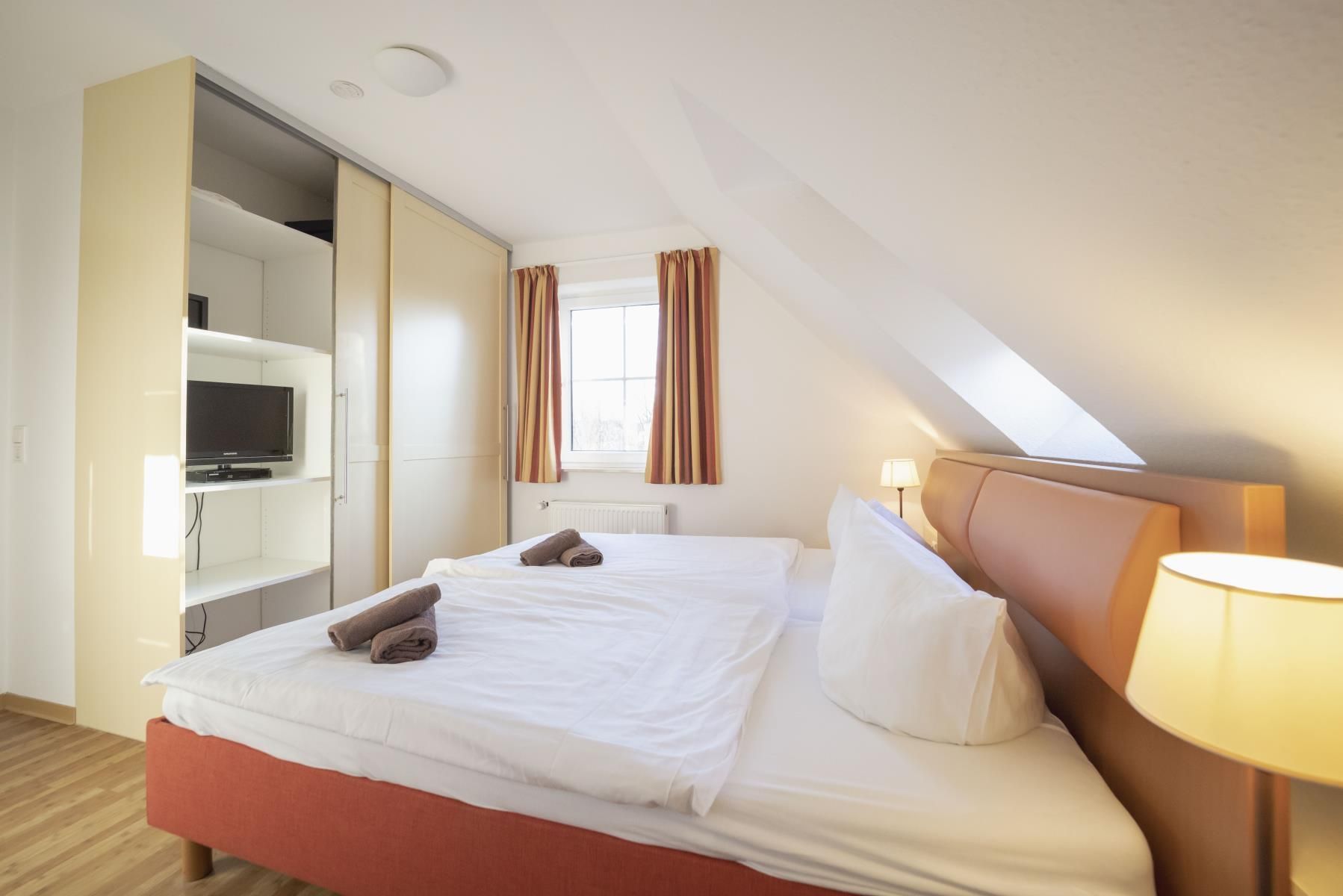 Zwei Schlafräume mit großen Kleiderschränken und zusätzlichen Fernsehern (eins mit Doppelbett und Safe, eins mit zwei Einzelbetten und Schreibtisch mit Sitzgelegenheit).