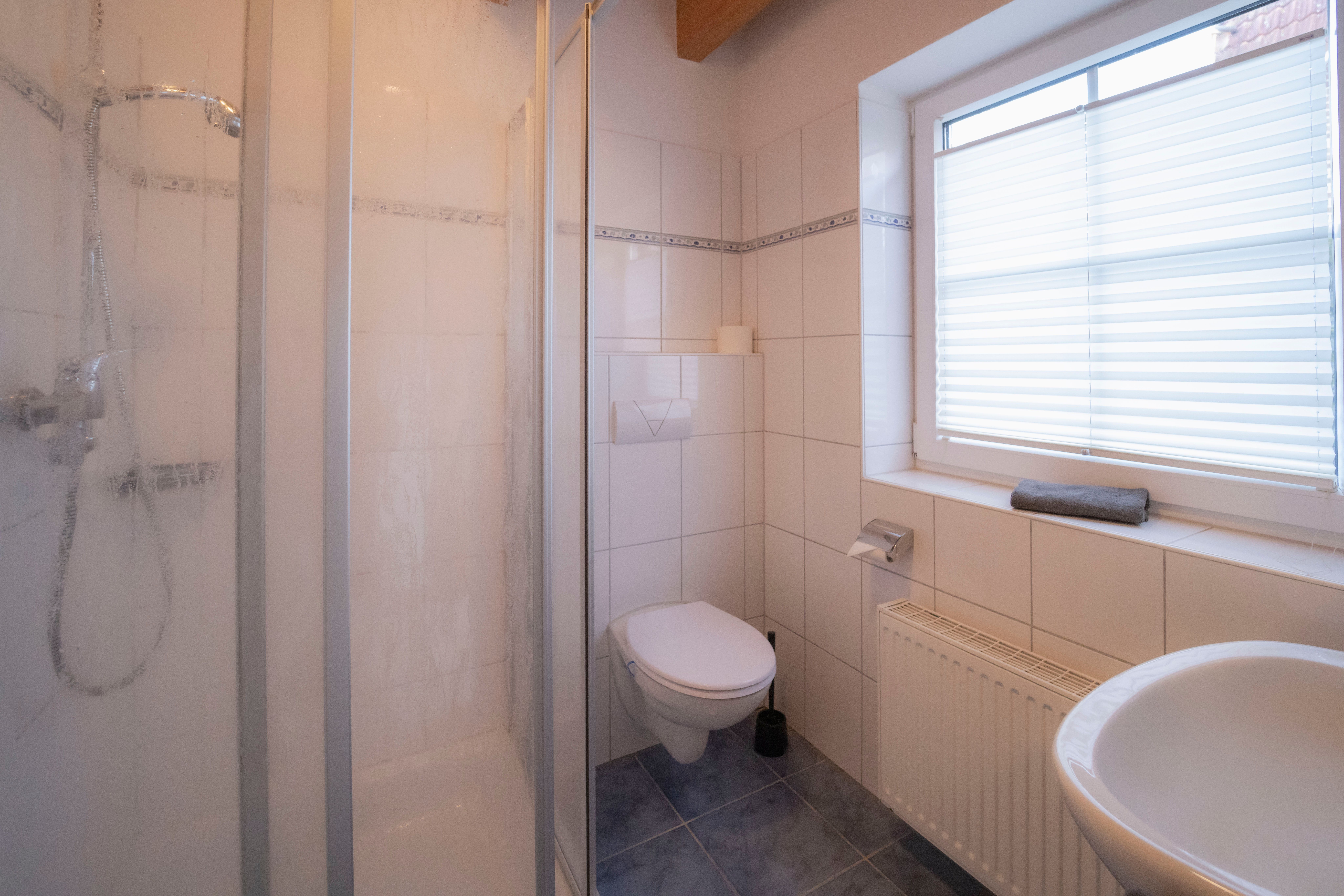 Helles Bad mit Fenster und Dusche.