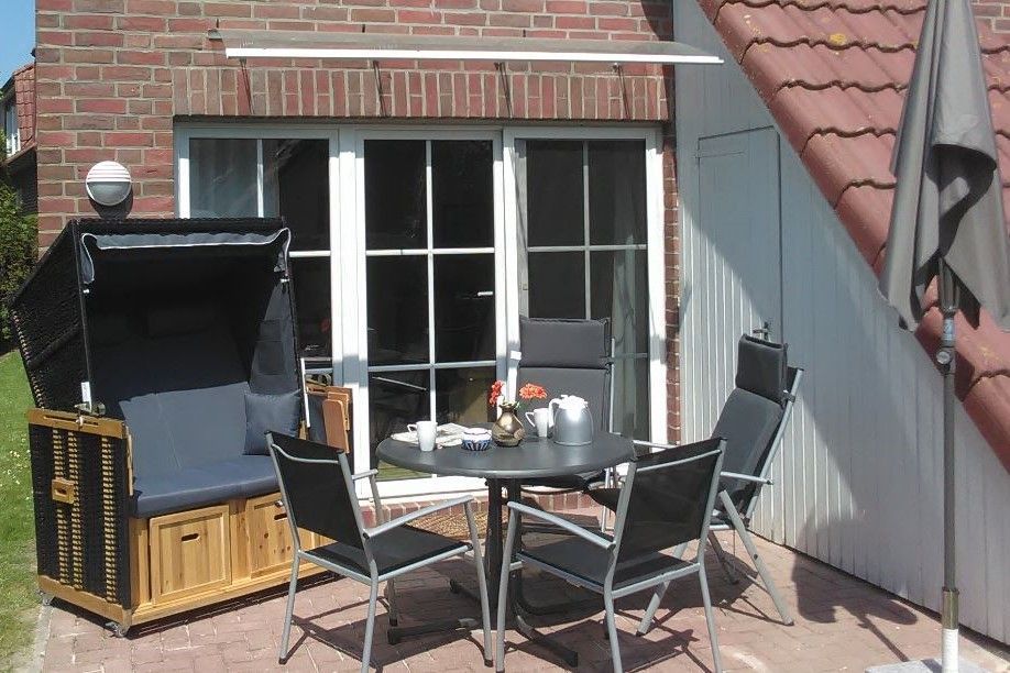 Sonnige Terrasse mit Gartenmöbel, Strandkorb und Sonnenschirm.
