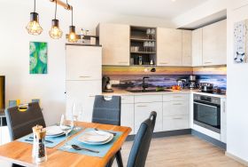 Auf einer Wohnfläche von 65 m² finden drei Erwachsene und ein Kleinkind bis zwei Jahre (im Babybett) in dieser modern eingerichteten Ferienwohnung ausreichend Platz für einen entspannten Urlaub am Stettiner Haff auf Usedom.