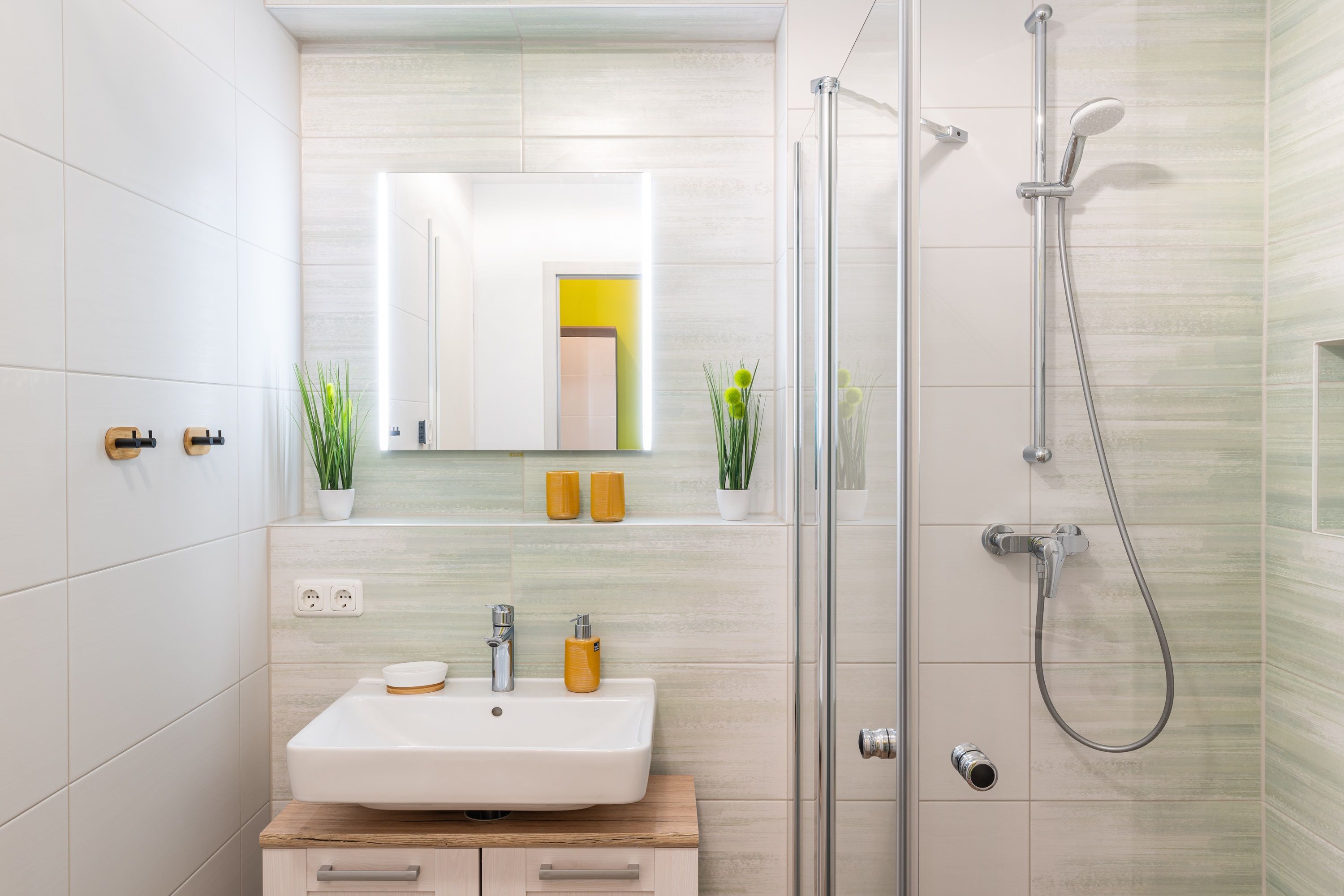 Das vollausgestattete Badezimmer verfügt über eine ebenerdige Dusche, WC, Waschtischanlage sowie Fön.