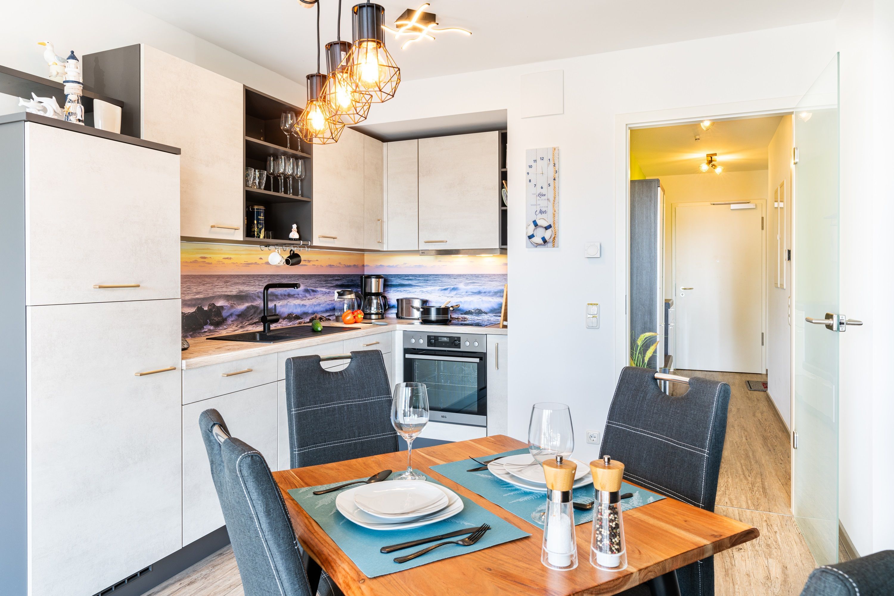 Die Küchenzeile verfügt über hochwertige Geräte wie Herd, Kaffeepadmaschine, Mikrowelle, Backofen, Kaffeefiltermaschine, Kühlschrank mit Gefrierfach sowie Spülmaschine. Ausreichend Geschirr, Besteck sowie Töpfe und Pfannen befinden sich in den Schränken. Am Esstisch finden Sie vor einem erholsamen Urlaubstag zu einem gemeinsamen Frühstück zusammen.