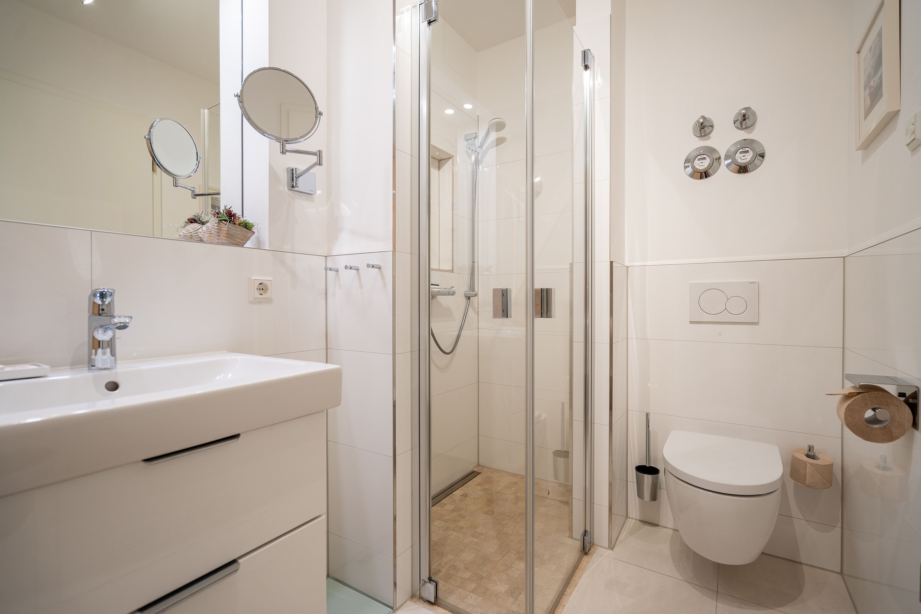 Nur 50m vom Strand entfernt und in einer kleinen Nebenstraße gelegen, empfängt Sie unser neues Domizil Quartier am Strand. Als zweites Objekt am Platz direkt an der schönen Strandpromenade gelegen, fügt sich die Anlage stilvoll zwischen Bäderstilvillen und Strandumgebung ein. Die insgesamt 9 Appartements und 2 Penthouses verfügen über helle und modern eingerichtete 2 bis 3 Zimmer. An kühleren Tagen sorgen Saunen und Kamin, die zu jedem Appartement gehören, für Entspannung in Ihrem Urlaub. Dem Klang der Wellen können Sie bequem von den Terrassen, Balkonen und Dachterrassen aus zuhören, denn jedes Appartement besitzt einen separaten Außenbereich. Der Blick auf die Ostsee ist Ihnen aus einigen Appartements möglich, aus den Penthouses garantiert. Offene Wohnbereiche und voll ausgestattete Küchen komplettieren das neue Objekt Quartier am Strand. Zudem gibt es eine hauseigene Tiefgarage (Einfahrthöhe 2,05 m) sowie einen Außenstellplatz (für Appartement 3), so dass ein eigener PKW-Stellplatz garantiert ist. Zu den weiteren Annehmlichkeiten des Objektes zählt ein Fahrstuhl, der Sie von der Tiefgarage bequem bis in die Etage Ihres Urlaubsdomizils leitet. Kostenfreies W-Lan rundet das Domizil ab. Wir wünschen Ihnen einen schönen Urlaub!