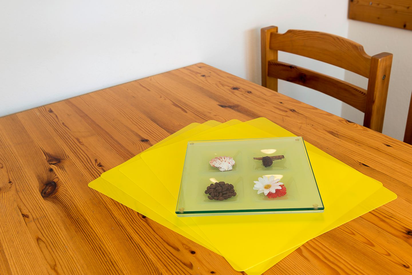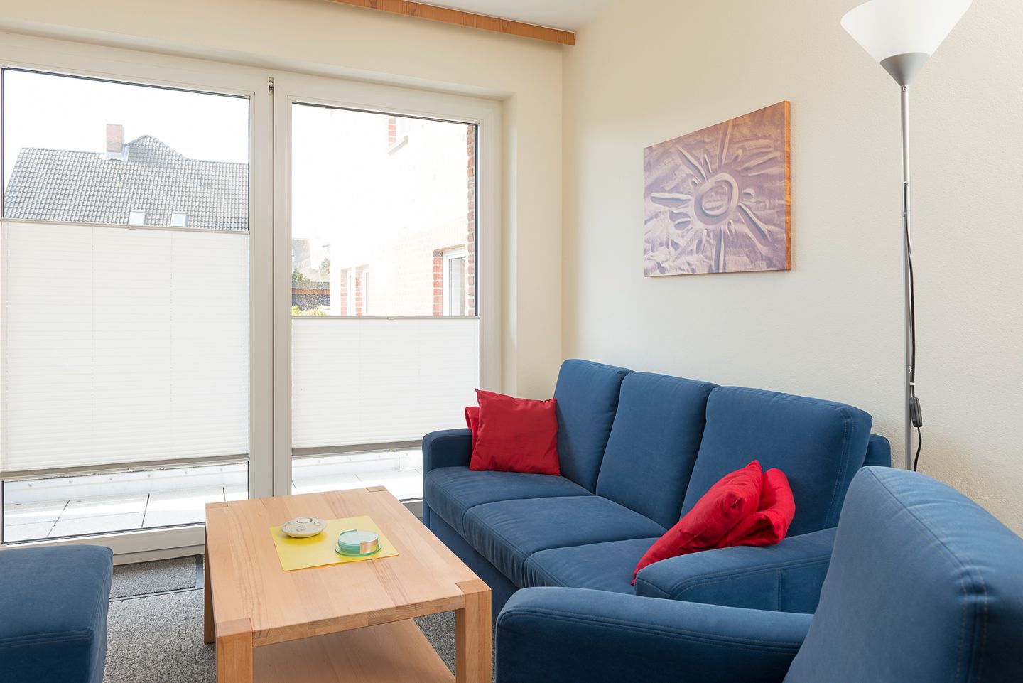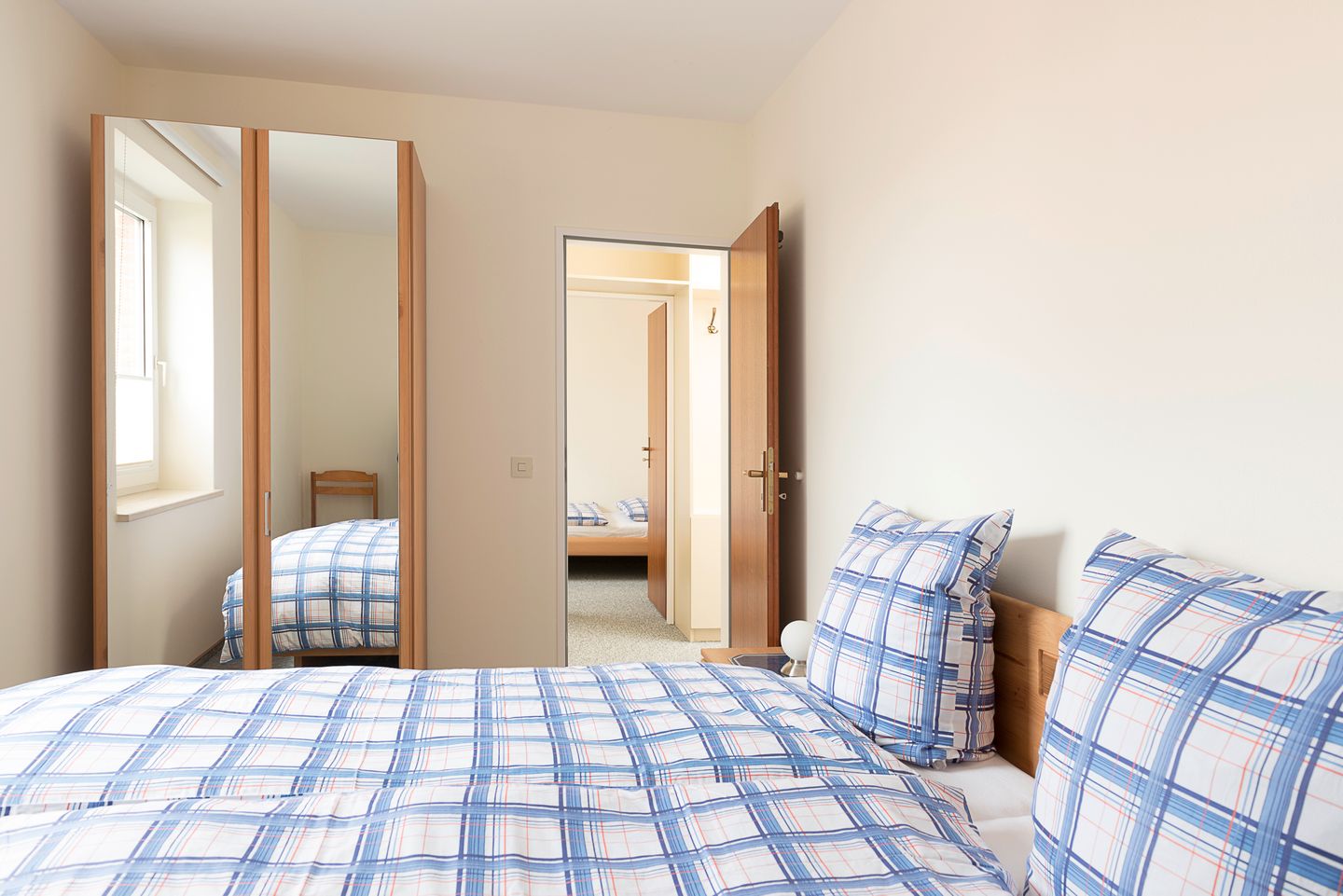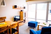 Die Wohnung ist über wenige Stufen zu erreichen und besteht aus einem Wohn-/Esszimmer, 2 Schlafzimmern (eins mit Doppelbett, eins mit zwei Einzelbetten), einer separaten Küche und einem Duschbad. In der Wohnung gibt es eine Fußbodenheizung.