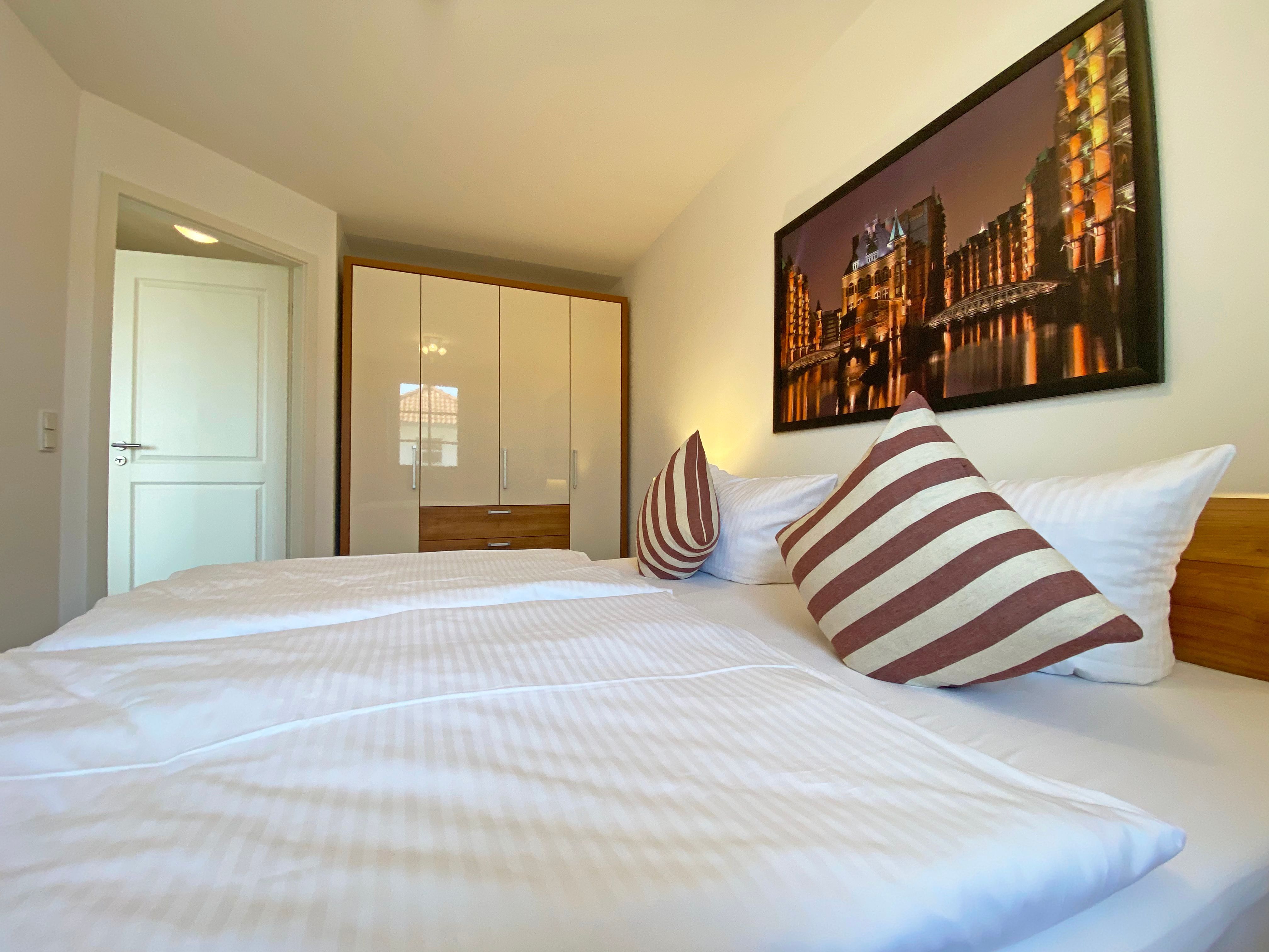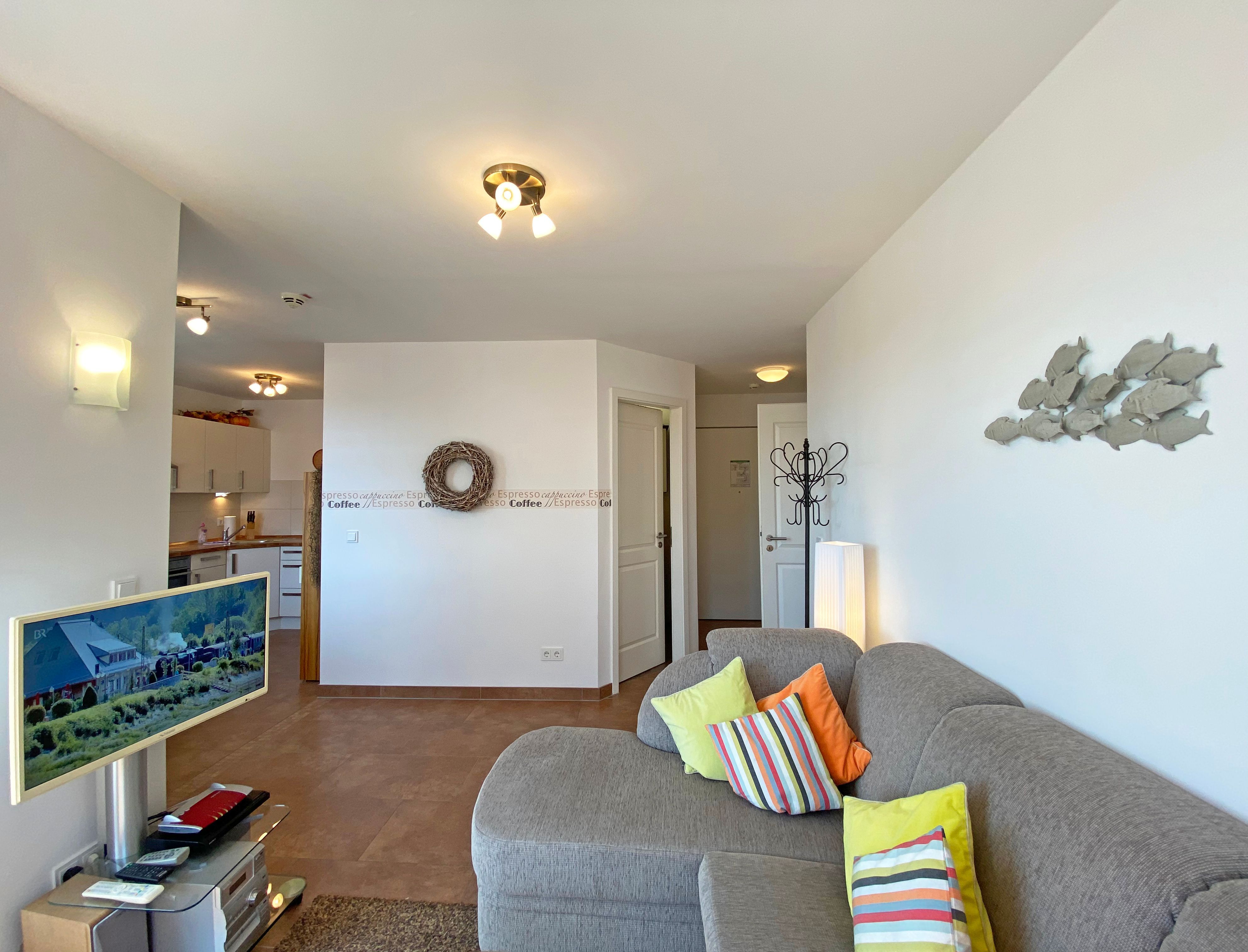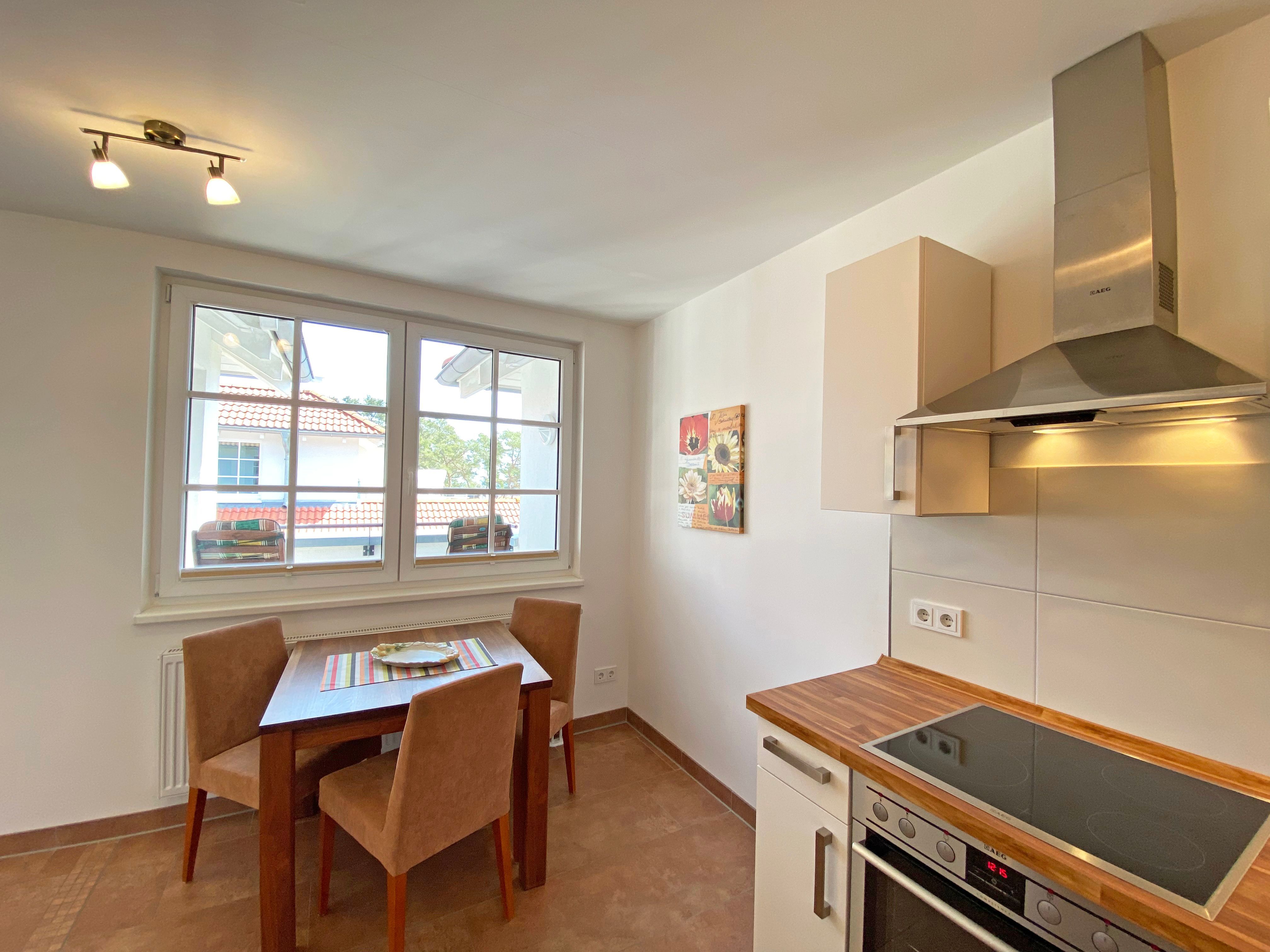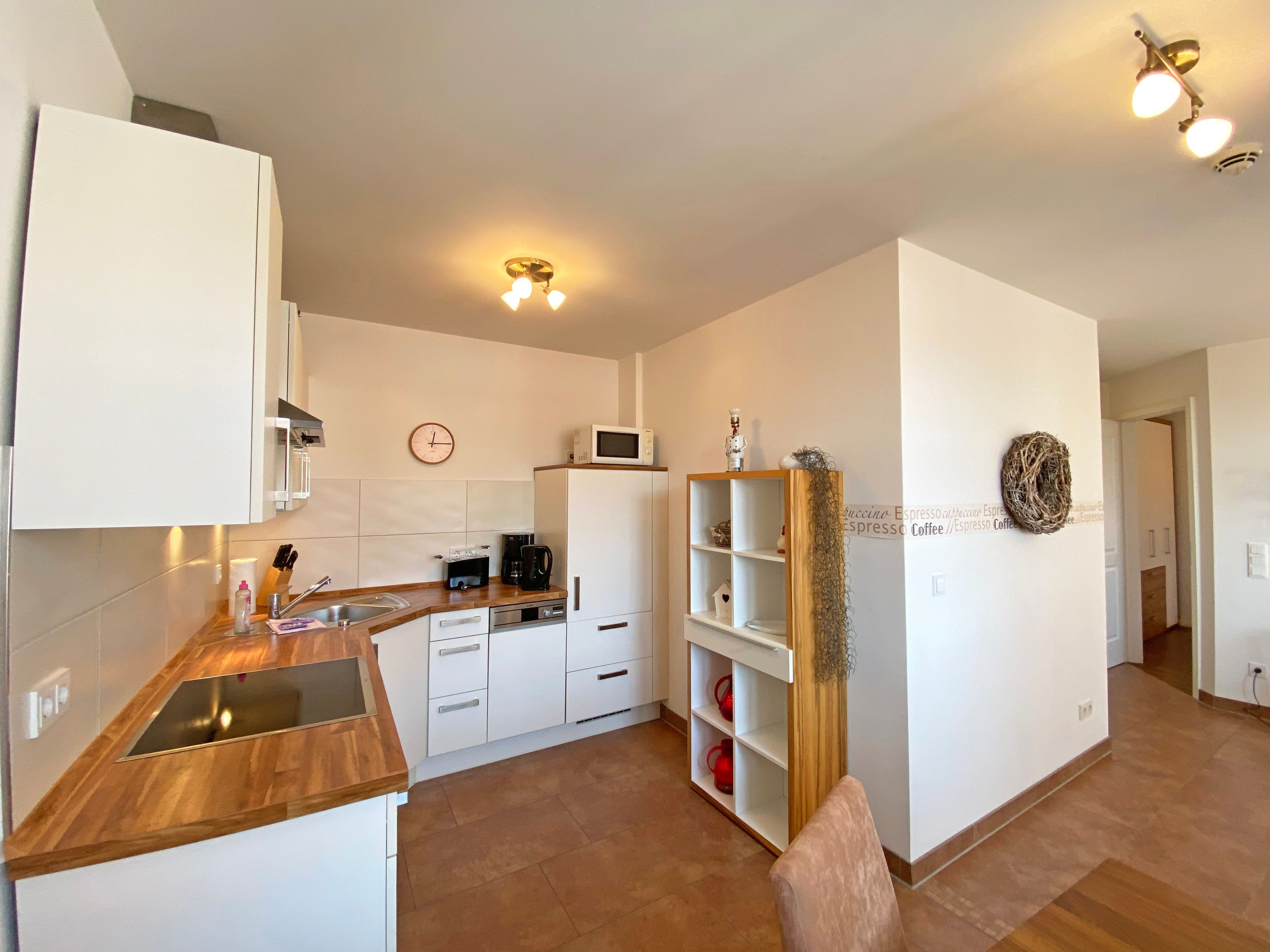 Unser geräumiges ca. 48 qm großes Nichtraucher-Appartement „Ostseekiesel“ befindet sich in der 3. Etage und ist für max. 2 Erwachsene + 1 Kleinkind bis 3 Jahre im Kinderreisebett geeignet. Sie finden hier einen kombinierten Wohn- und Essbereich mit offener Küchenzeile. Diese ist voll ausgestattet mit Cerankochfeld, Backofen, Spülmaschine, Kühl-/Gefrierkombination, Mikrowelle, eine Kaffeemaschine, eine Tassimo Kapselmaschine, ein Toaster, ein Wasserkocher sowie weiteren diversen Küchenutensilien. Der lichtdurchflutete und offene Wohnbereich mit seinen großen Fensterfronten bietet Ihnen eine gemütliche Eckcouch + Hocker, eine Leselampe, ein Regal mit Urlaubslektüre sowie Gesellschaftsspiele, ein TV-Board mit LED-TV, eine Musikanlage mit DAB-Radio von Teufel sowie einen WLAN-Anschluss, welcher für Sie inklusive ist. Von hier gelangen Sie auf den bestuhlten Balkon, welcher Richtung Südosten ausgerichtet ist. Im Schlafzimmer befindet sich ein Doppelbett (1,80m x 2,00m), Nachttischablagen sowie einen großen Kleiderschrank. Für einen ruhigen Schlaf sorgen eine Verdunklungsmöglichkeit sowie ein Insektenschutzgitter. Das innenliegende Badezimmer wird durch eine ebenerdige Dusche, einen Waschtisch, ein WC, einen Handtuchtrockner, einen Kosmetikspiegel und einen Fön abgerundet. Im kleinen zusätzlichen Abstellraum befinden sich zusätzlich nützliche Utensilien wie z.B. Reinigungsutensilien sowie ein Wäscheständer. Für unsere kleinen Gäste steht Ihnen ein Kinderreisebett (ohne Matratze) sowie ein Hochstuhl inklusive zur Verfügung. Haustiere sind in der Wohnung nicht erlaubt. Eine Waschmaschine und ein Trockner stehen Ihnen im Keller des Hauses gegen eine Gebühr zu Verfügung. Mit dem Fahrstuhl des Hauses A gelangen sie in das Untergeschoss der Meeresblickanlage, wo Sie ein großzügiger und heller Wellnessbereich erwartet. Hier können sie in einem Pool kleine Bahnen schwimmen, in 2 Saunen Ihren Kreislauf in Schwung bringen, in einem dazugehörigen Ruheraum Ihren Körper wieder beruhigen, in einer Schneckendusche sowie weiteren Duschen das kühle Nass genießen und auf einer Außenterrasse mit Außendusche die frische Luft einatmen. Ein PKW-Stellplatz (Nr.118, Einfahrtshöhe 2,00m) ist für Sie in der Tiefgarage reserviert. Die Erstausstattung eines Wäschepaketes (komplette Bettwäsche, 1 Duschhandtuch, 2 kleine Handtücher) können Sie bis 14 Tage vor Anreise gegen einen Aufpreis dazu buchen oder durch eigene ergänzen. Ab 2 gebuchten Paketen erhalten Sie einmalig 1 Geschirrhandtuch und 1 Duschvorleger hinzu.
