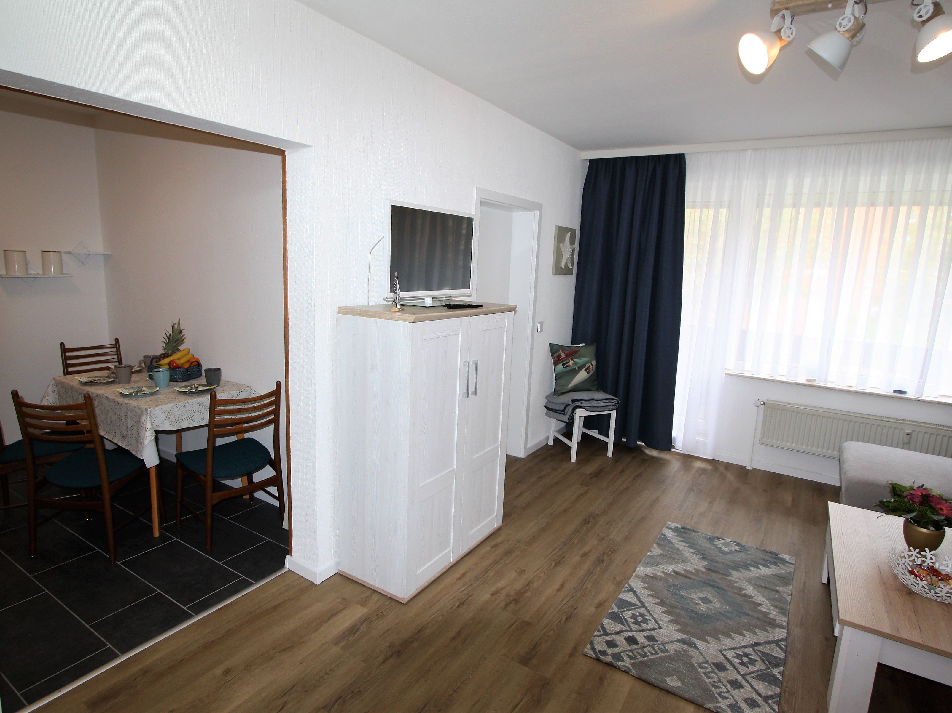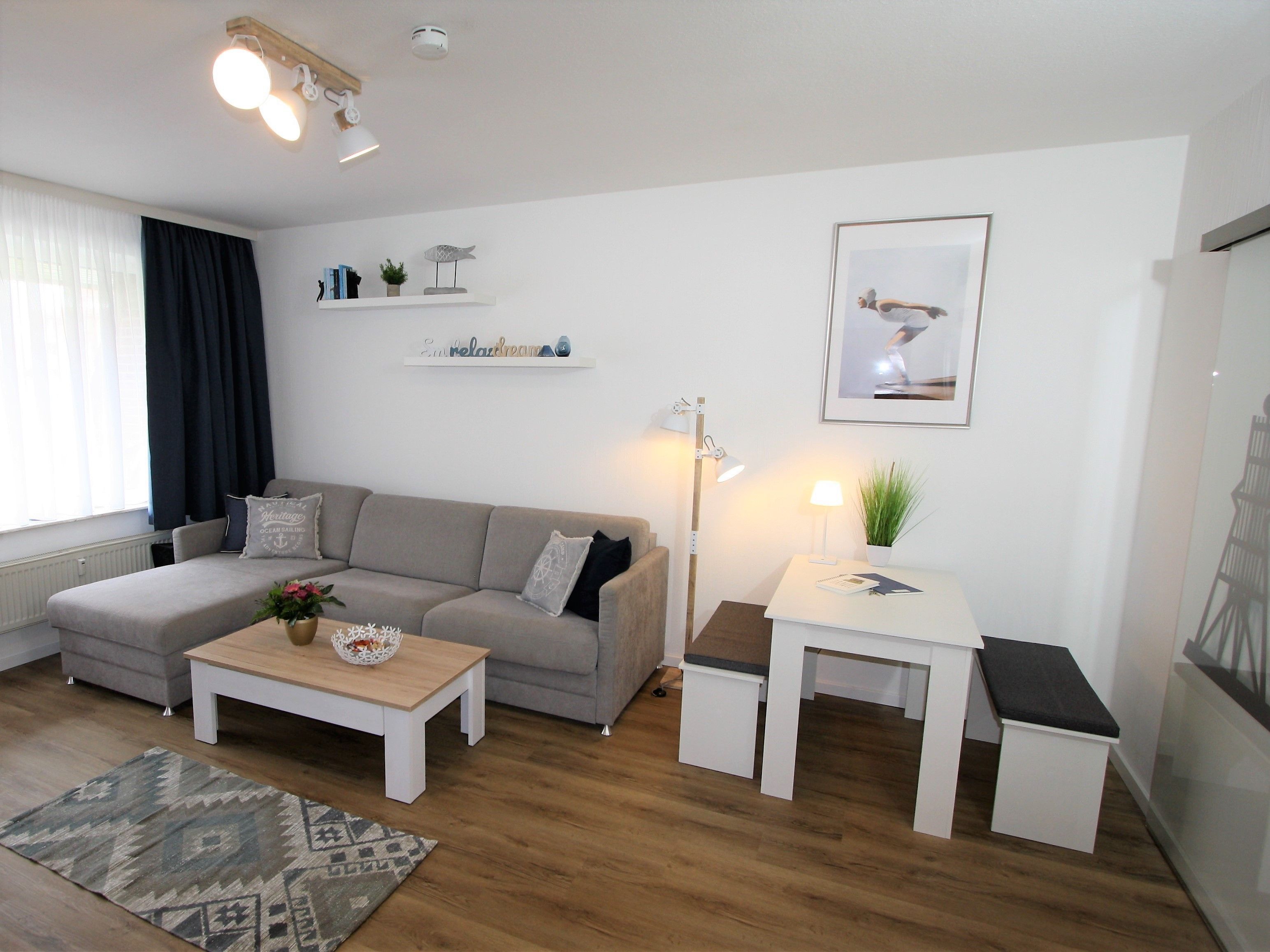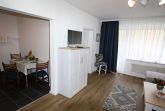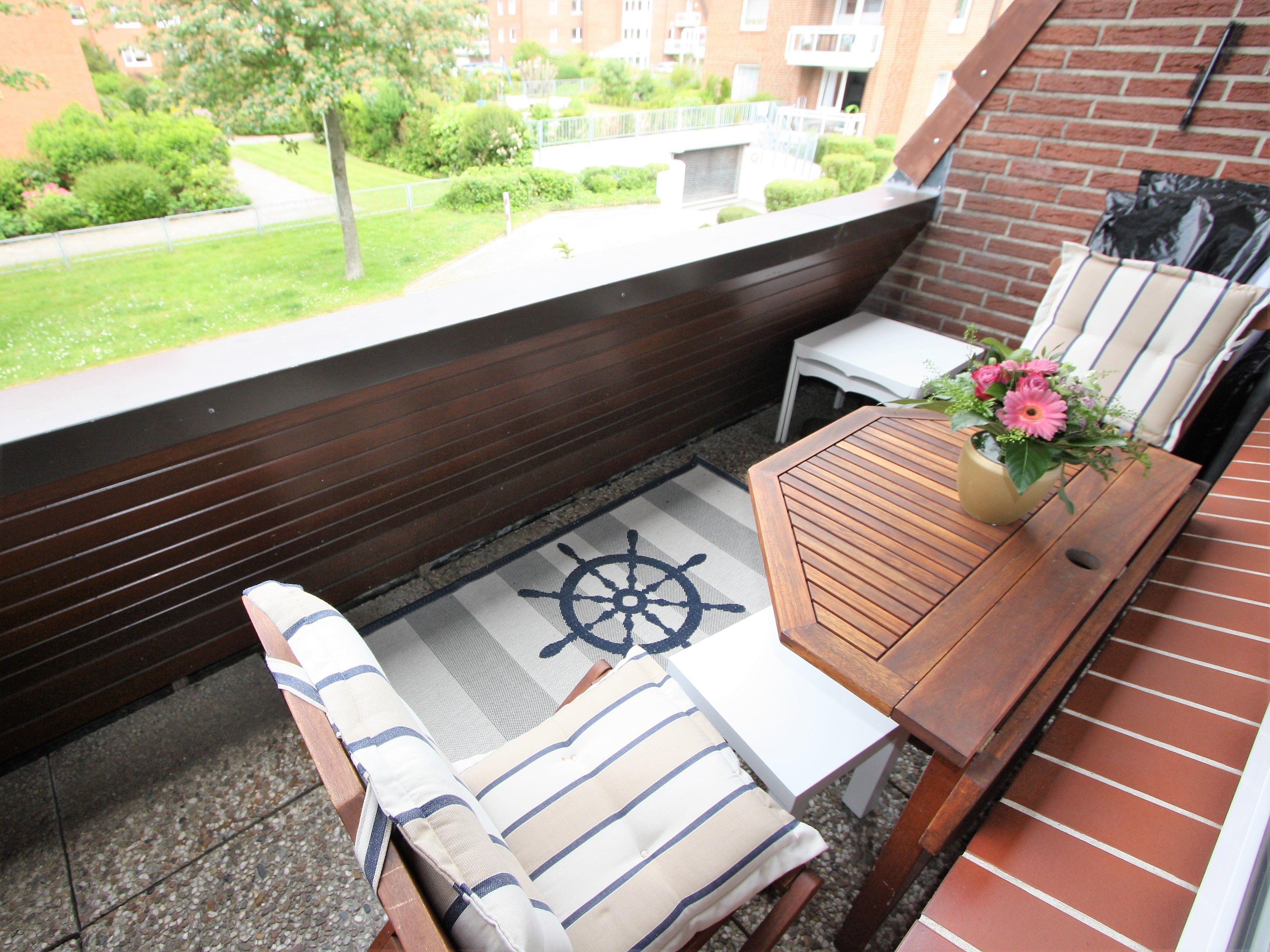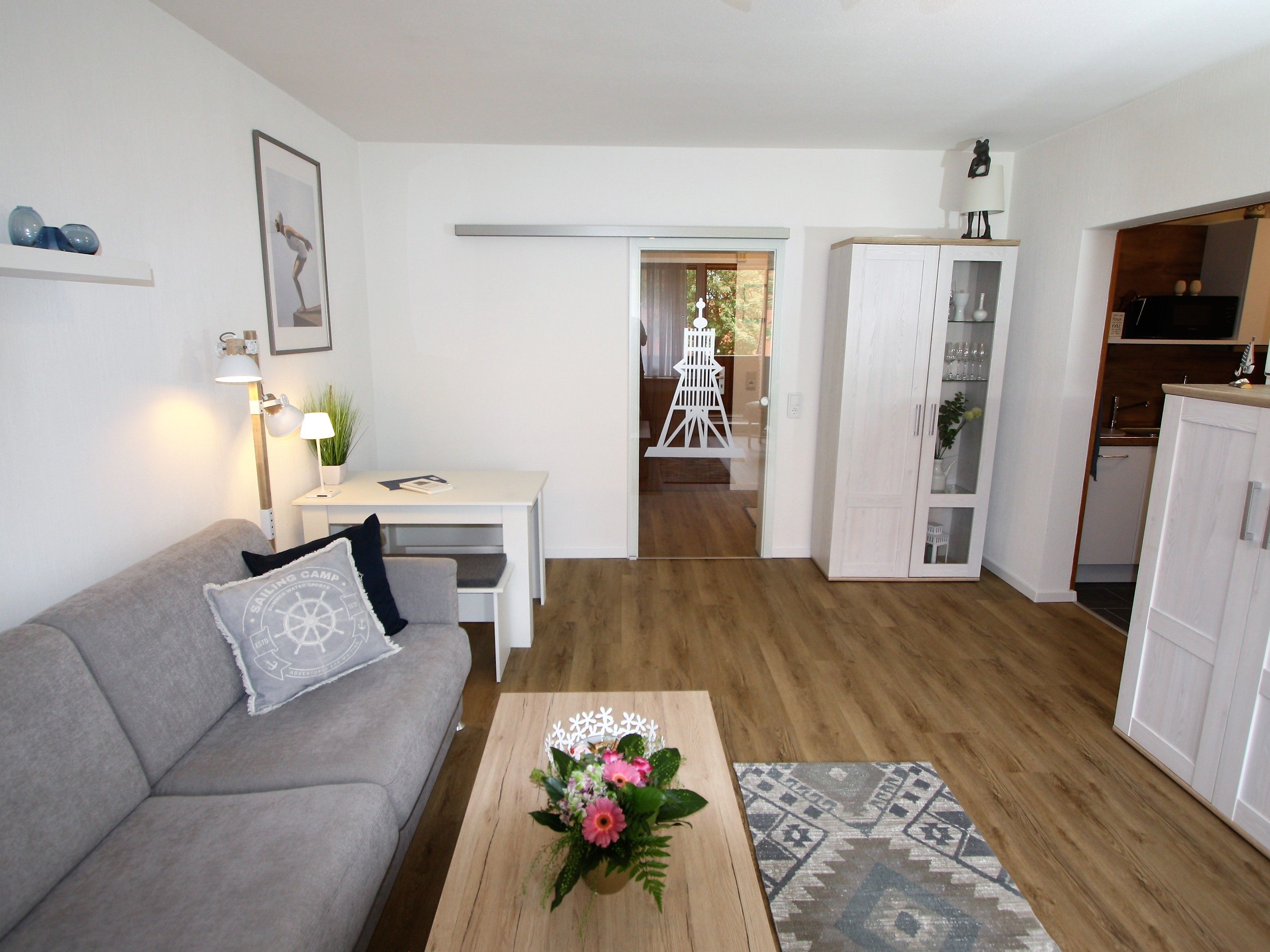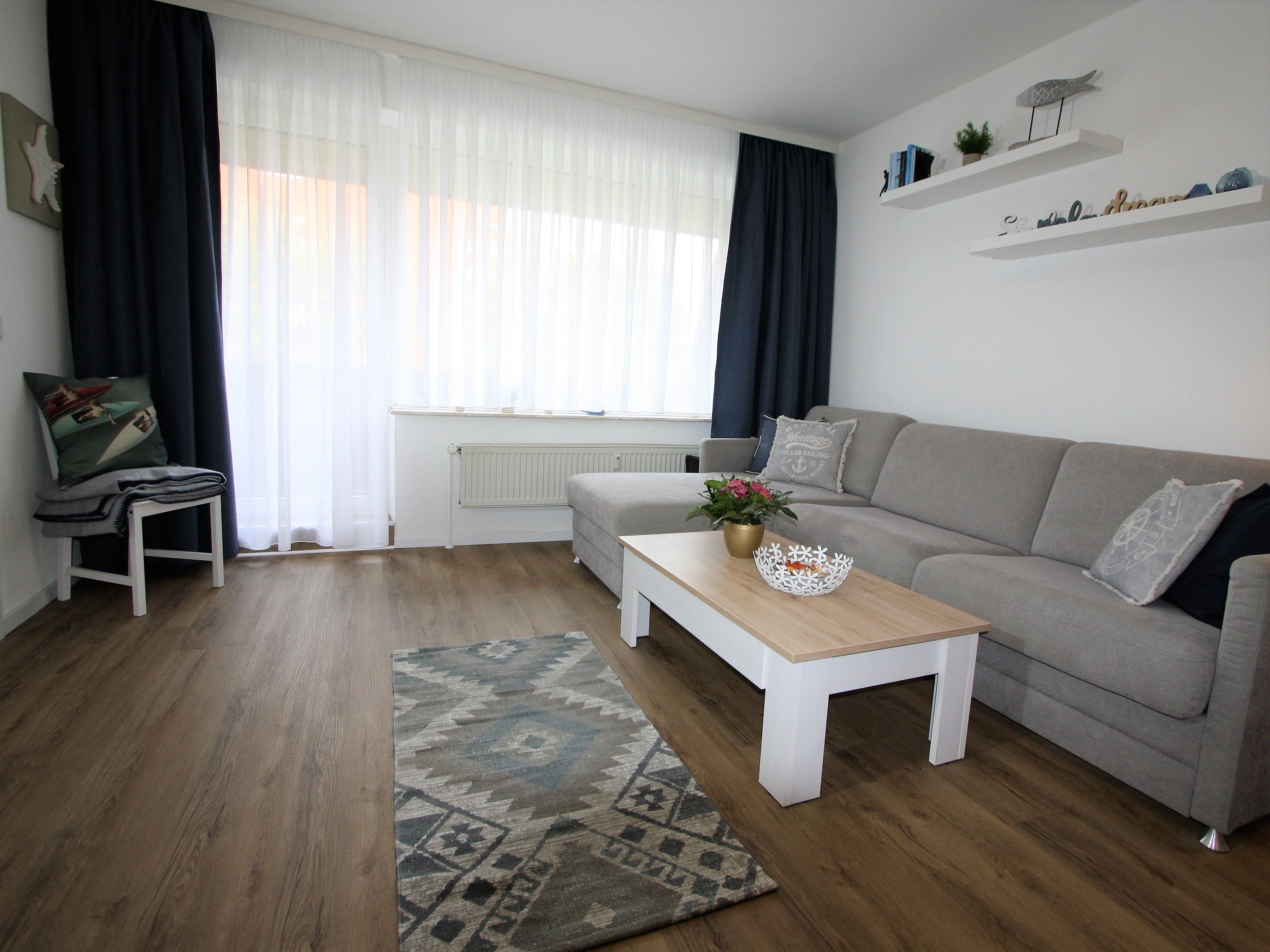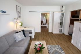 Ihre Ferienwohnung ist ein liebevoll eingerichtetes 2-Zimmer-Apartment mit gemütlichem Balkon. An das maritime Wohnzimmer schließt die offene, voll ausgestattete Küche an. Ebenfalls zur Wohnung gehört ein helles Schlafzimmer mit Doppelbett und geräumigem Kleiderschrank sowie ein modernes Bad.