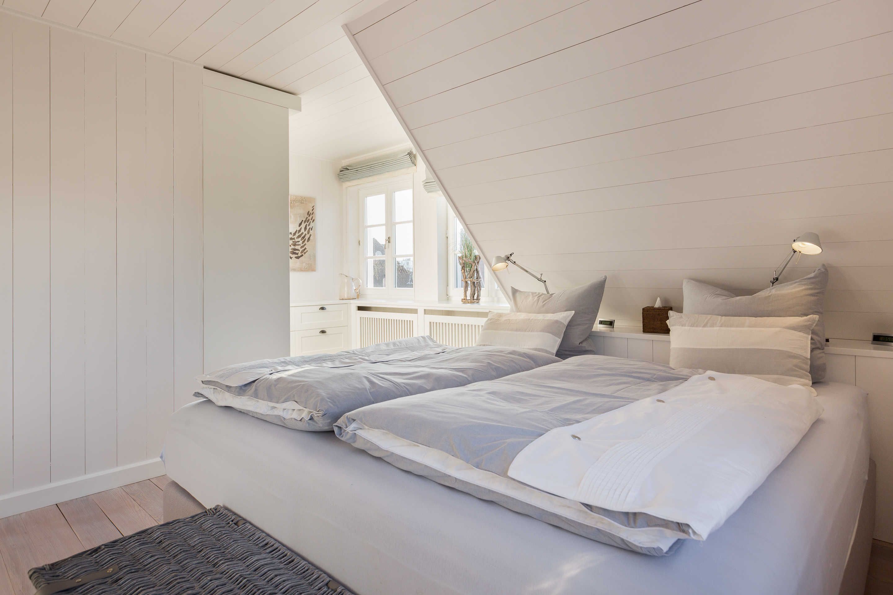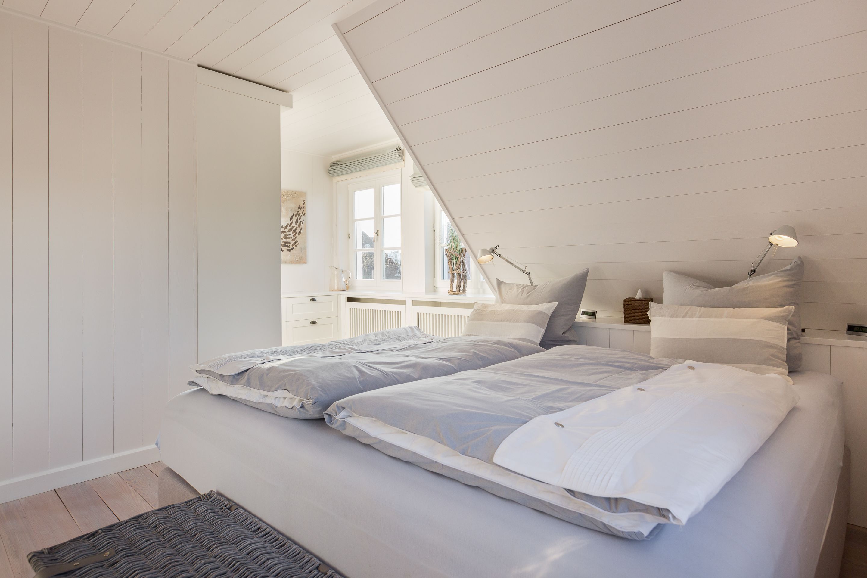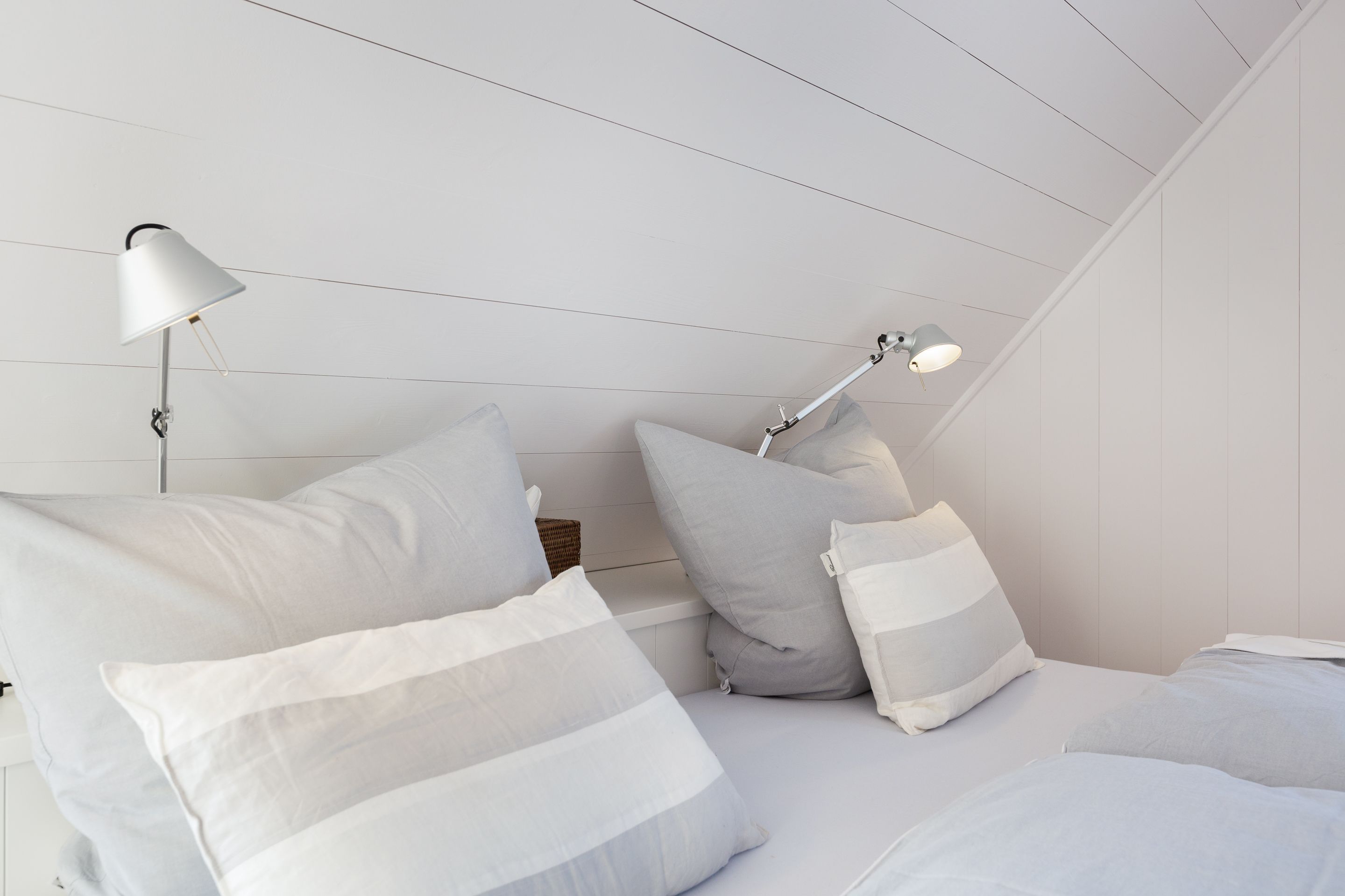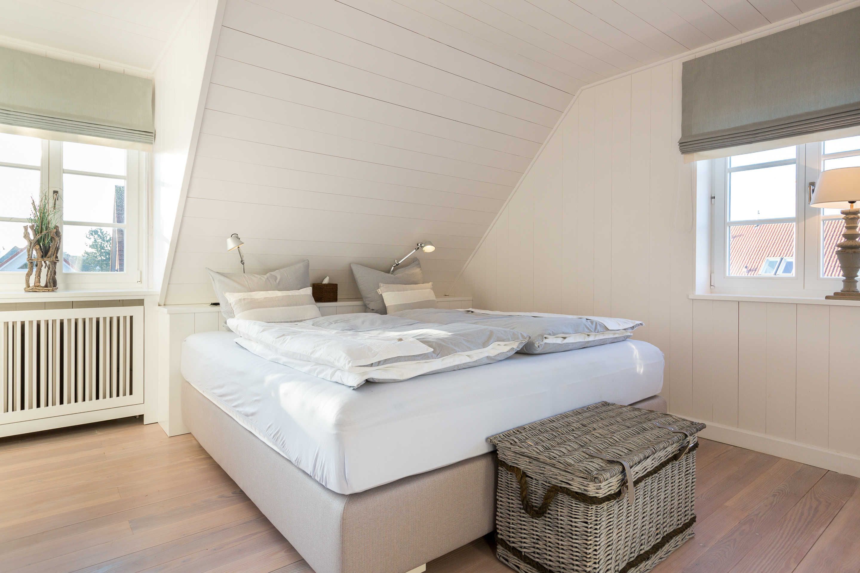 Das Obergeschoss bietet eine edle Optik mit weißer Holzvertäfelung. Oben befindet sich ein großes, helles Badezimmer mit Badewanne und geräumiger Duschkabine, zwei Waschbecken und WC. Im ersten Schlafzimmer findet sich ein 2 x 2 Meter großes Boxspringbett. Das zweite Schlafzimmer hat ein 1,60 x 2,00 Meter großes Doppelbett, einen kleinen Schreibtisch und ein eigenes Duschbad mit WC und separatem Waschraum mit Waschmaschine. Das dritte Schlafzimmer verfügt über ein ausziehbares Bett für ein bis zwei Personen, einen Schreibtisch und einen Fernseher. Alle Schlafzimmer sind mit Einbauschränken ausgestattet und bieten einen traumhaften Blick auf Meer und Natur.