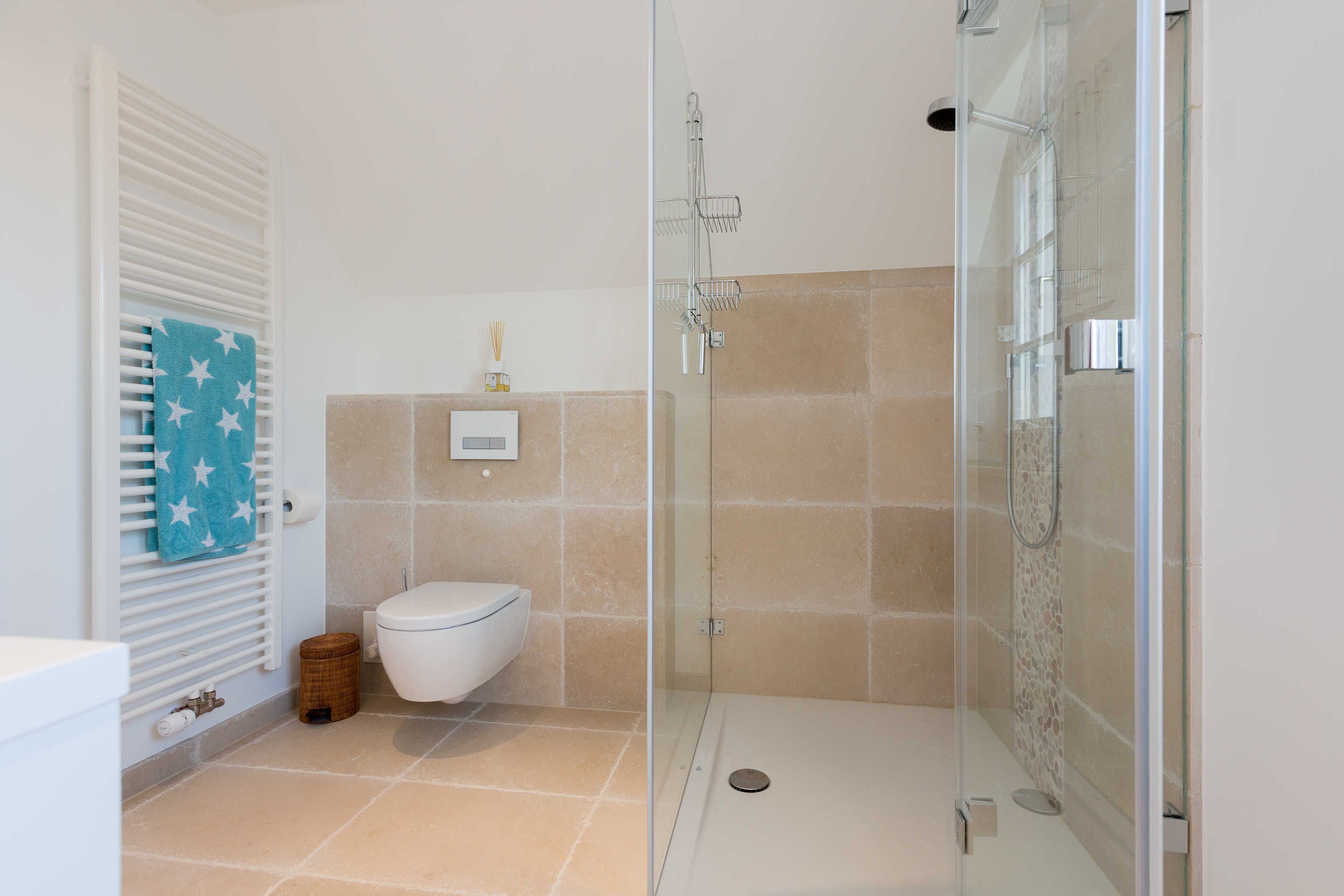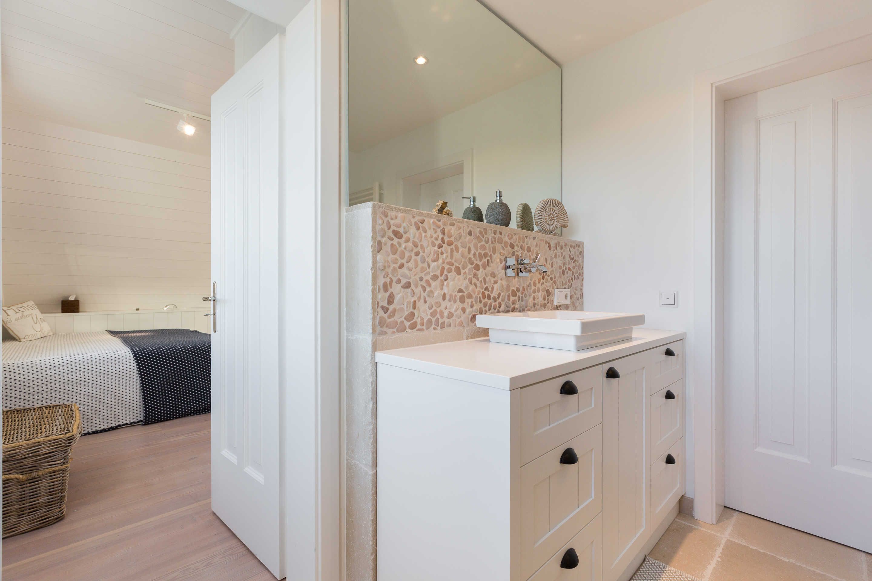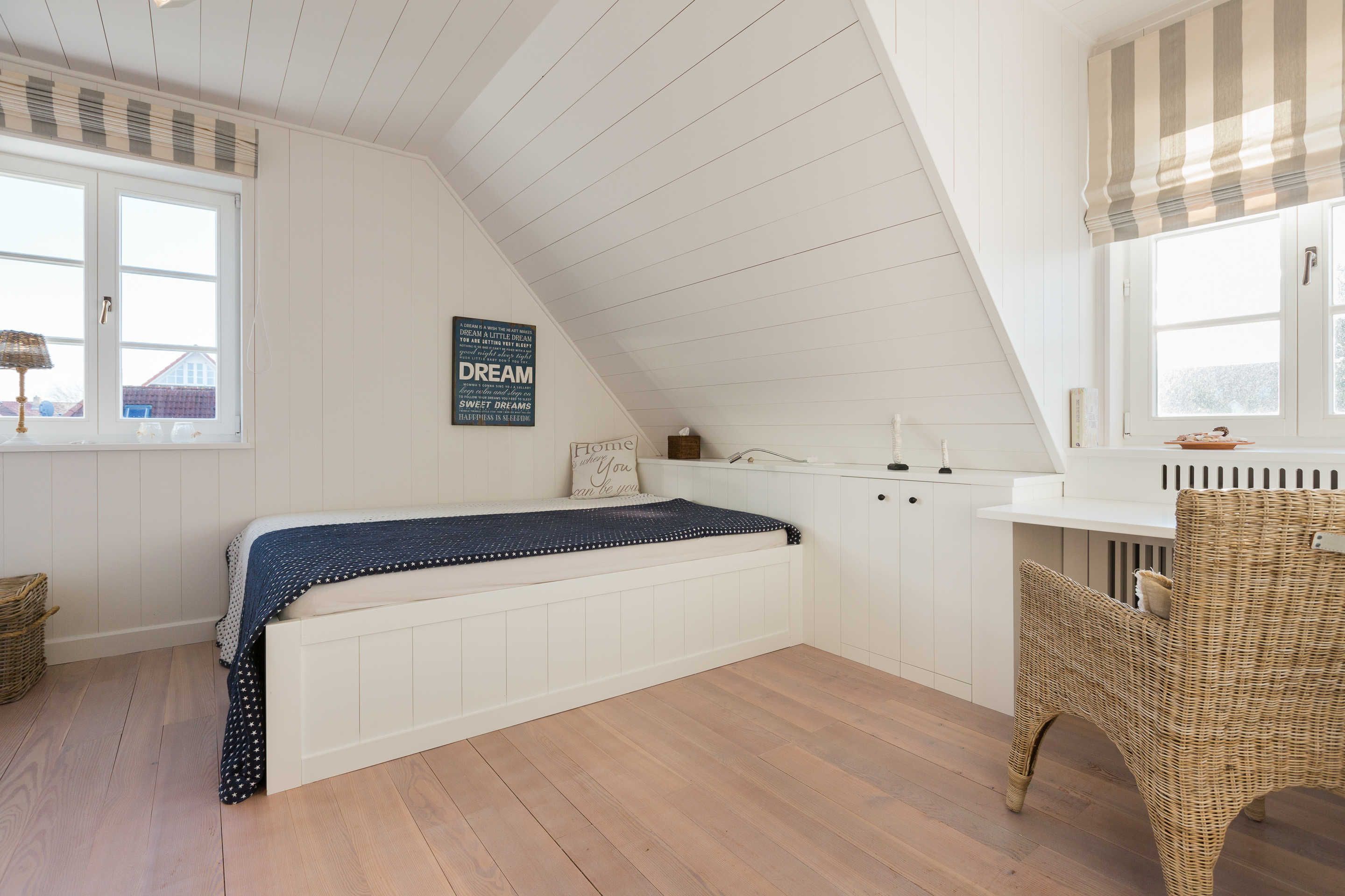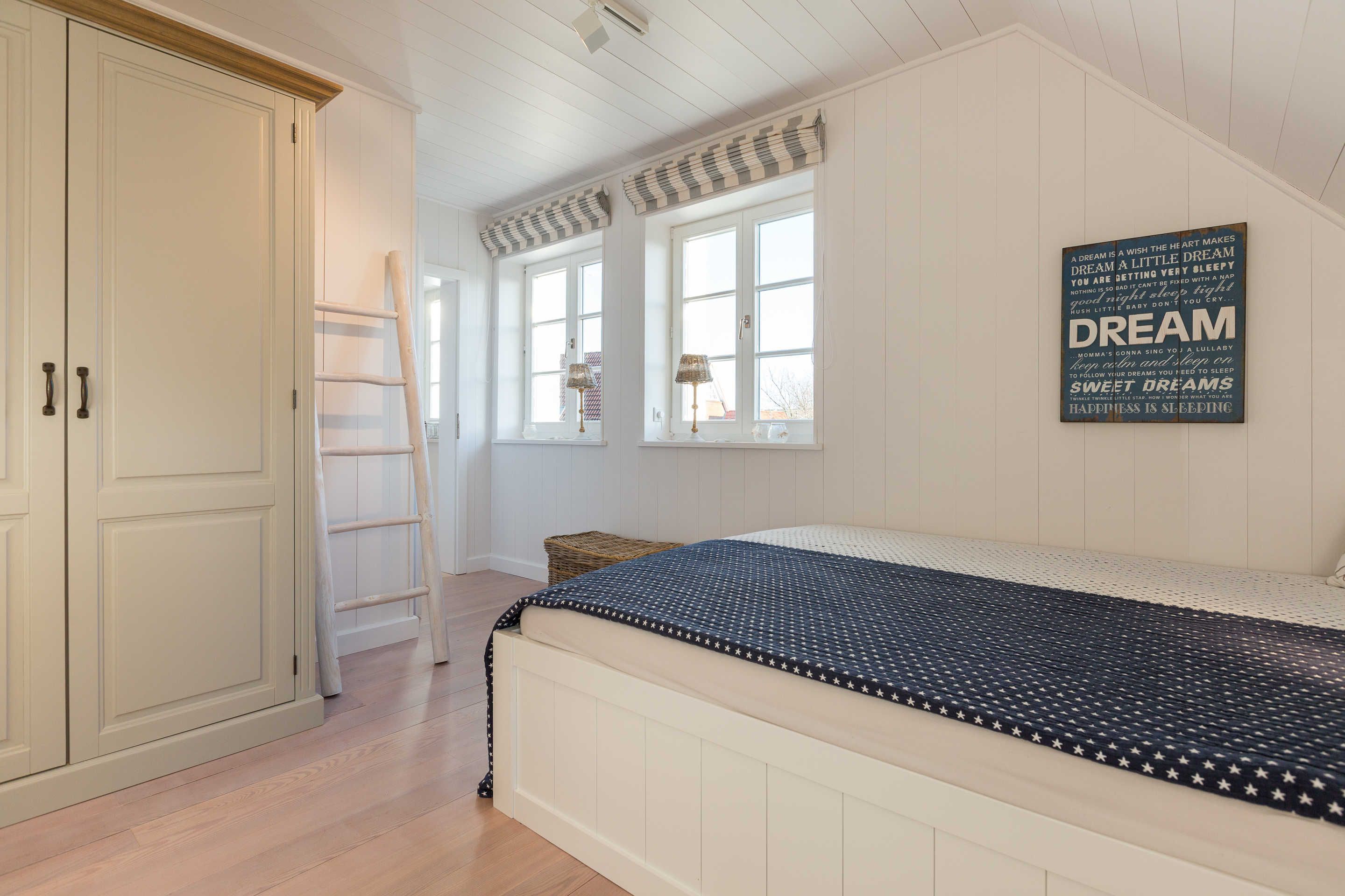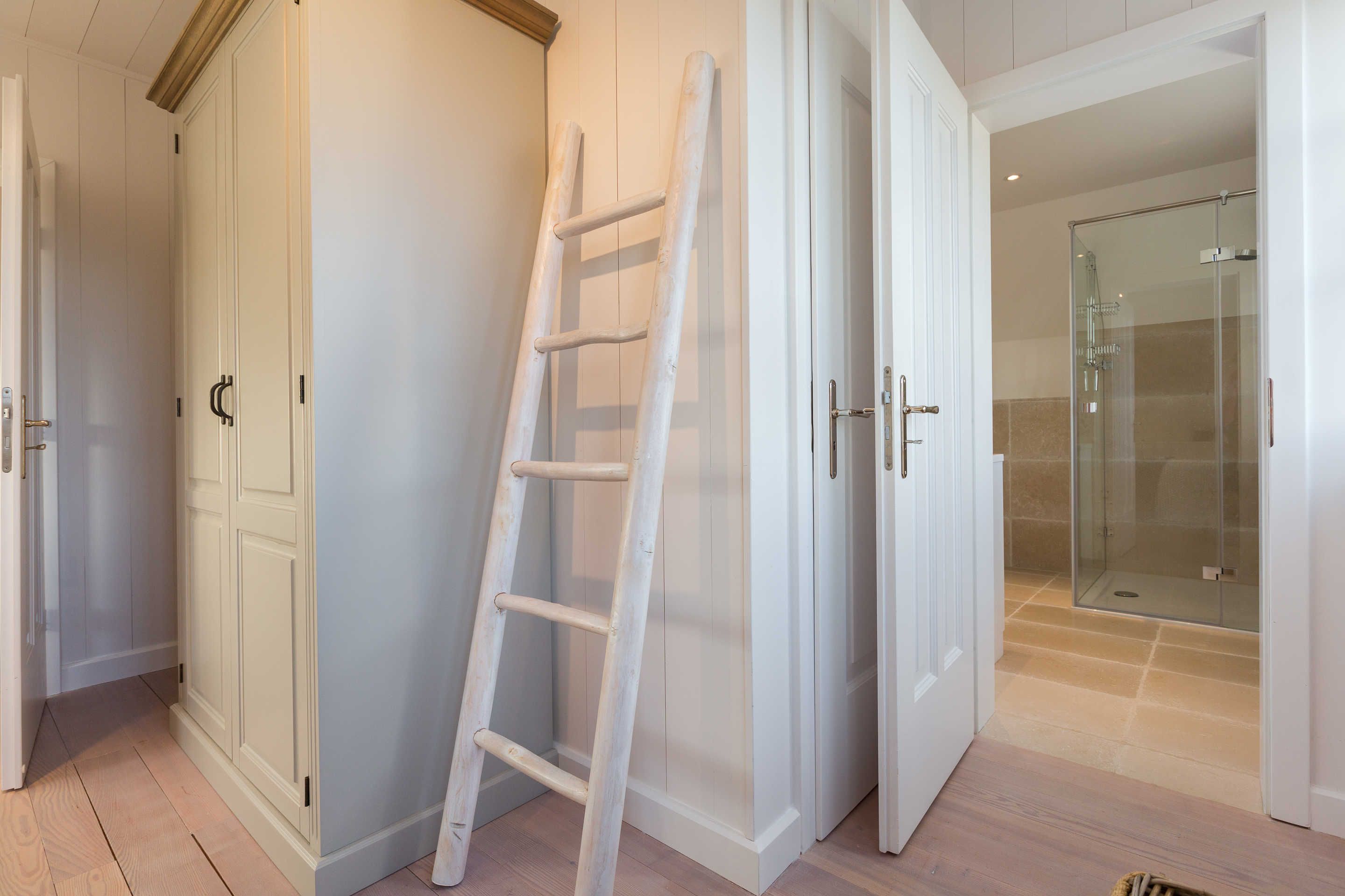 Das Obergeschoss bietet eine edle Optik mit weißer Holzvertäfelung. Oben befindet sich ein großes, helles Badezimmer mit Badewanne und geräumiger Duschkabine, zwei Waschbecken und WC. Im ersten Schlafzimmer findet sich ein 2 x 2 Meter großes Boxspringbett. Das zweite Schlafzimmer hat ein 1,60 x 2,00 Meter großes Doppelbett, einen kleinen Schreibtisch und ein eigenes Duschbad mit WC und separatem Waschraum mit Waschmaschine. Das dritte Schlafzimmer verfügt über ein ausziehbares Bett für ein bis zwei Personen, einen Schreibtisch und einen Fernseher. Alle Schlafzimmer sind mit Einbauschränken ausgestattet und bieten einen traumhaften Blick auf Meer und Natur.