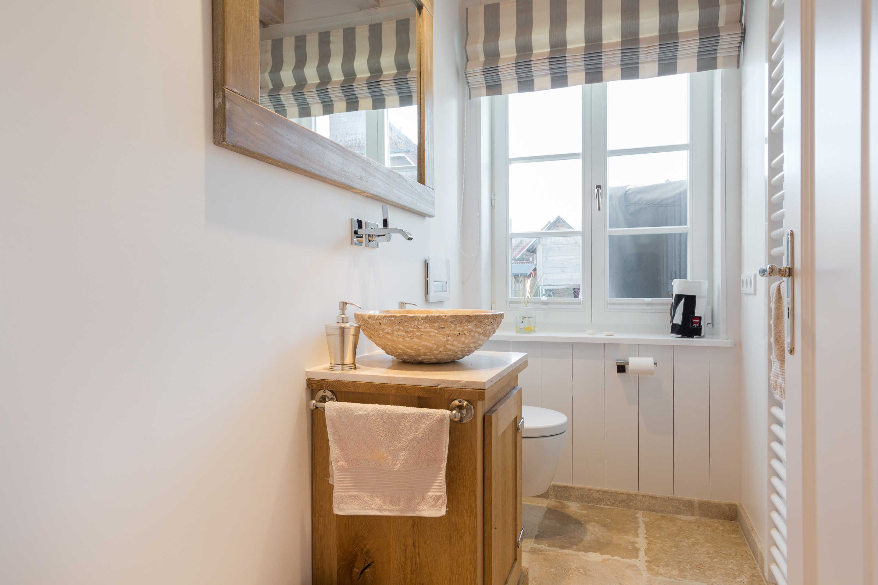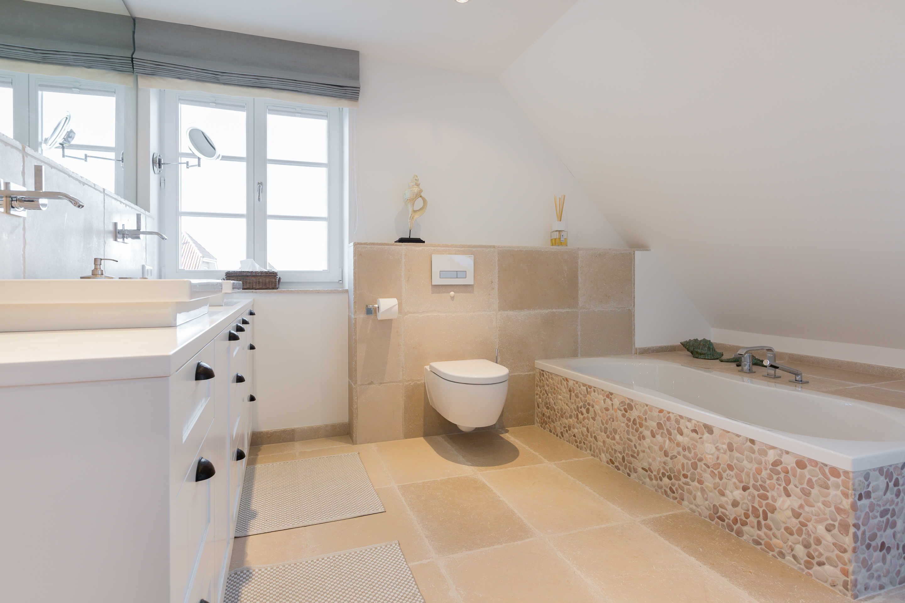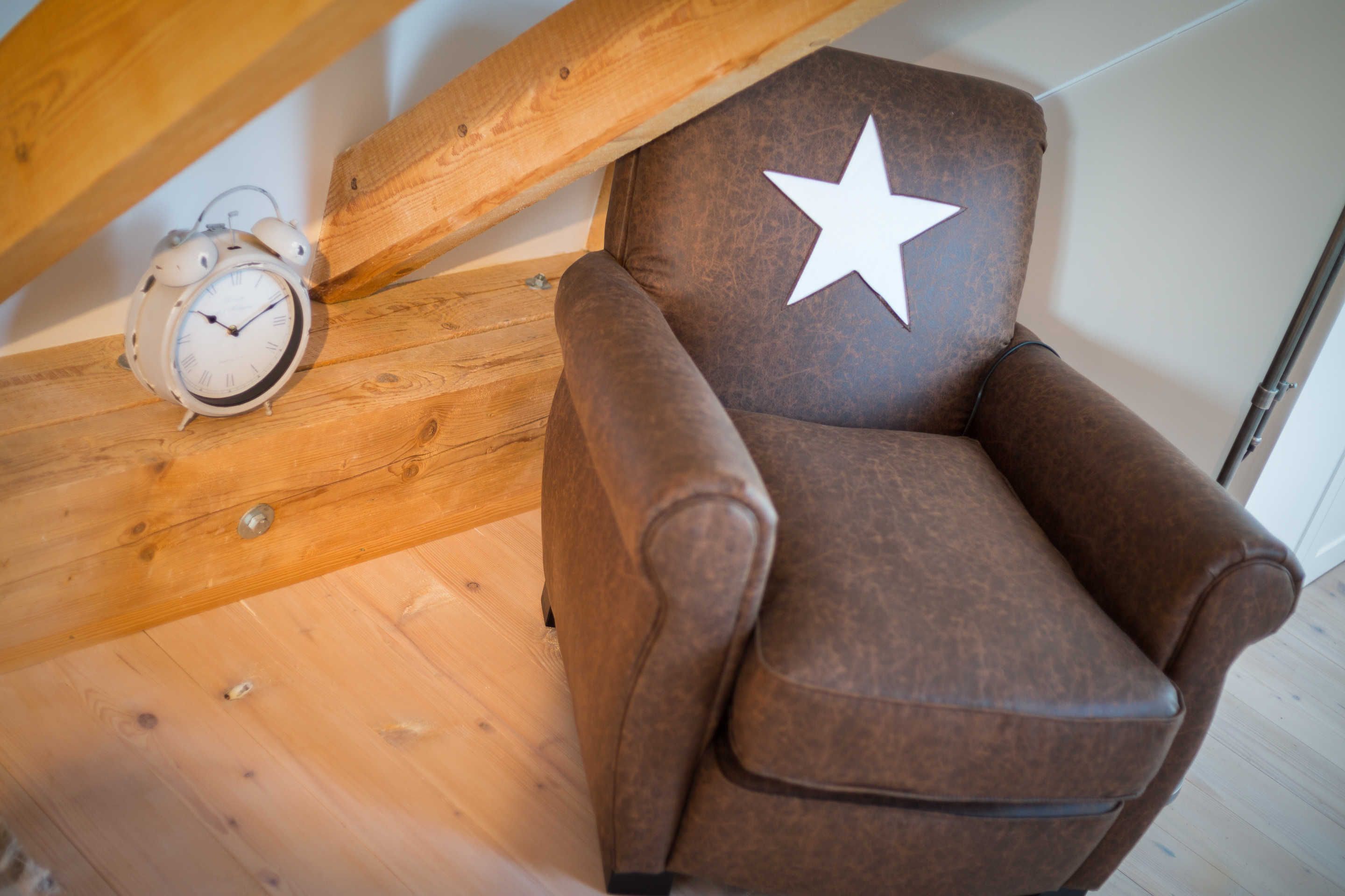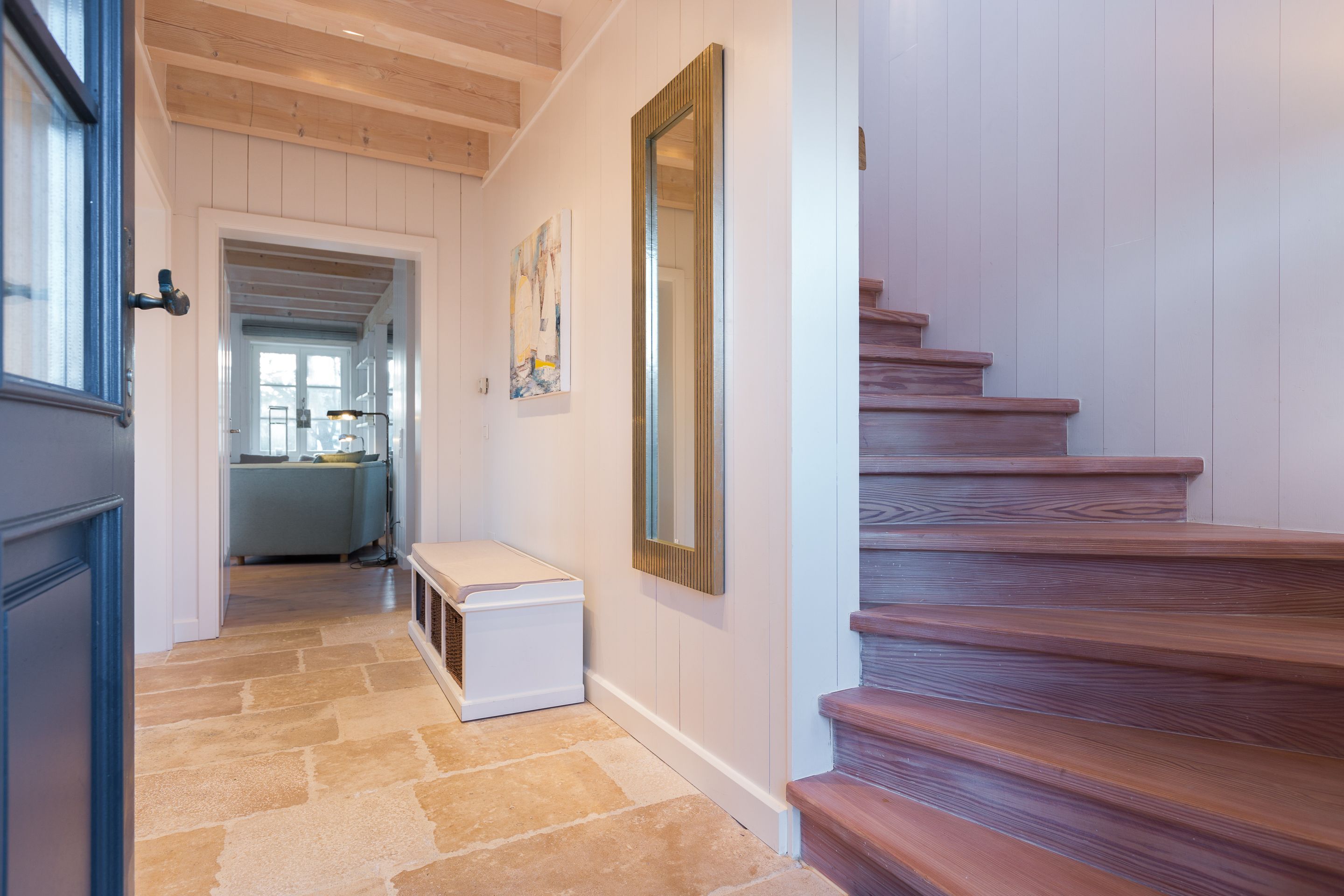 Das Obergeschoss bietet eine edle Optik mit weißer Holzvertäfelung. Oben befindet sich ein großes, helles Badezimmer mit Badewanne und geräumiger Duschkabine, zwei Waschbecken und WC. Im ersten Schlafzimmer findet sich ein 2 x 2 Meter großes Boxspringbett. Das zweite Schlafzimmer hat ein 1,60 x 2,00 Meter großes Doppelbett, einen kleinen Schreibtisch und ein eigenes Duschbad mit WC und separatem Waschraum mit Waschmaschine. Das dritte Schlafzimmer verfügt über ein ausziehbares Bett für ein bis zwei Personen, einen Schreibtisch und einen Fernseher. Alle Schlafzimmer sind mit Einbauschränken ausgestattet und bieten einen traumhaften Blick auf Meer und Natur.