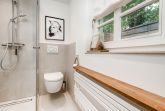 Das komfortable Badezimmer verfügt über eine Dusche mit niedrigem Einstieg und einem hochwertigen Waschtisch mit beleuchtetem Spiegel. Ein Föhn ist ebenfalls vorhanden.