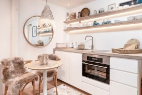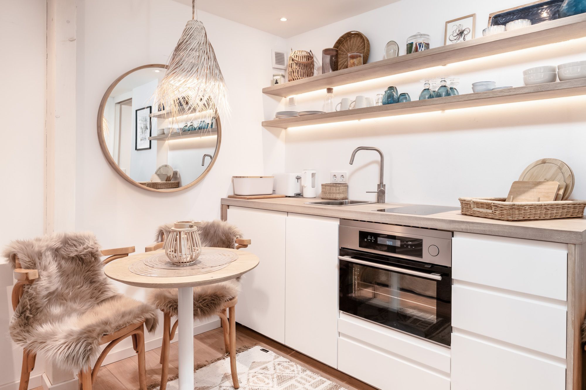 Der Wohnraum ist modern und hochwertig mit viel Liebe zum Detail eingerichtet. Die integrierte Einbauküche verfügt über eine angenehme indirekte Beleuchtung und ist mit einem Induktionsfeld und einem Backofen gut ausgestattet. Im angrenzenden Essbereich genießen Sie die frisch zubereiteten Speisen.