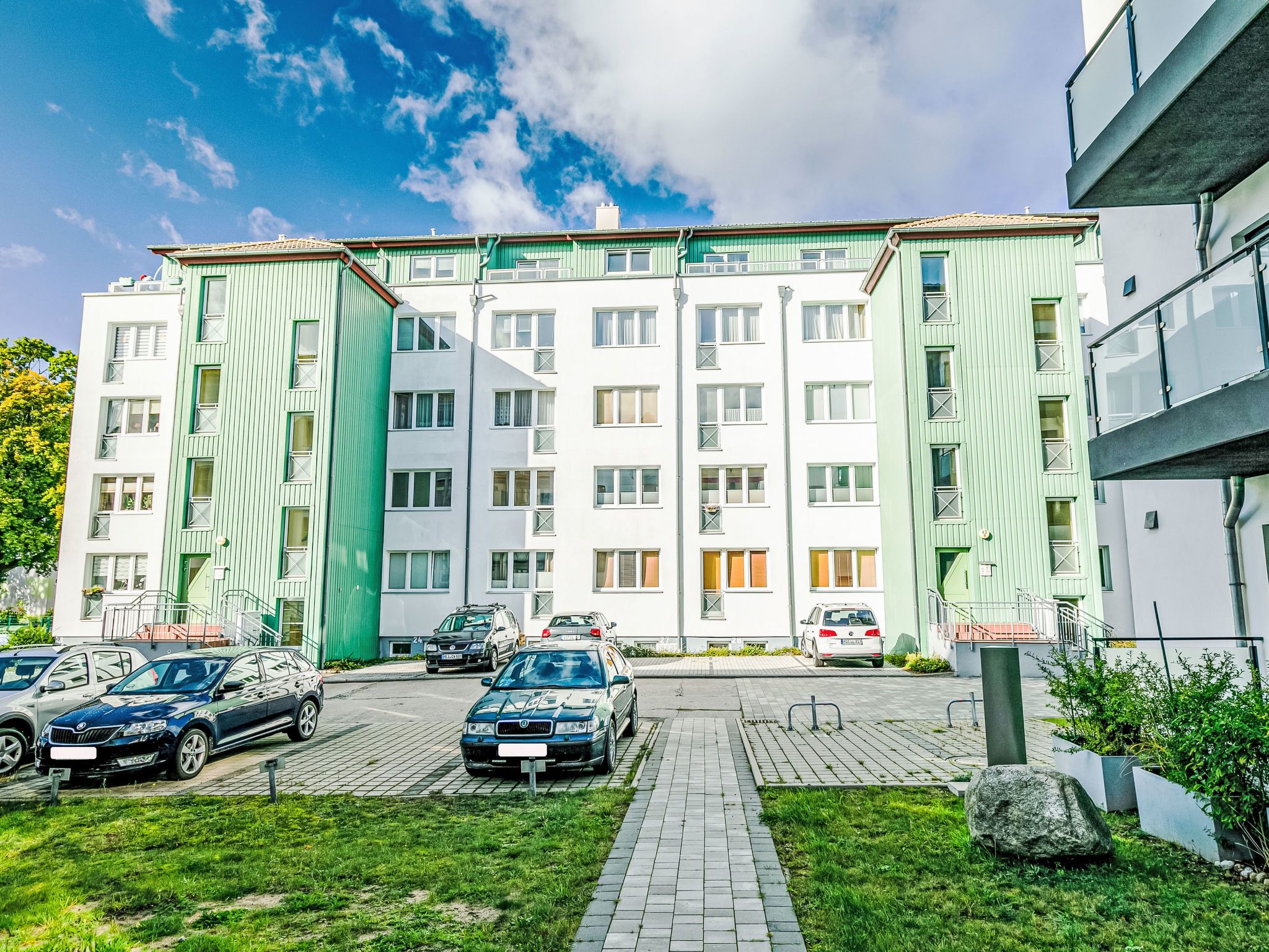 Mehrfamilienhaus auf 4 Stockwerken. Im Ort, 500 m vom Zentrum von Zinnowitz, 100 m vom Meer, vom Strand. Im Hause: Fahrstuhl, Einstellraum für Fahrräder, Zentralheizung. Parkplatz beim Haus. Supermarkt 650 m, Bäckerei 270 m, Café 270 m, Bushaltestelle 110 m, Bahnstation 1 km, Sandstrand 100 m, Thermalbad Bernsteintherme 240 m. Jacht-Hafen 2.6 km, Golfplatz (18 Loch) 25 km, Surfschule 240 m, Tennis 750 m, Minigolf. Bitte beachten: Fahrstuhl nur bis 3. Stock.