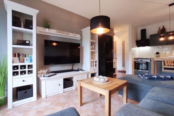 Der kombinierte Wohnbereich bietet eine helle und einladende Atmosphäre. Es gibt einen Essbereich, an dem Sie Mahlzeiten gemeinsam genießen können, sowie ein bequemes Schlafsofa für zusätzliche Gäste oder gemütliche Abende. Der 55-Zoll-Fernseher, der Radio, CD-Player, Blu-ray-Player sowie eine Spielekonsole bietet, sorgt für Unterhaltung. Bücher und Spiele stehen ebenfalls zur Verfügung, um Ihnen angenehme Stunden zu bereiten.
