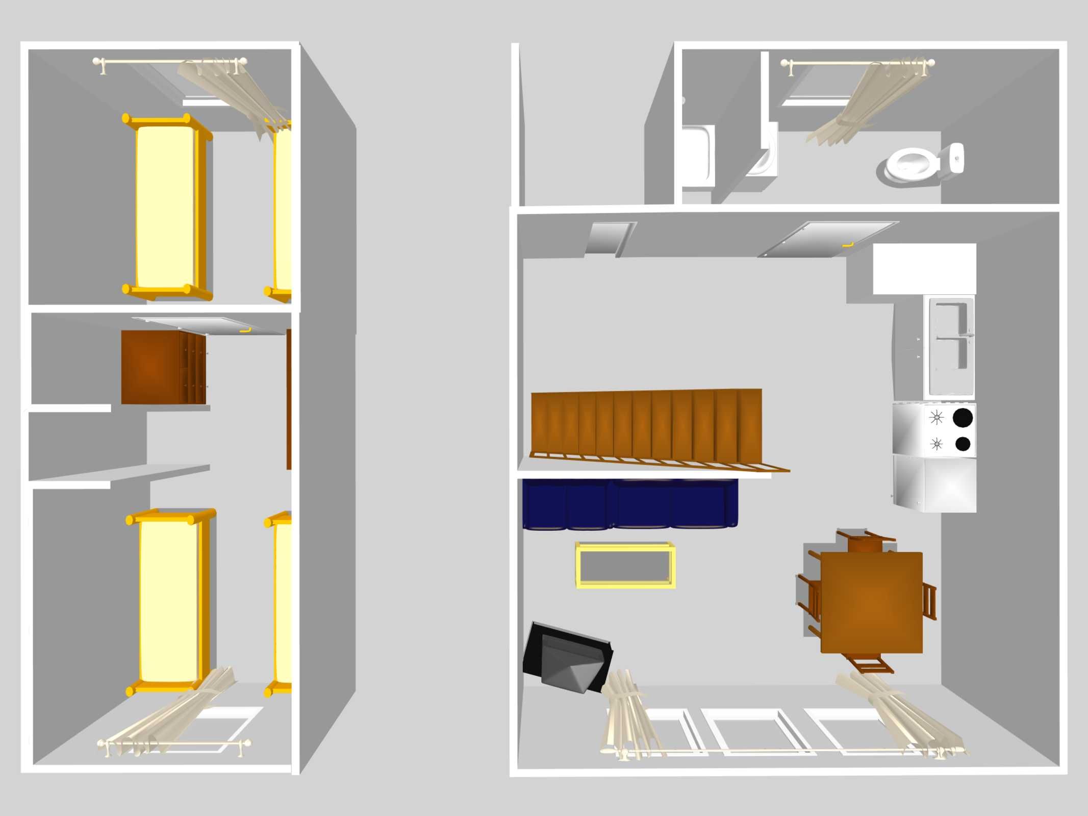 Nurdach-Haus: 2-geschossig mit Spartreppe, Wohn-Esszimmer mit Küchenbereich sowie Sanitärbereich im EG, 2 Schlafzimmer mit Einzelbetten im DG