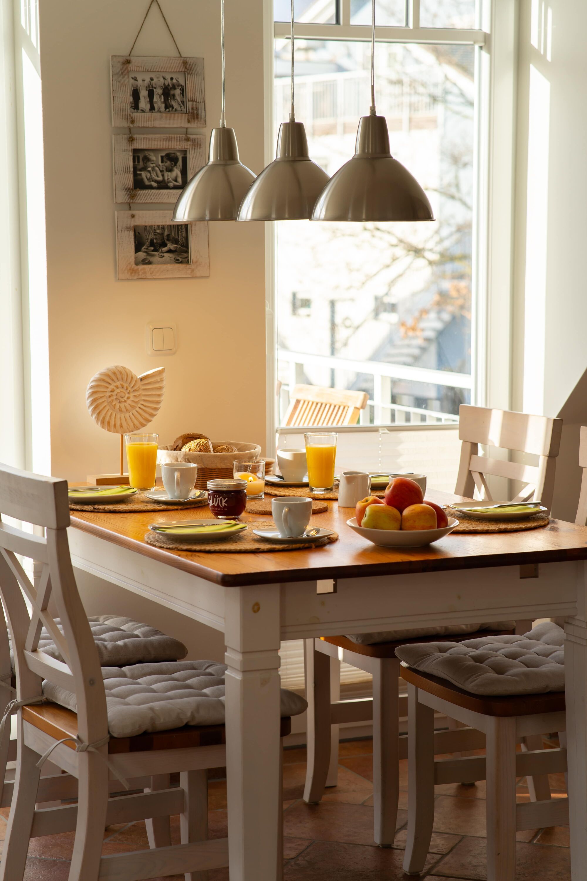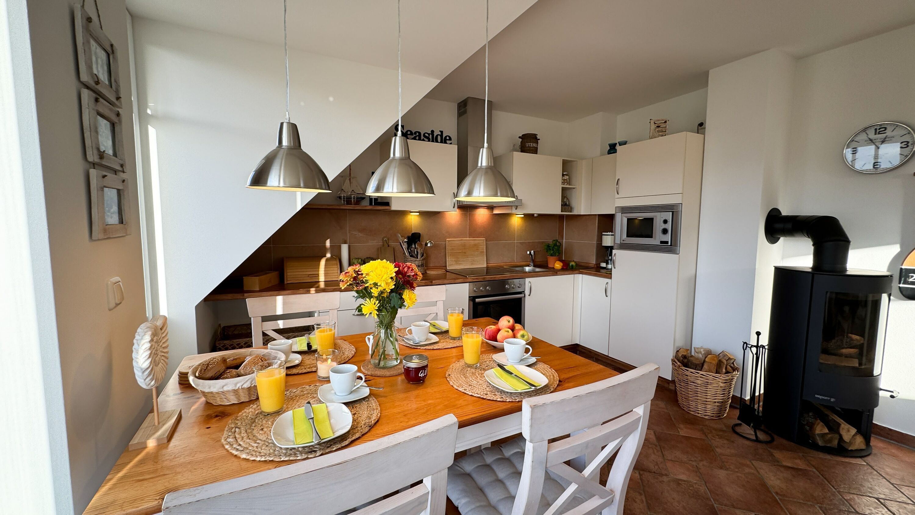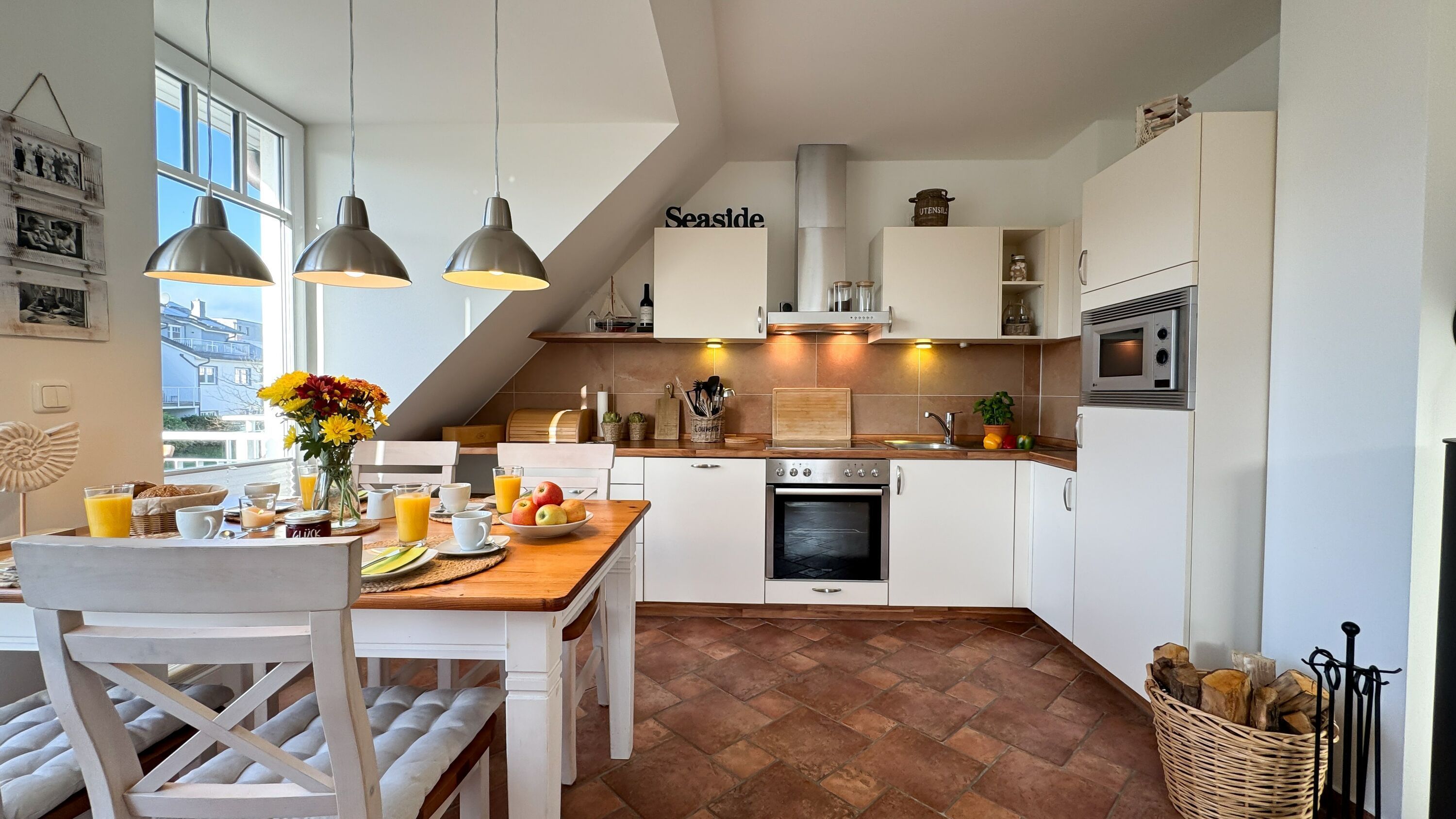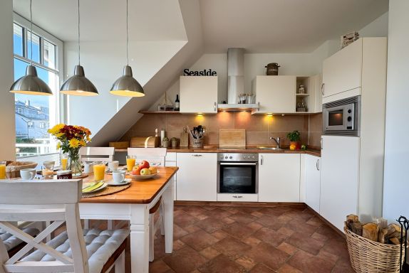 Die offene Küche verfügt über einen großen Esstisch für vier Personen. Hier können Sie gemeinsame Mahlzeiten genießen und gemütliche Abende verbringen.
