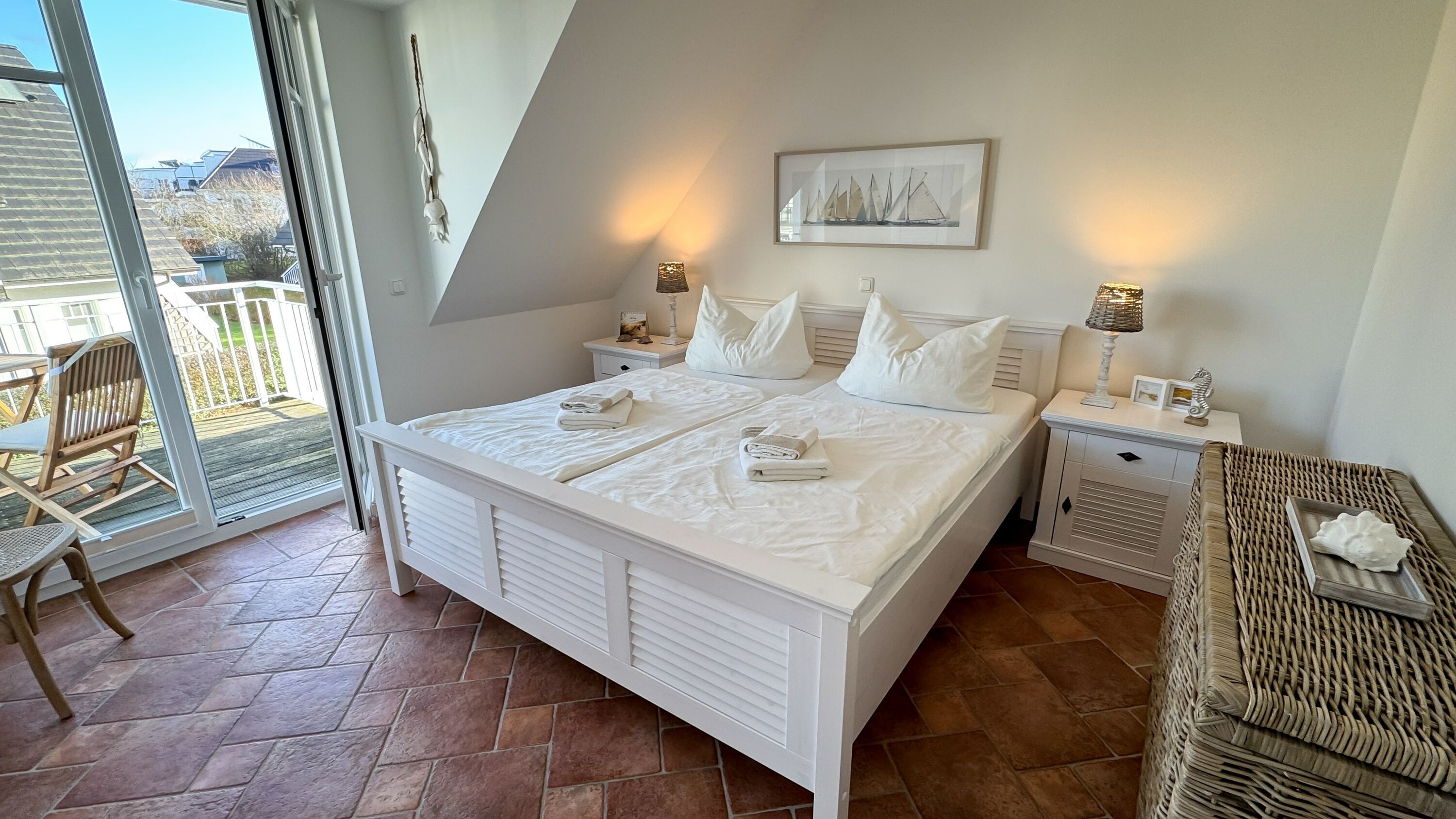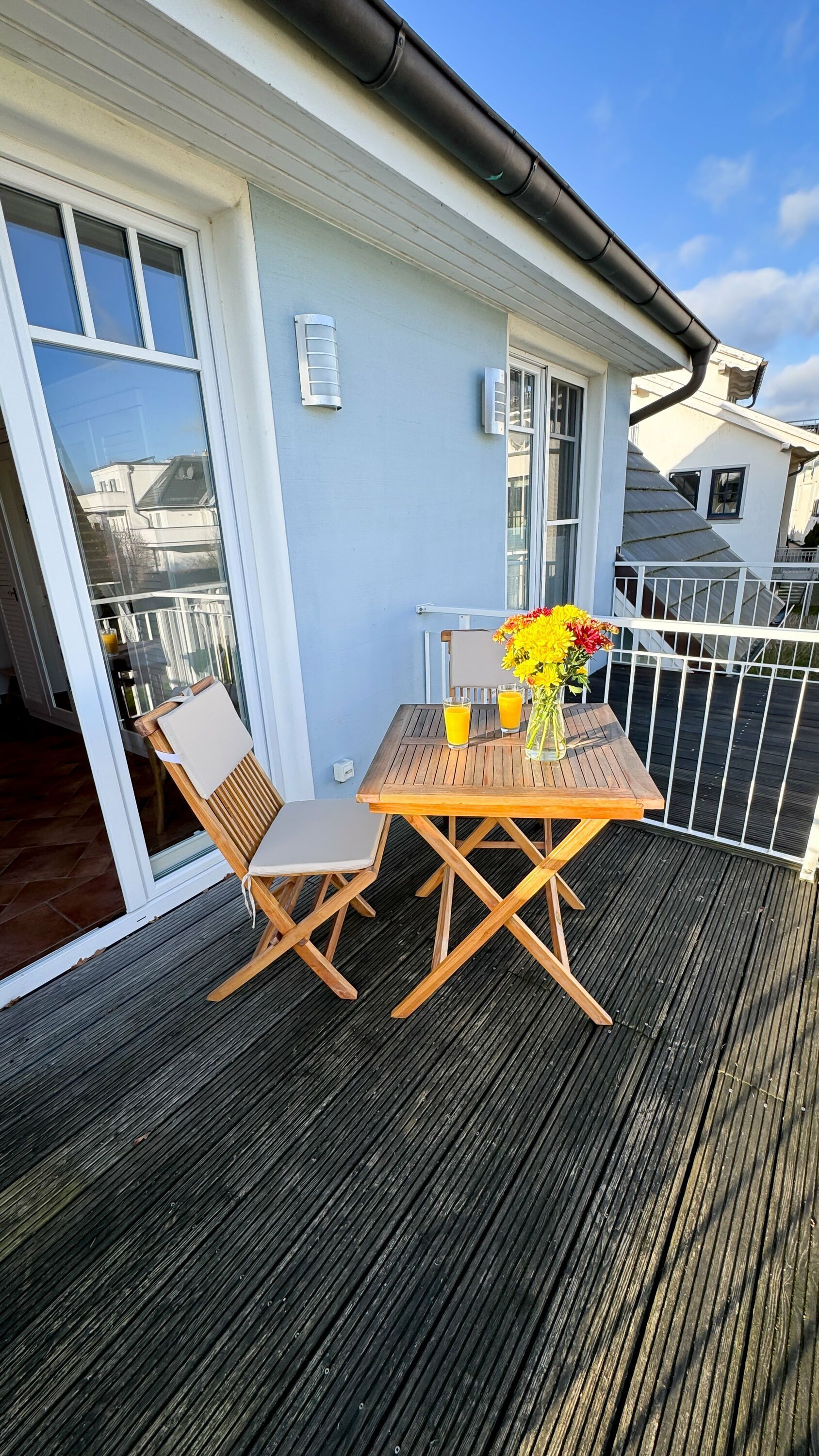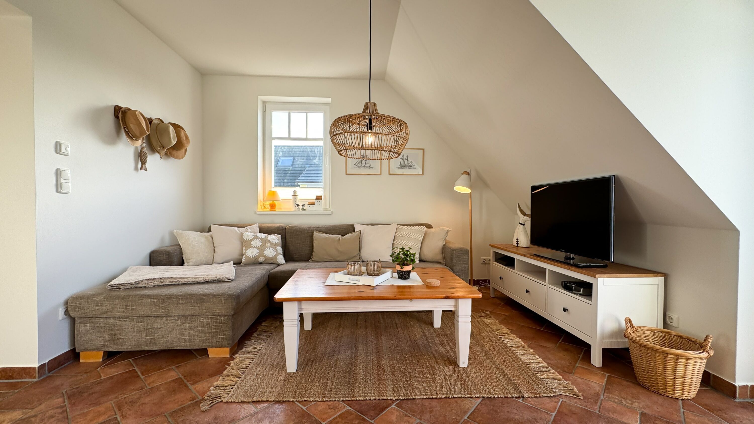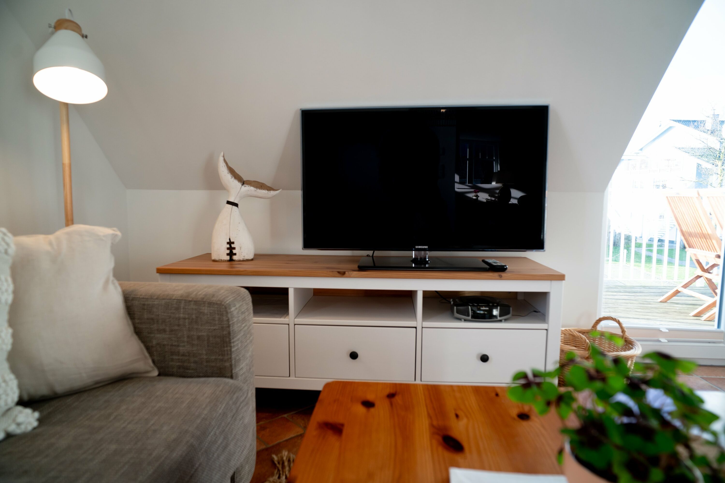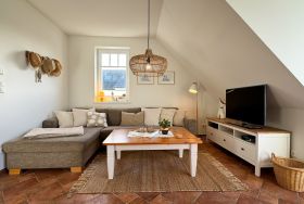 Die Wohnung verfügt über zwei Balkone mit Balkonmöbeln für vier Personen. Sie können hier die frische Meeresluft genießen und entspannte Stunden im Freien verbringen. Die Einrichtung ist mit hochwertigen Naturholzmöbeln gestaltet, was eine warme und gemütliche Atmosphäre schafft. Eine Fußbodenheizung sorgt dafür, dass Sie auch in den kälteren Monaten stets angenehme Wärme haben. Der Wohnbereich ist mit einer gemütlichen Couch und einem HD-TV ausgestattet. Von hier aus haben Sie Zugang zu einem der Balkone.