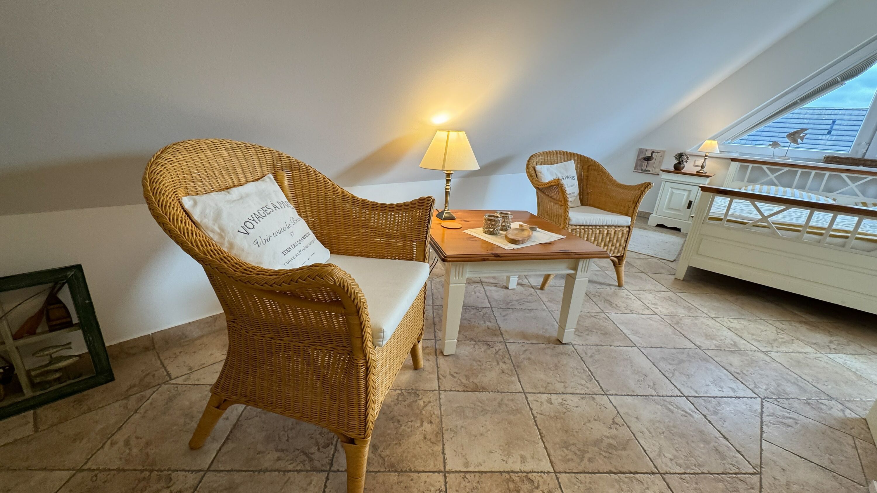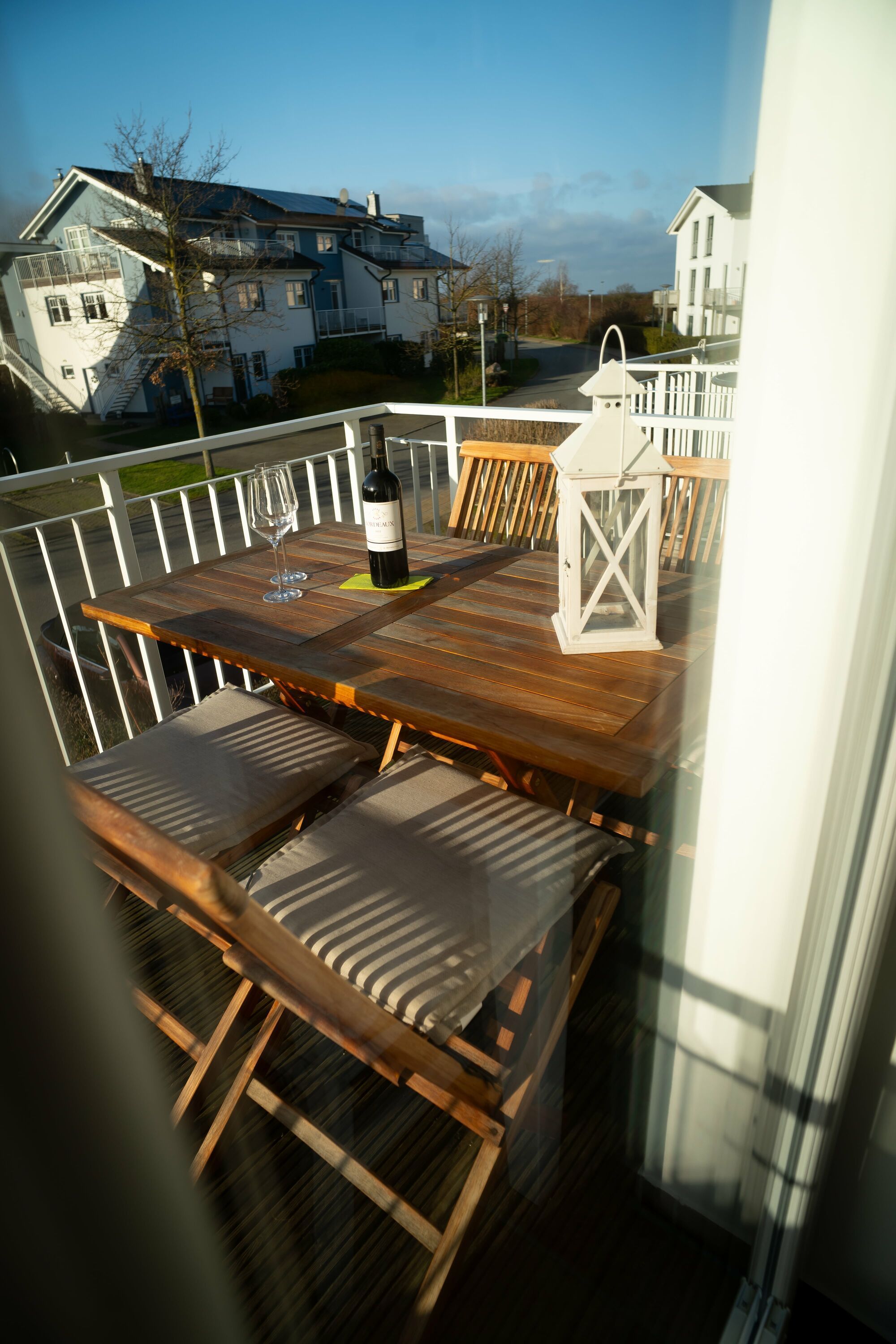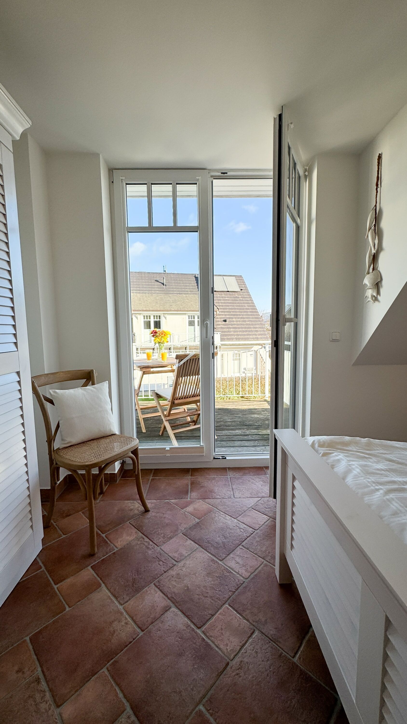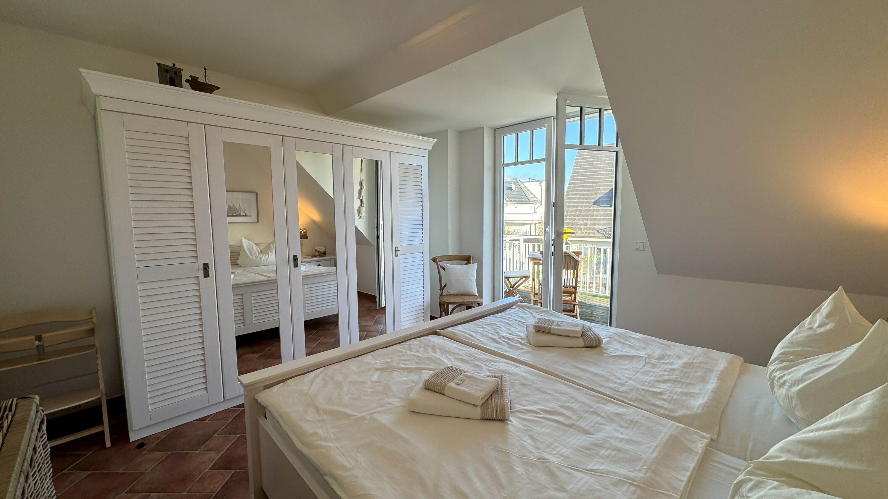 Die Wohnung verfügt über zwei Balkone mit Balkonmöbeln für vier Personen. Sie können hier die frische Meeresluft genießen und entspannte Stunden im Freien verbringen. Die Einrichtung ist mit hochwertigen Naturholzmöbeln gestaltet, was eine warme und gemütliche Atmosphäre schafft. Eine Fußbodenheizung sorgt dafür, dass Sie auch in den kälteren Monaten stets angenehme Wärme haben. Der Wohnbereich ist mit einer gemütlichen Couch und einem HD-TV ausgestattet. Von hier aus haben Sie Zugang zu einem der Balkone.