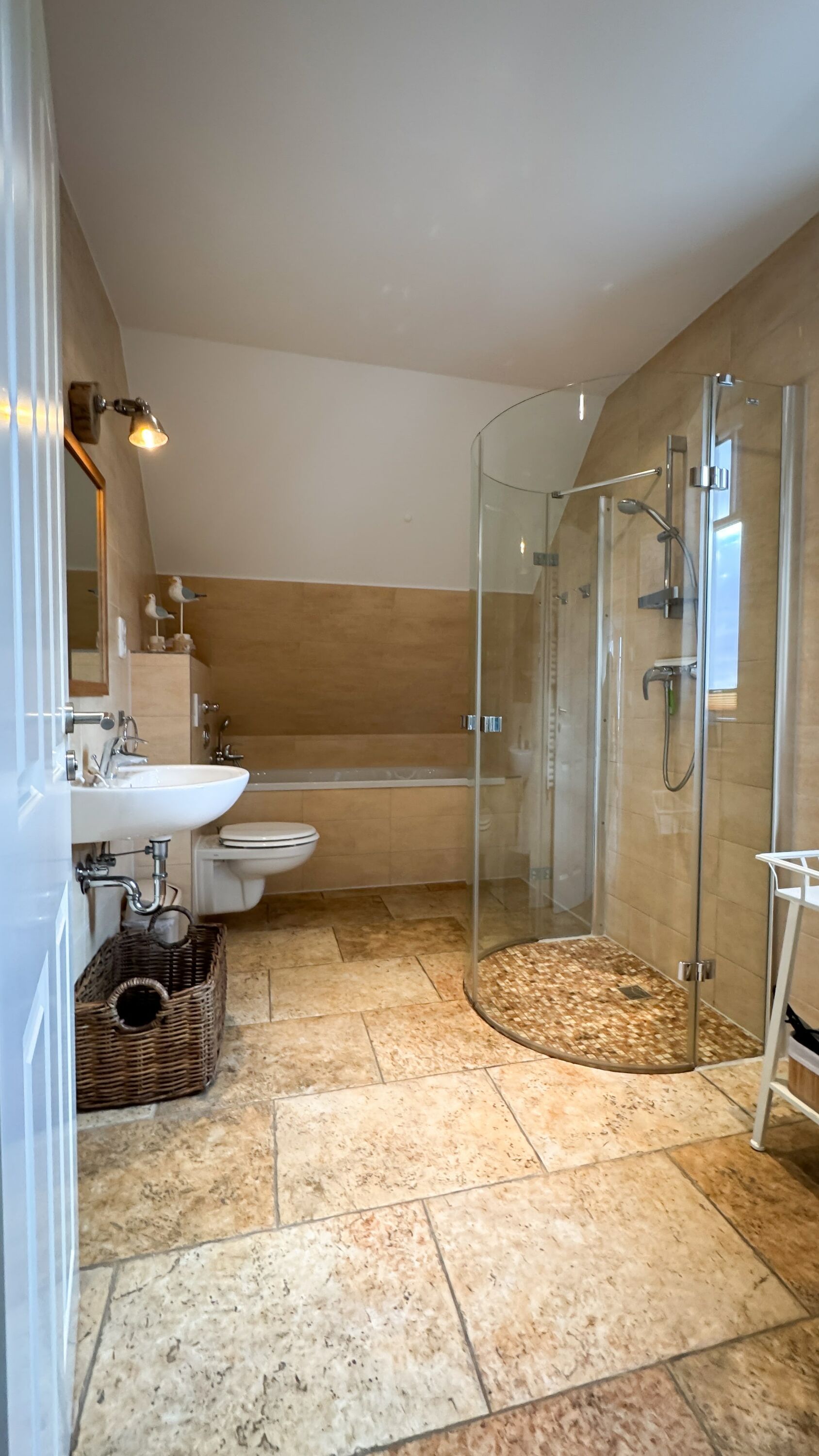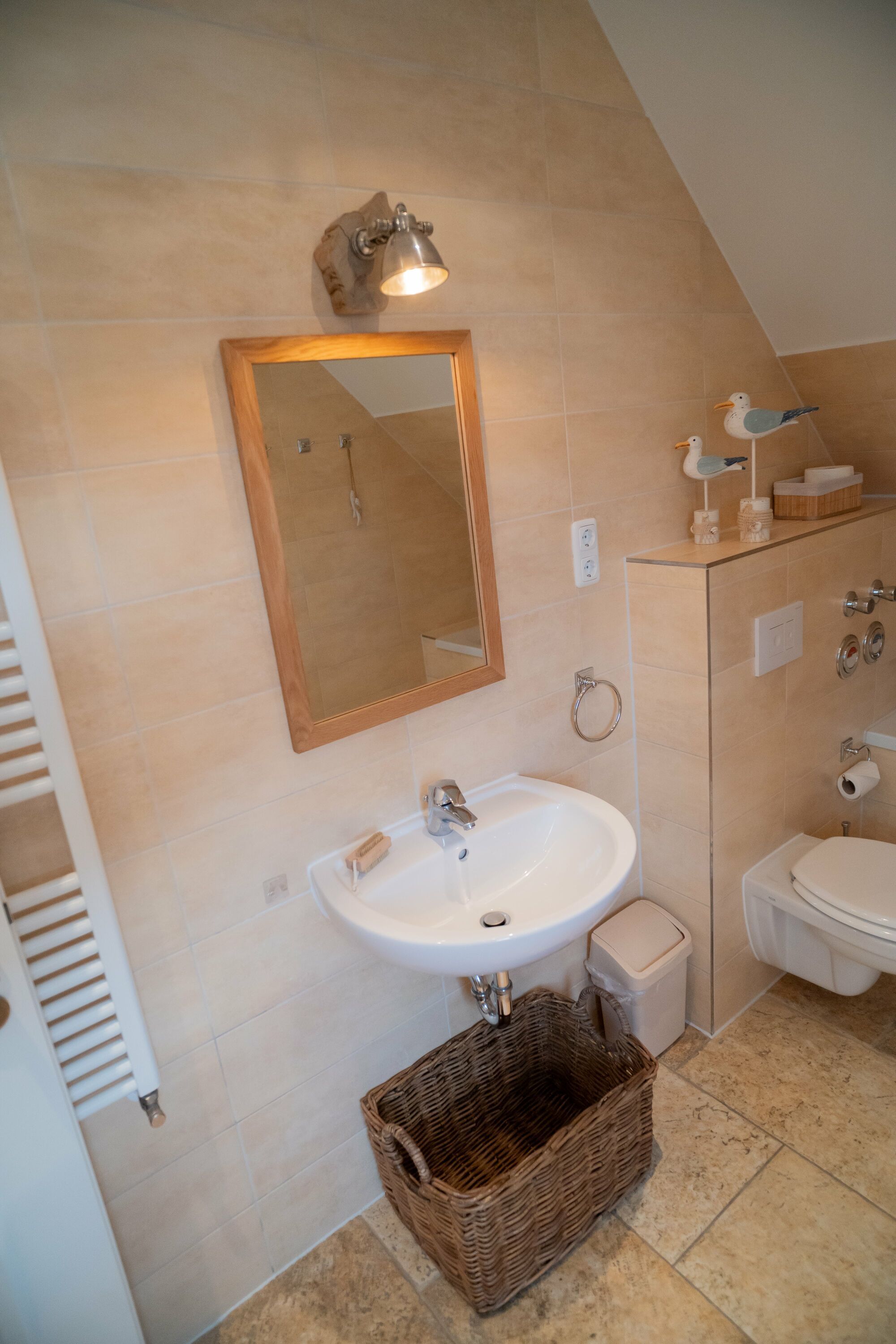 Das Tageslichtbad ist mit einer Badewanne und einer bodenebenen Dusche ausgestattet. Hier können Sie sich erfrischen und entspannen. Ein Wäscheständer ist ebenfalls vorhanden.
