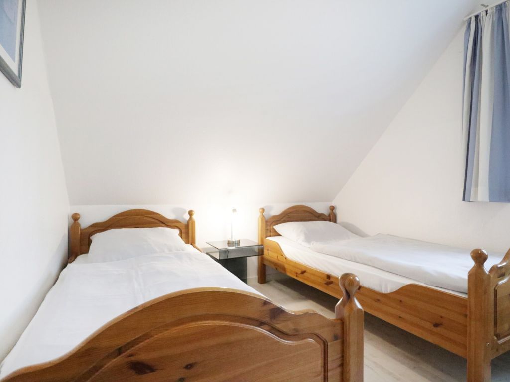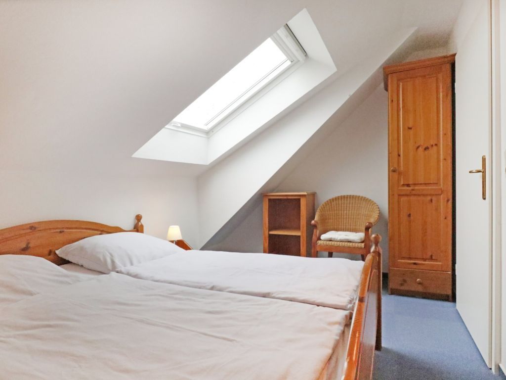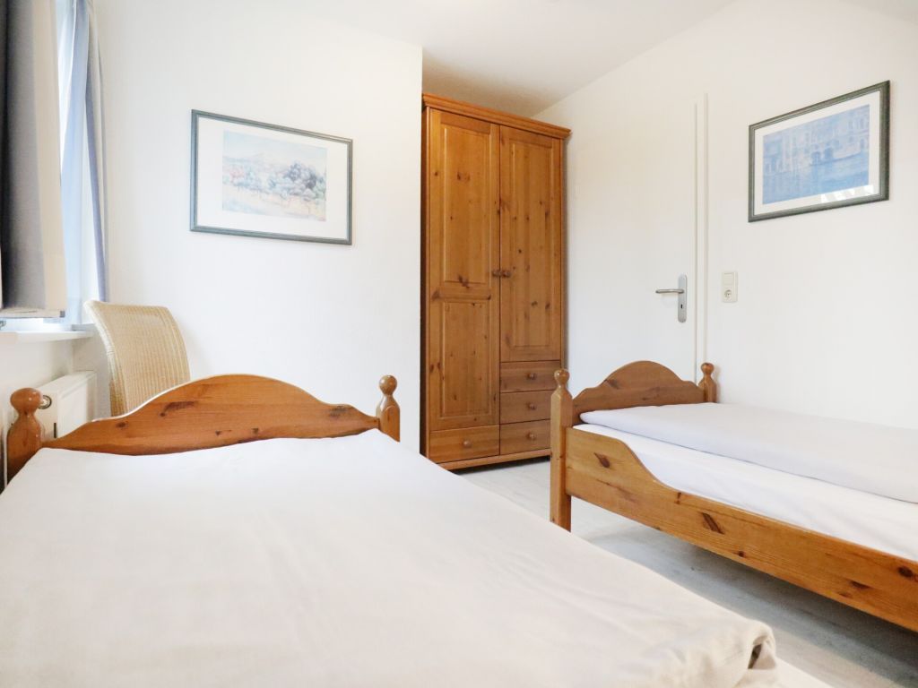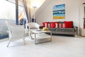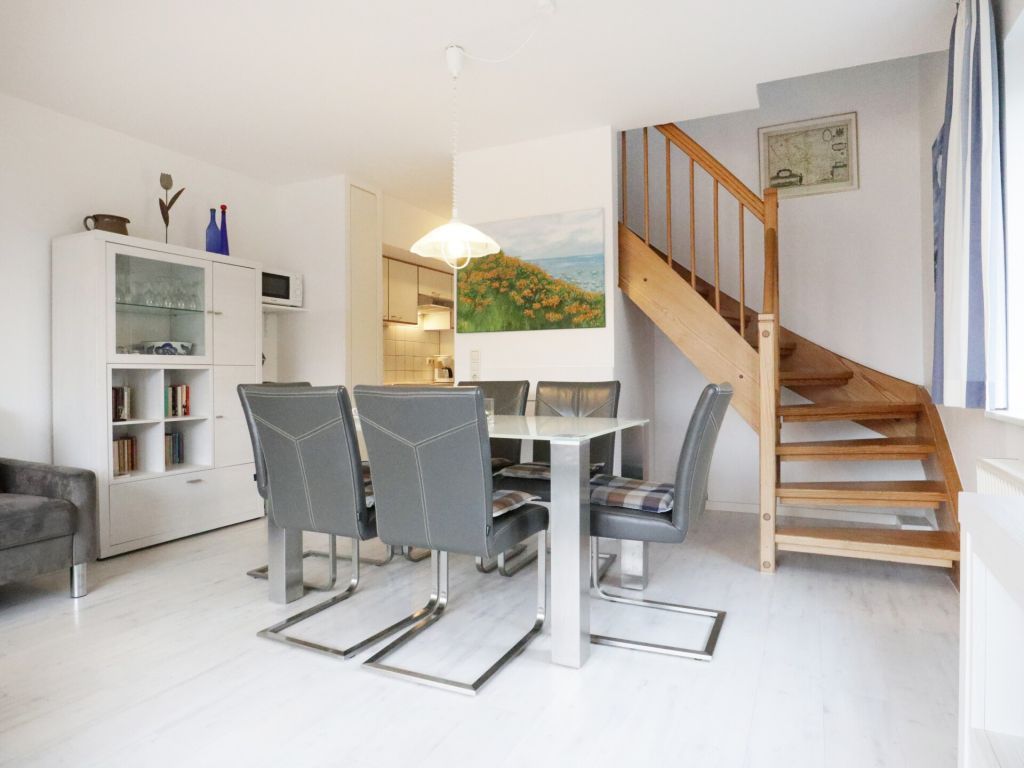 Die behaglich ausgestattete Wohnung befindet sich im 1. Obergeschoss und erstreckt sich über zwei Ebenen. Der im offenen Stil gehaltene Wohn-/Essbereich ist mit einer voll ausgestatteten Küchenzeile eingerichtet, so dass Sie sich bei Bedarf vollkommen eigenständig mit Urlaubsmahlzeiten versorgen können. Ihre gemeinsamen Mahlzeiten nehme Sie am großen Esstisch, oder während der wärmeren Jahreszeit bestimmt gerne auf dem saisonal möblierten Süd-West Balkon zu sich. Technische Unterhaltungselektronik bieten ein Fernseher, Musikanlage sowie kostenfreie WLAN-Nutzung. Die Wohnung besitzt insgesamt drei Schlafzimmer wovon eines mit zwei Einzelbetten und Kleiderschrank eingerichtet ist und sich in der unteren Wohnebene befindet. Ebenso ist ein großzügiges Duschbad mit zwei Waschtischen und WC auf dieser Ebene vorhanden. Über eine leicht geschwungene Holztreppe gelangen Sie in die obere Ebene, wo sich zwei weitere Schlafzimmer mit Doppelbett und Kleiderschank befinden. Im Untergeschoss des Hauses können Hausgäste Waschmaschine und Wäschetrockner gegen Gebühr nutzen. Keine Haustiere. Rauchen ist nicht gestattet. Ihr Fahrzeug parken Sie kostenfrei auf dem zur Wohnung gehörenden PKW-Stellplatz, der sich in unmittelbarer Nähe zum Haus befindet. Sollten Sie weitere Stellplätze benötigen, so stehen am Ortseingang kostenfreie Flächen nach Verfügbarkeit bereit, oder Sie nutzen die innerörtlichen kostenpflichtigen Parkplätze.