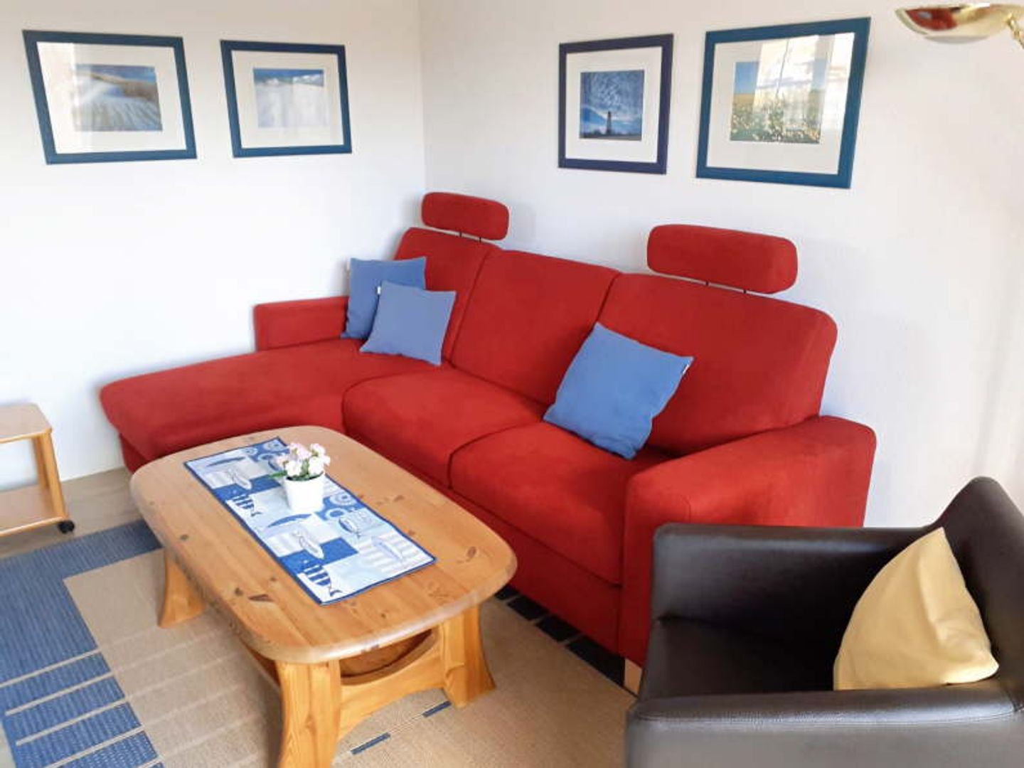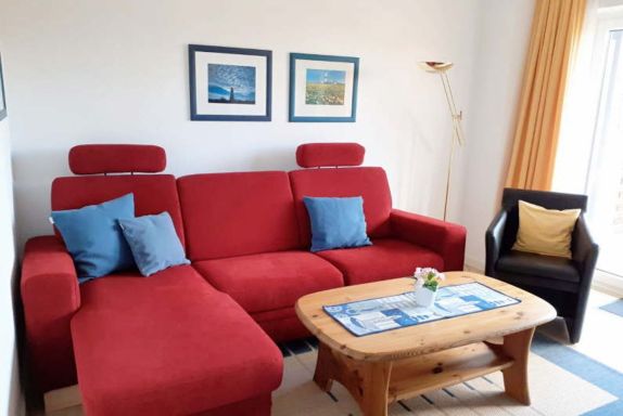 Innen erwartet Sie ein gemütliches Wohnzimmer mit Sofa und Sessel, ideal für entspannte Lesestunden oder einen Filmabend nach einem Tag am Meer. Die Küche mit angrenzendem Essbereich bietet alles, was Sie für ein Frühstück oder ein gemeinsames Abendessen benötigen. Das Schlafzimmer mit komfortablem Doppelbett sorgt für erholsame Nächte, und das moderne Duschbad rundet das stimmige Gesamtbild ab.