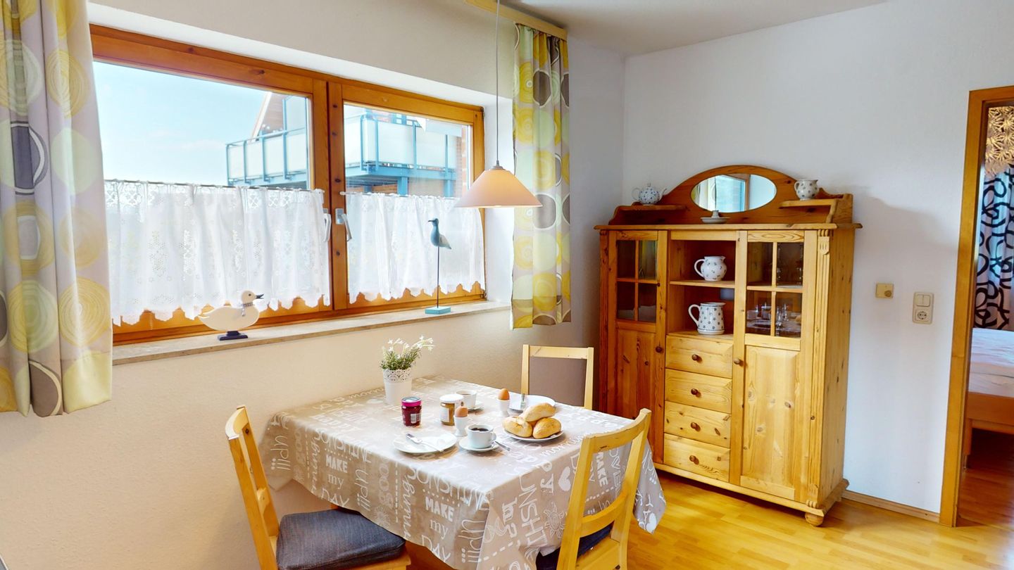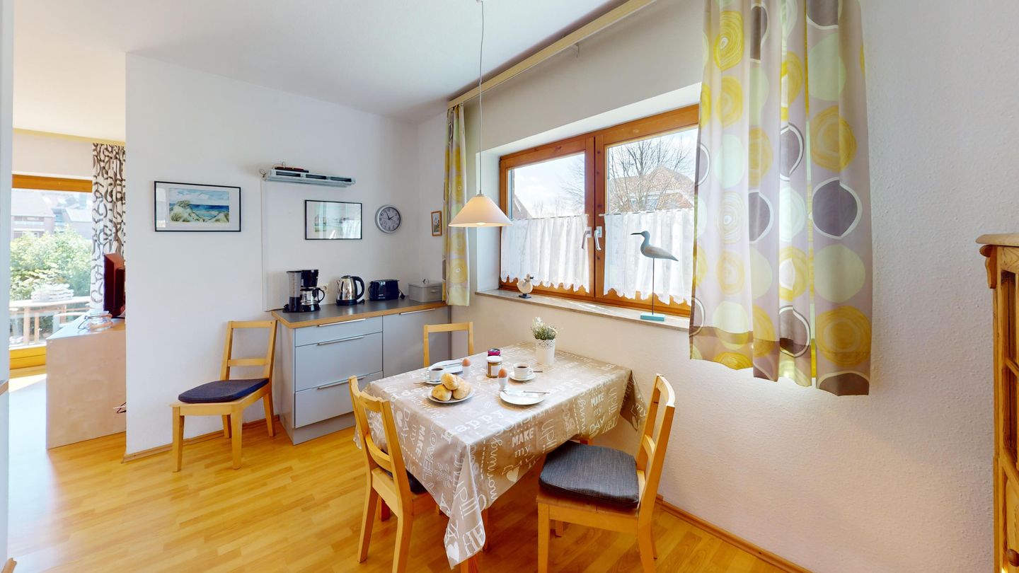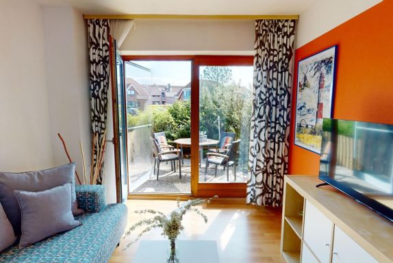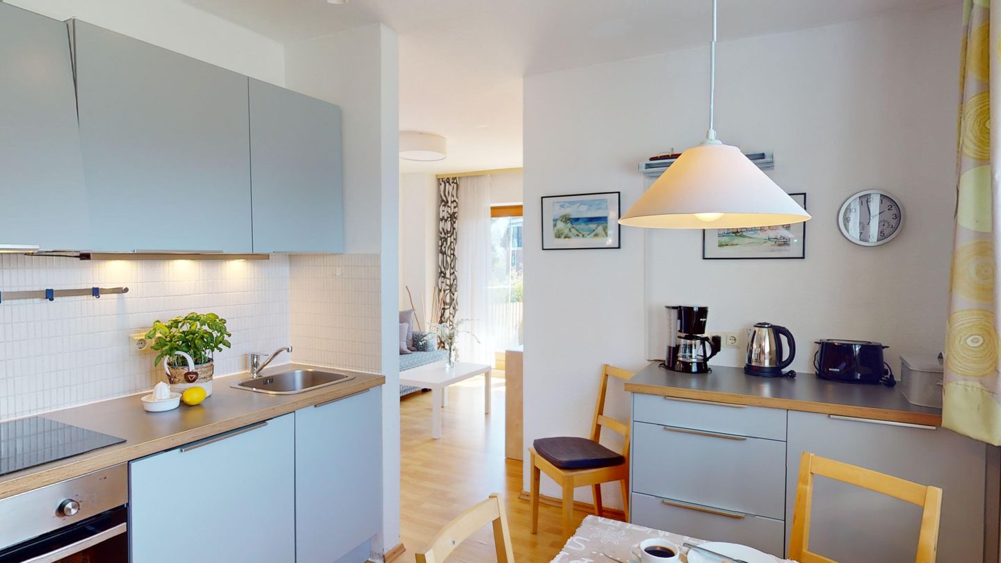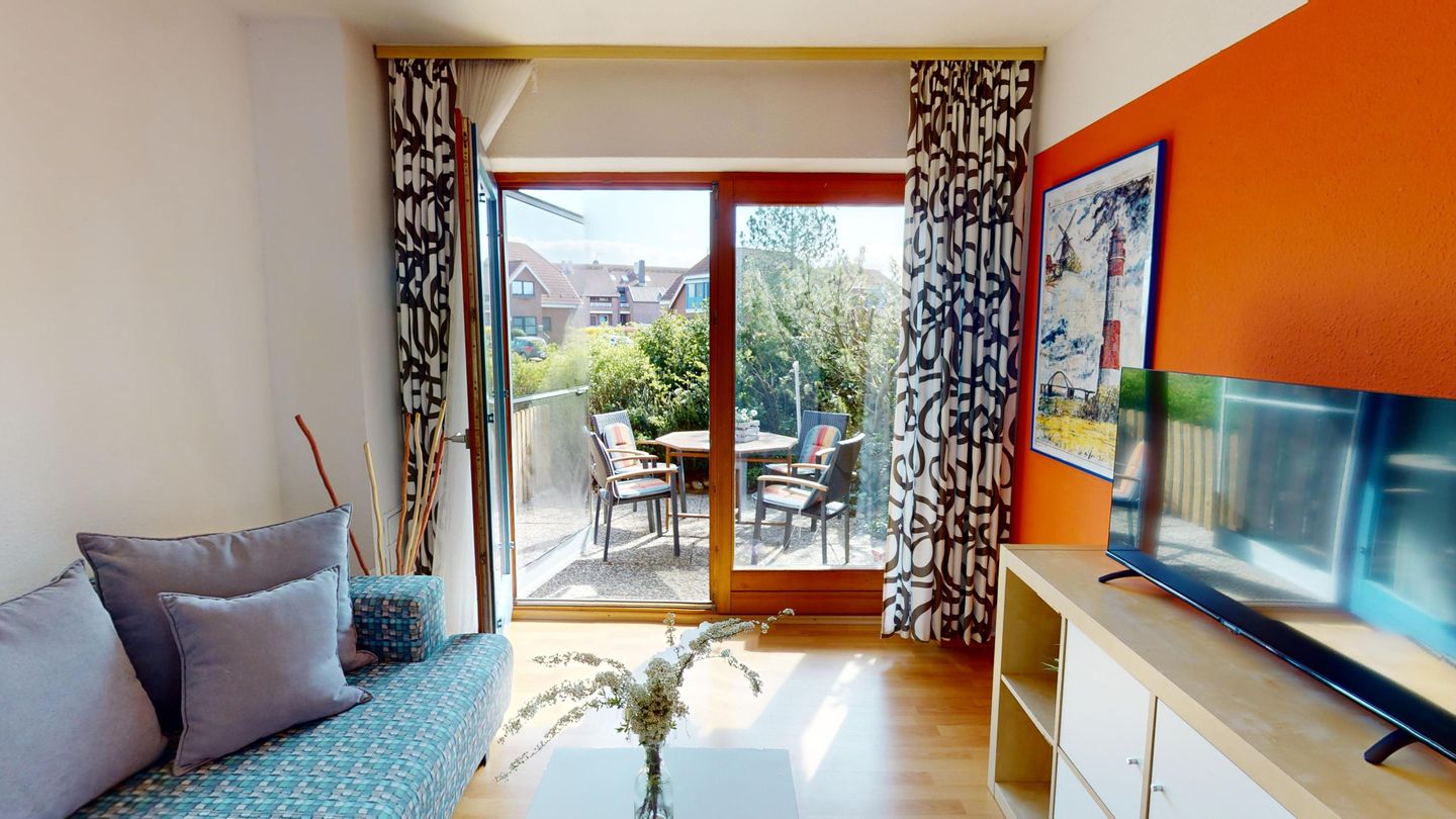 Die Wohnung liegt im Erdgeschoss des Hauses Nr. 40 in der Ferienanlage Lemkenhafen (5 Stufen vor der Haustür), die insgesamt vier Wohnungen umfasst. Es gibt ein gemütliches Wohnzimmer mit einem Sofa, das als Schlafmöglichkeit für zwei Personen dient. Außerdem verfügt die Wohnung über eine Küche mit anschließendem, schönen Essbereich sowie ein Schlafzimmer mit Doppelbett und ein Duschbad.