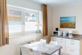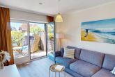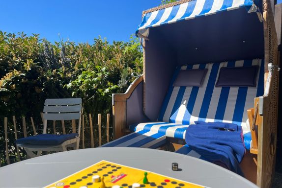 Ein echtes Highlight: die sonnige Terrasse in Süd/West-Lage mit eigenem Strandkorb – genießen Sie hier die frische Meeresluft, Sonnenuntergänge und entspannte Stunden mit einem guten Buch oder einem kühlen Getränk.