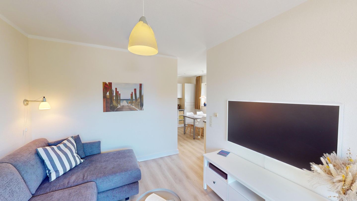 Das gemütliche Wohnzimmer ist nicht nur ein Ort zum Entspannen, sondern wird mit dem hochwertigen Schlafsofa (inkl. 1,40 m breiter Matratze) zur bequemen Schlafmöglichkeit für zwei Personen. Für Unterhaltung am Abend sorgt ein großer 55-Zoll Smart-TV – ob Familienfilm, Lieblingsserie oder Streaming-Abenteuer.