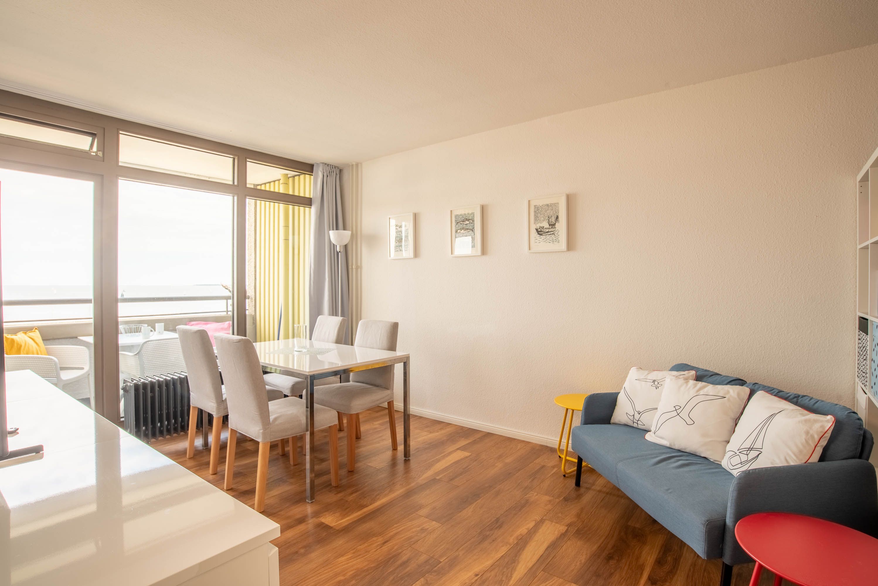 Im angrenzenden Raum befindet sich der Wohn-, und Schlafbereich. Bodentiefe Fenster lassen den Raum hell erleuchten. Hier steht Ihnen ein Esstisch für bis zu 4 Personen zur Verfügung. Von dort aus gelangen Sie direkt auf den überdachten Balkon mit Meerblick. Durch einen Raumteiler wurde der Schlafbereich separiert. Dort befinden sich zwei Einzelbetten (90x200), die sich natürlich auch zusammenschieben lassen. Der gesamte Raum lässt sich mit Vorhängen verdunkeln. In einem weiteren Raum befindet sich ein französisches Bett 140x200 und ein Schreibtisch. Auch aus diesem Zimmer können Sie einen wunderbaren Meerblick genießen.