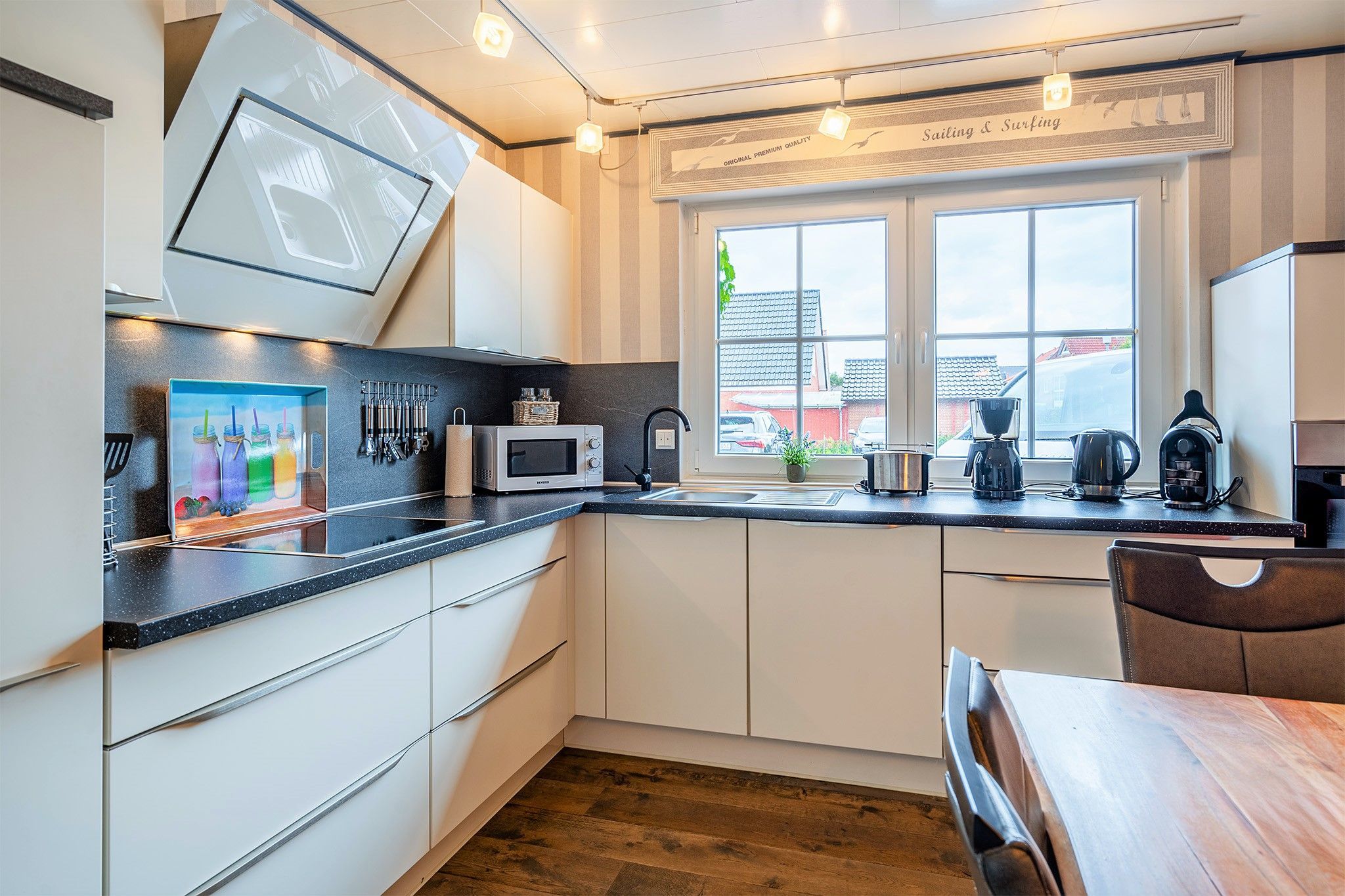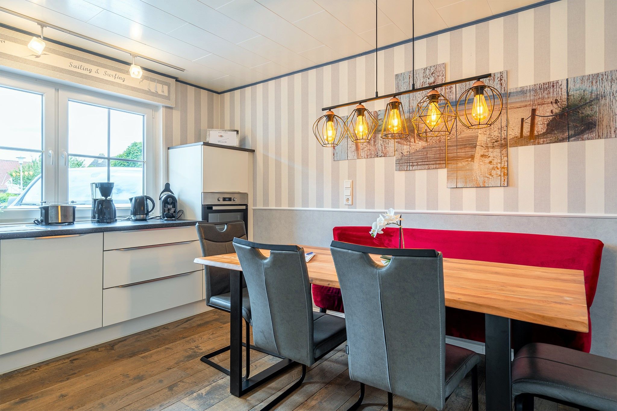 Das Kamin Apartment bietet Ihnen auf rund 75qm eine stilvolle Kombination aus traditionellem Charme und modernem Komfort. Die im Erdgeschoss gelegene Ferienwohnung wurde mit viel Liebe zum Detail renoviert besondere Akzente wie der originale Friesen-Kachelofen sorgen für eine behagliche Atmosphäre und laden nach einem erlebnisreichen Tag zum Entspannen ein. Die Wohnung verfügt über einen hellen Wohnbereich mit großem Sofa, eine voll ausgestattete separate Küche mit großzügiger Sitzecke sowie zwei gemütliche Schlafzimmer, wovon eines ein normal großes Doppelbett und das zweite ein 1,40m breites Bett bietet. Ein besonderes Highlight: Von einem der Schlafzimmer genießen Sie einen direkten Blick auf die berühmte grüne Mühle der Region. Zwei Terrassen erweitern den Wohnraum ins Freie eine davon ist überdacht und mit einer komfortablen Sitzgruppe ausgestattet, die andere bietet Sonnenliegen und einen freien Blick auf die Mühle perfekt für entspannte Stunden im Freien. Auch Hunde sind im Kamin Apartment herzlich willkommen. Für Ihren Komfort stehen Ihnen ein eigener PKW-Stellplatz sowie eine überdachte Abstellmöglichkeit für Fahrräder zur Verfügung. Die Wohnung verfügt über zwei Fernseher, einer befindet sich im Wohnzimmer, der andere in dem Schlafzimmer mit dem 1,4m großen Bett.