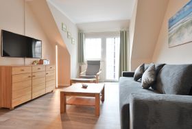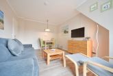 Das Wohnzimmer ist mit einem bequemen Sofa mit Schlaffunktion, Lesesessel, Sideboard , großem Smart-TV und einem Essbereich mit 4 Stühlen eingerichtet. Von hier aus haben Sie Zugang zum Balkon mit Markise, der in Richtung Garten zeigt.