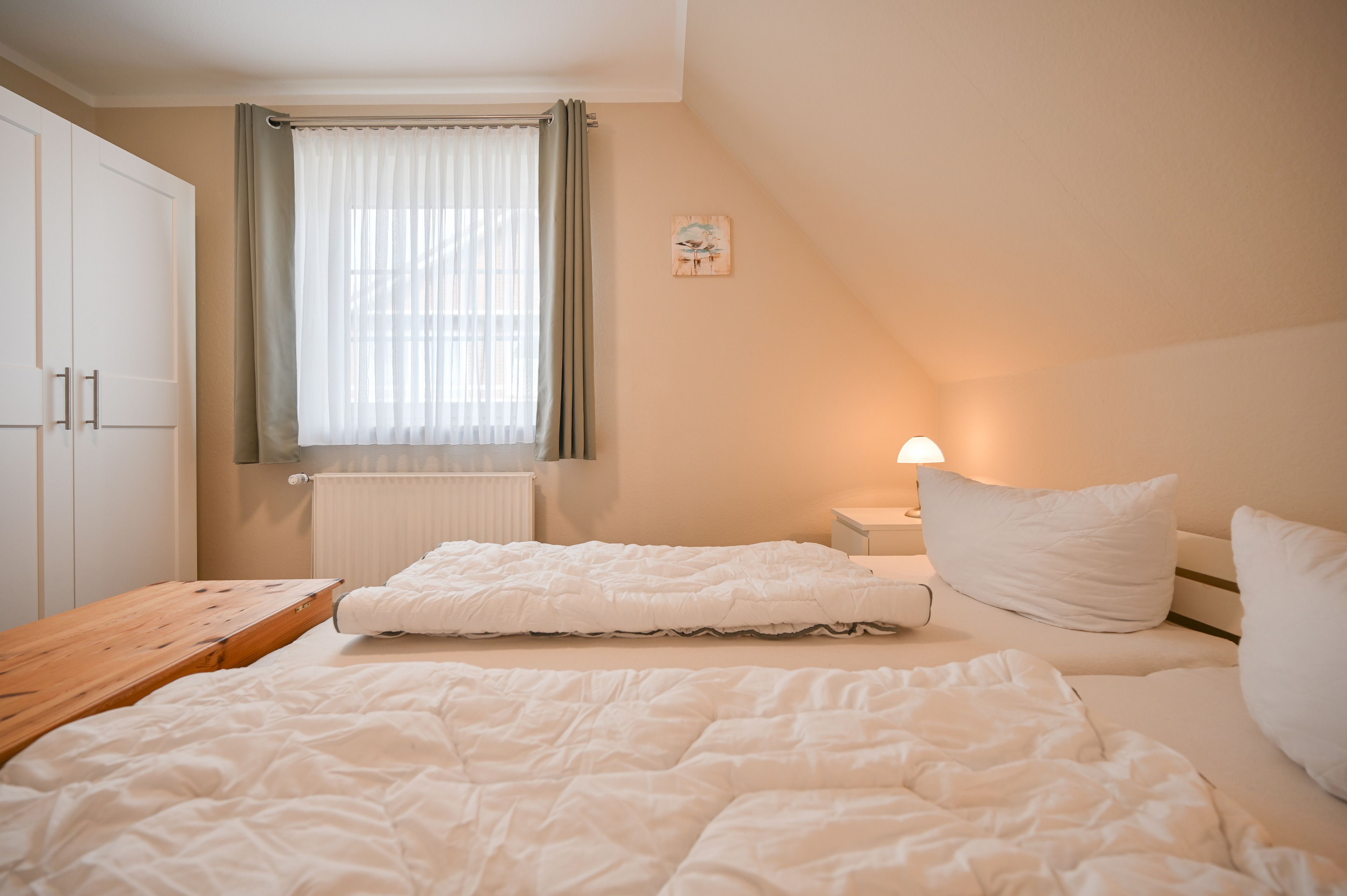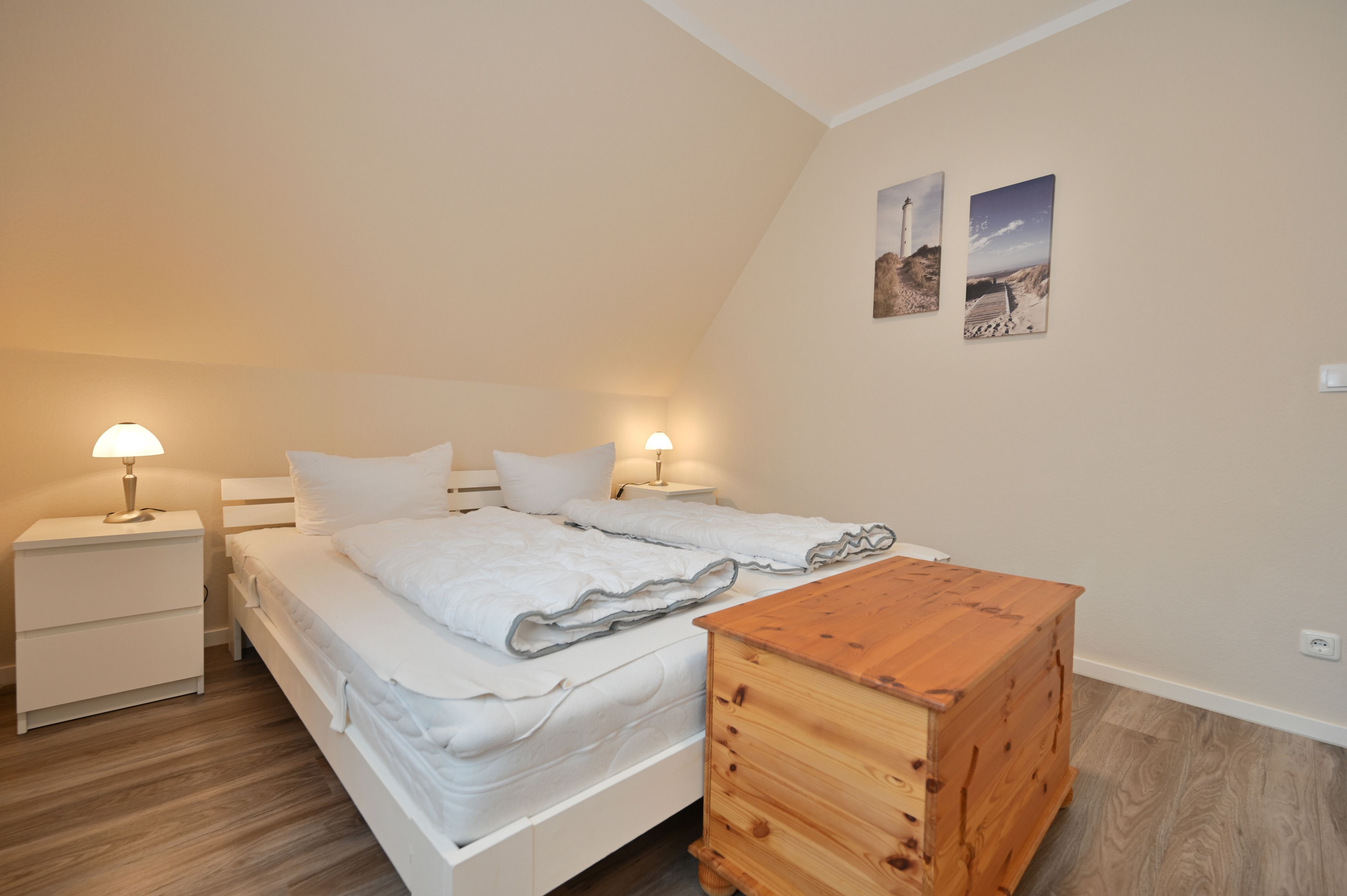 Im Schlafzimmer befindet sich ein Doppelbett (180x200 cm), zwei Nachtschränkchen mit Leseleuchte und ein Kleiderschrank.