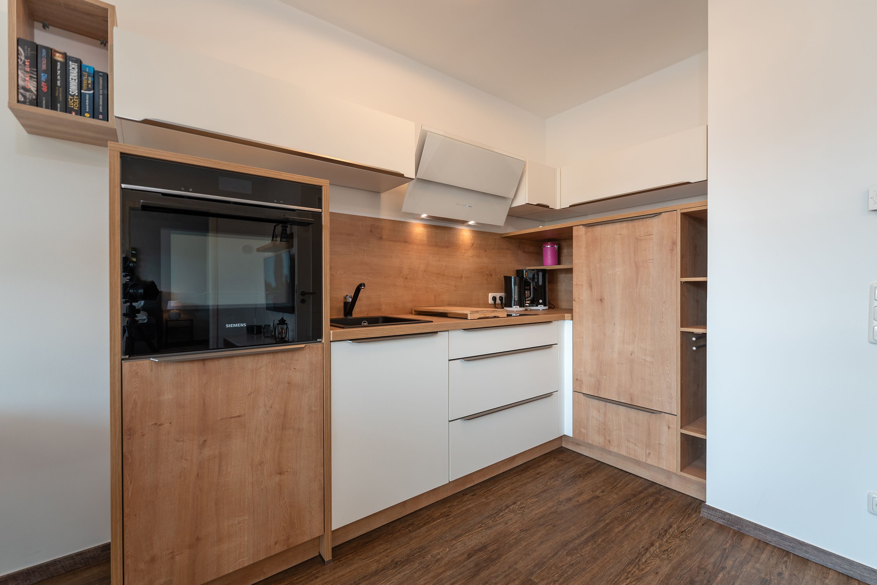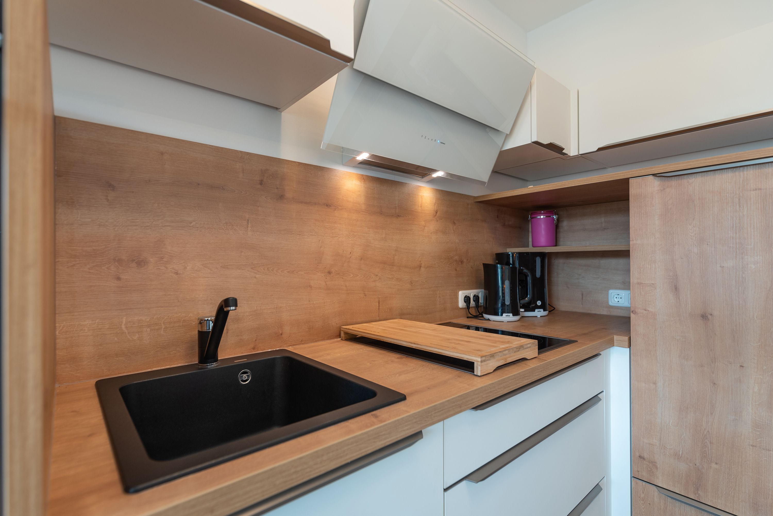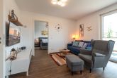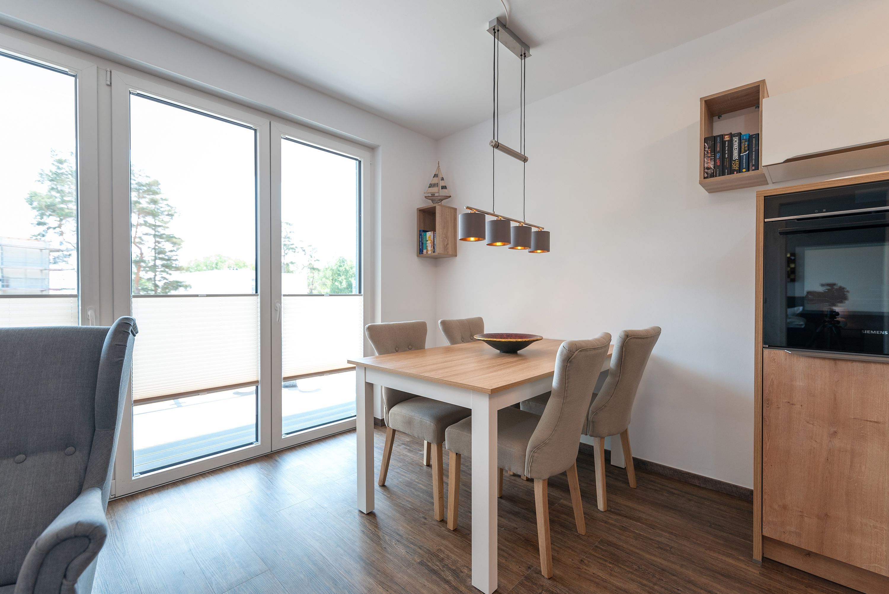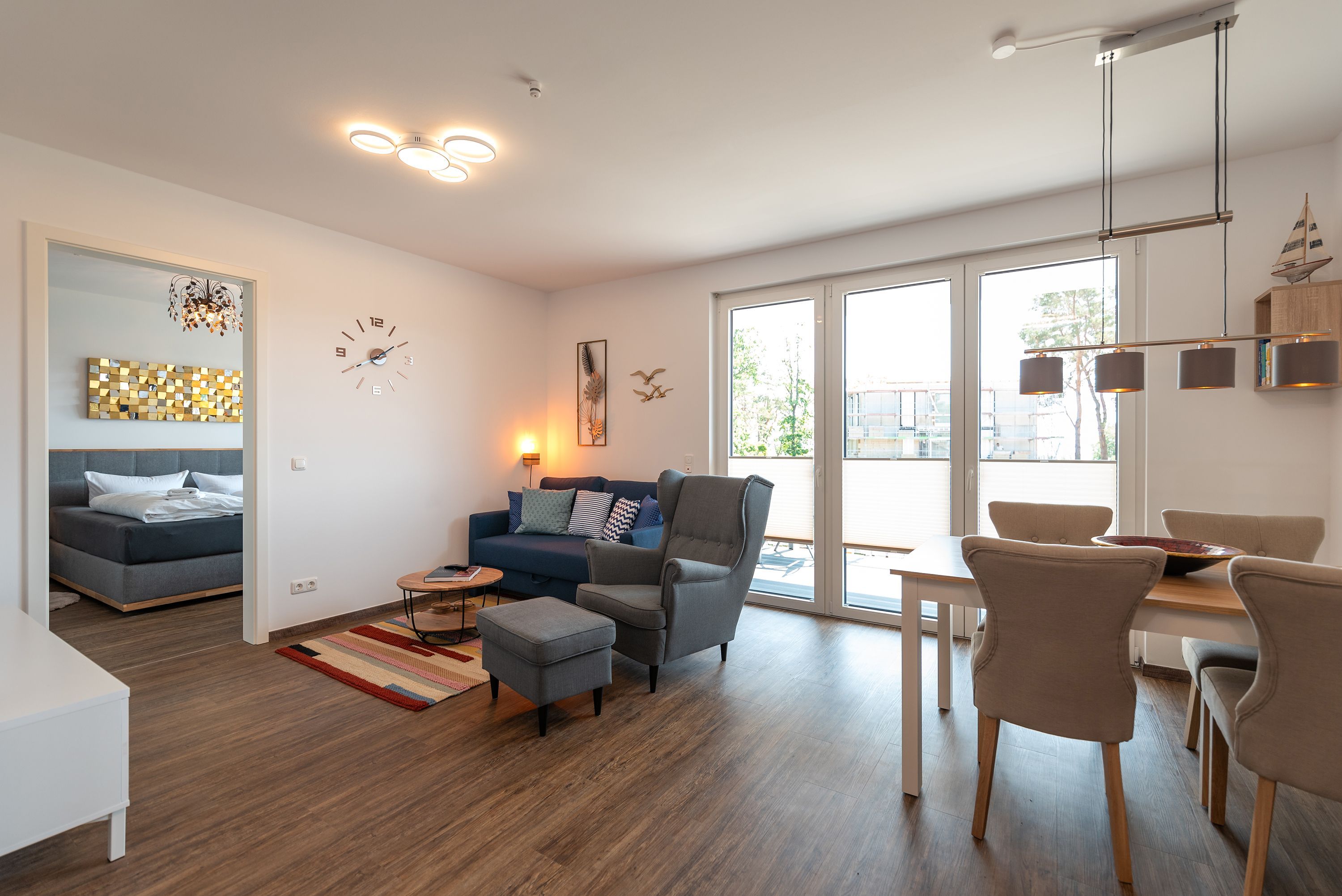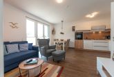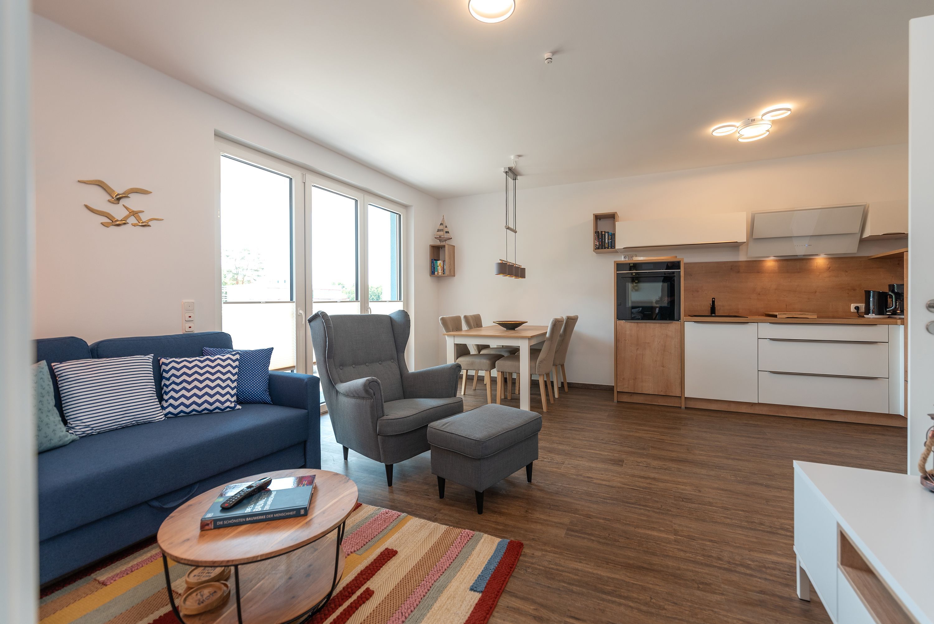 Das hell und modern eingerichtete Wohnzimmer verfügt über eine bequeme Couch, die sich zu einer Schlafcouch (140 cm x 200 cm) umwandeln lässt, und einen 55-Zoll Flatscreen Fernseher. Die offene Küche ist hochwertig ausgestattet mit einem Backofen mit Mikrowellenfunktion, Ceranfeld, Kühl-/Gefrierkombination, Geschirrspüler und bietet alles Nötige für den gedeckten Tisch am großen Esstisch.