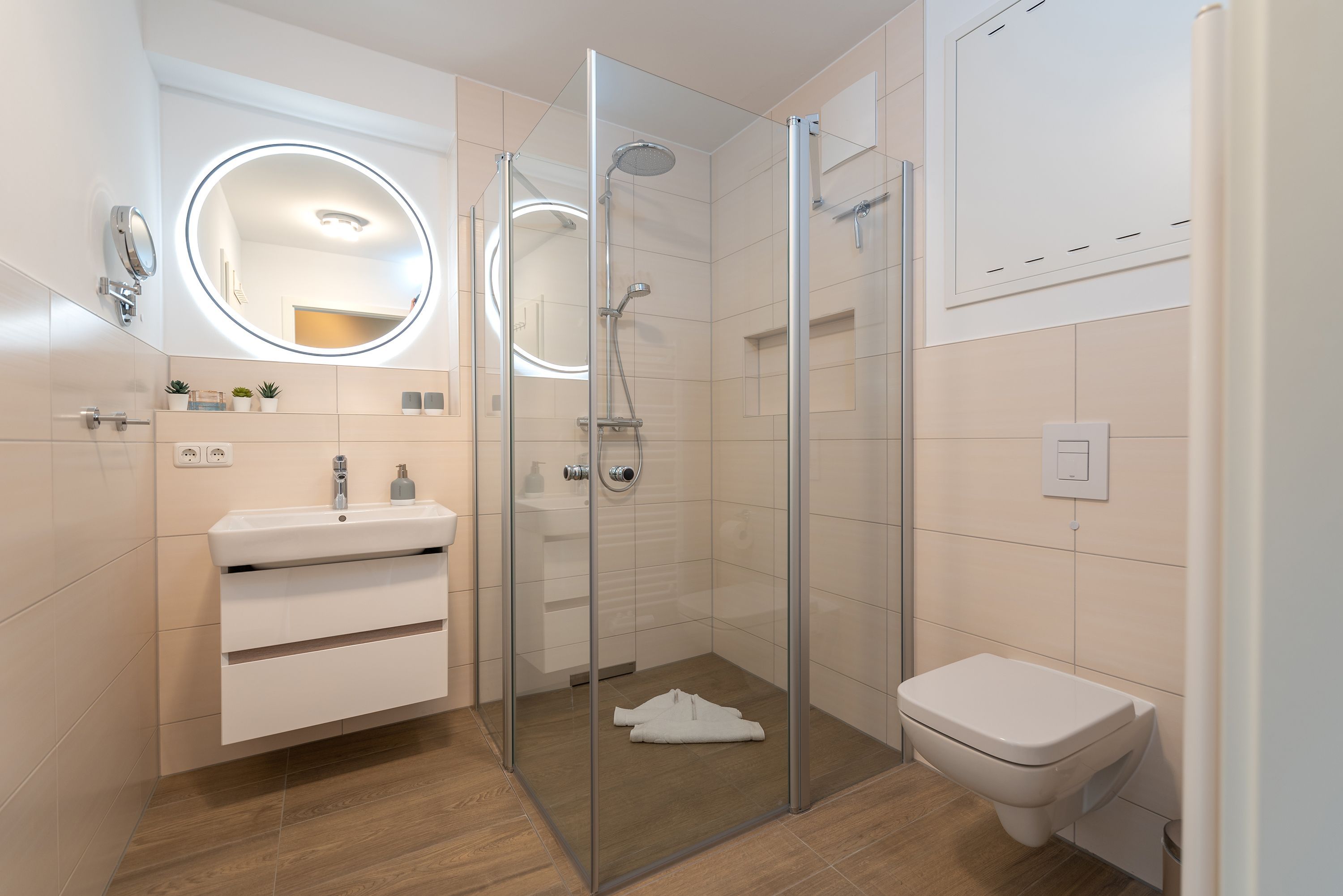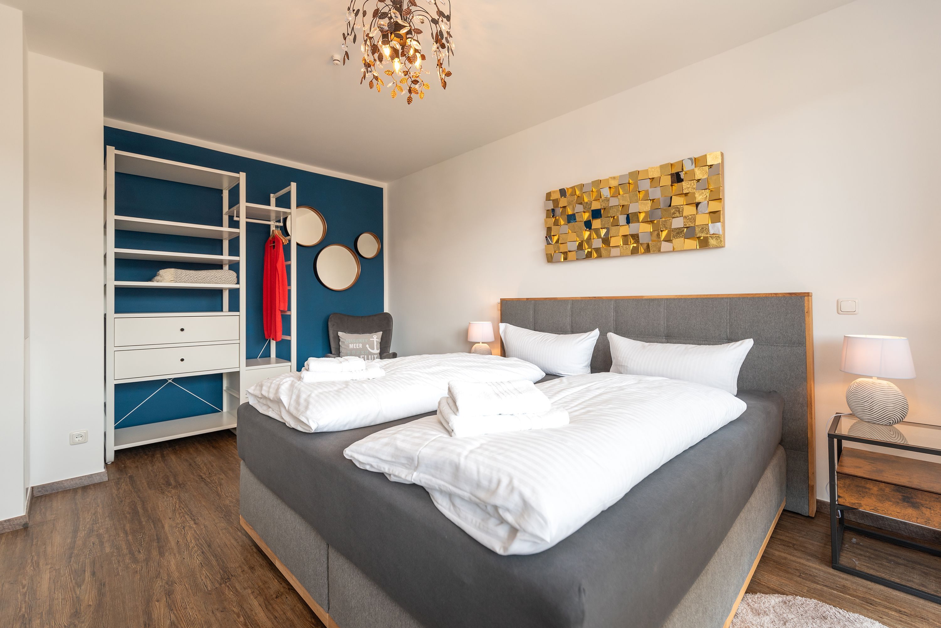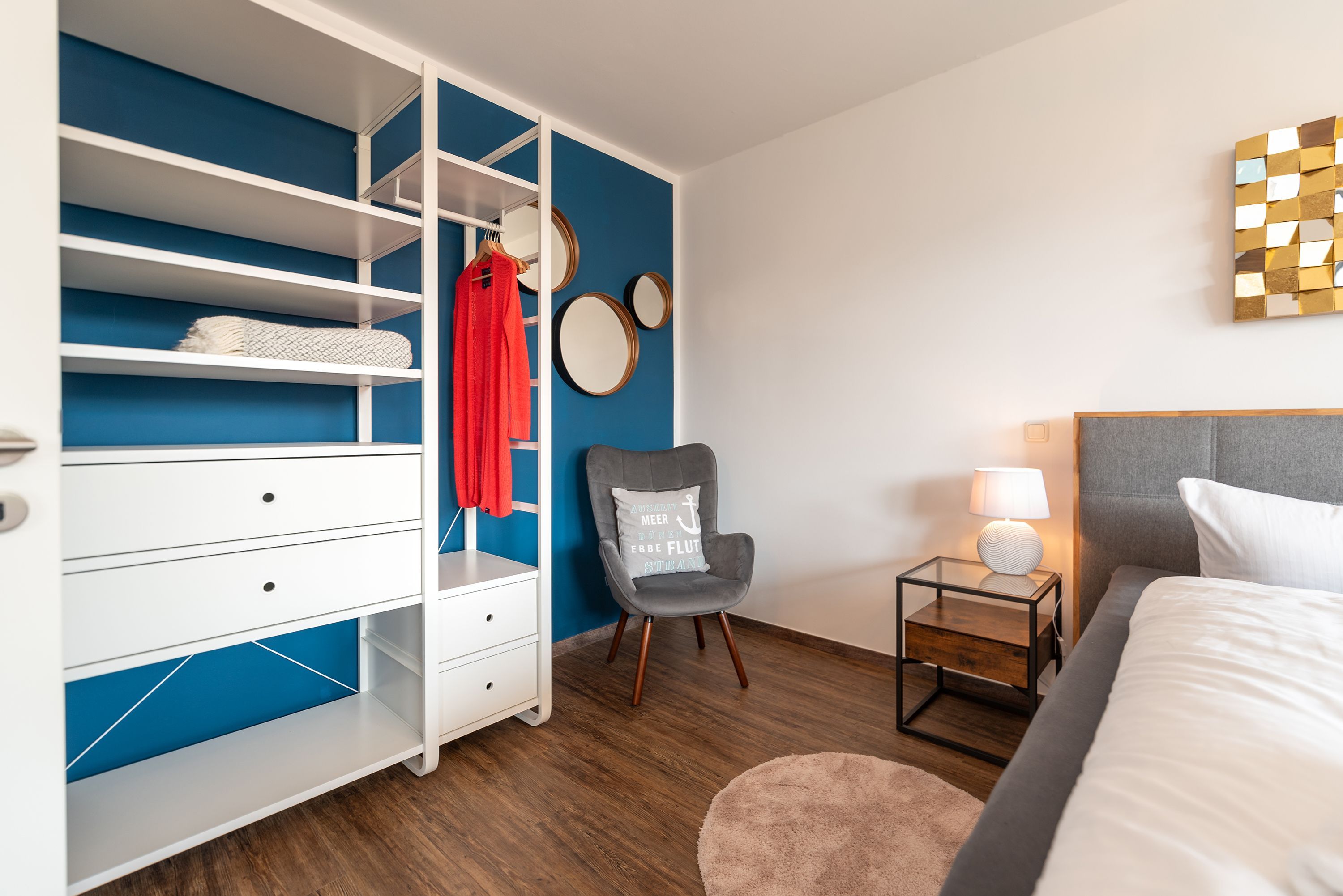 Im Schlafzimmer sorgt ein Boxspringbett (180 cm x 200 cm Liegefläche) für erholsamen Schlaf, und der offene Kleiderschrank bietet ausreichend Stauraum. Das Badezimmer ist mit einer großen ebenerdigen Dusche, WC, Föhn und Handtuchheizung ausgestattet. Fußbodenheizung in allen Räumen sorgt für Wärme und Komfort.