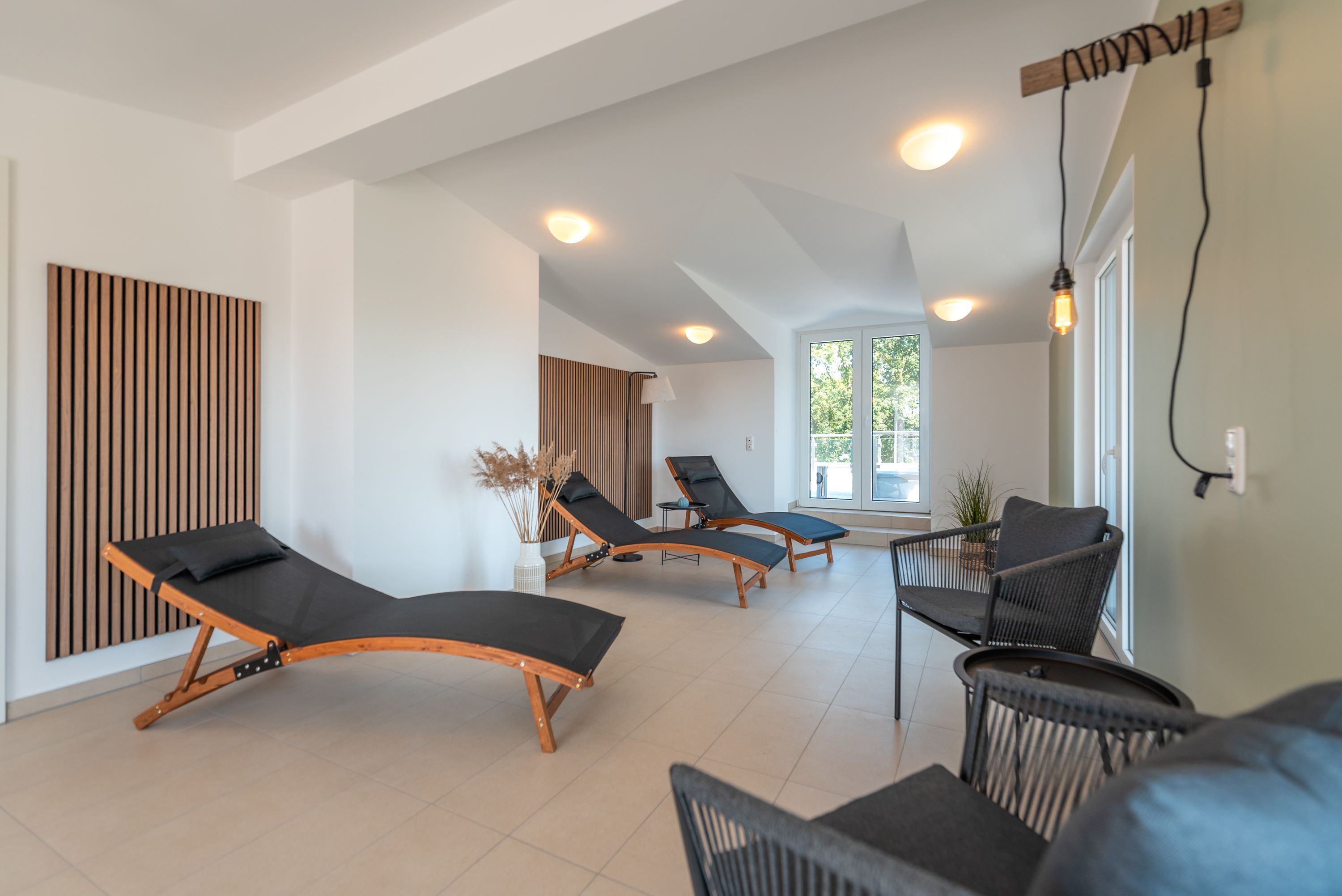 Der hauseigene Wellnessbereich im Dachgeschoss umfasst drei Saunen, einen gemütlichen Ruheraum und eine Dachterrasse mit beeindruckendem Ausblick. Ein Gemeinschaftsbereich im Nebengebäude bietet Freizeitmöglichkeiten wie Billard, Tischkicker, Airhockey und Tischtennis, eine Spielecke für Kinder und einen Fitnessraum.