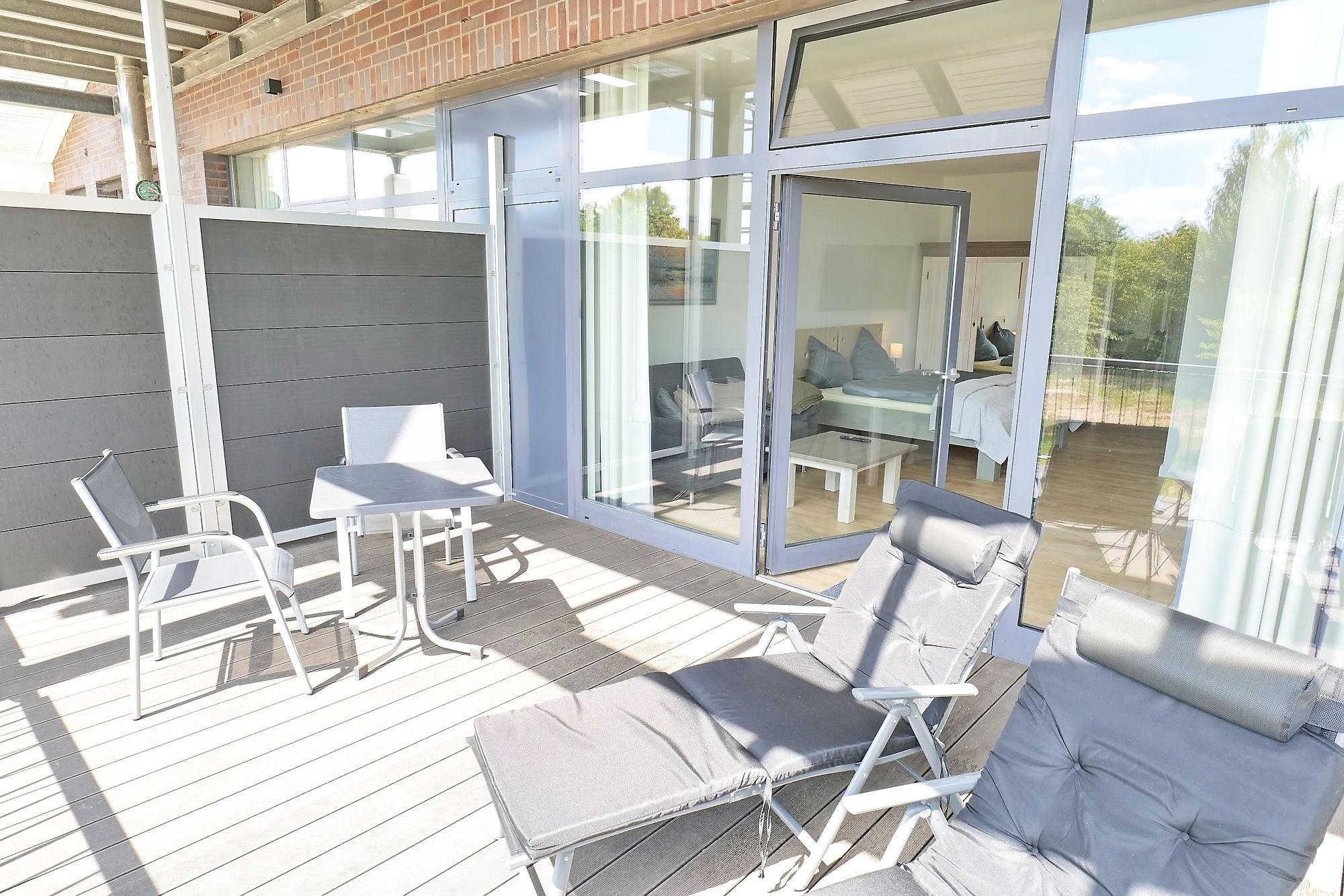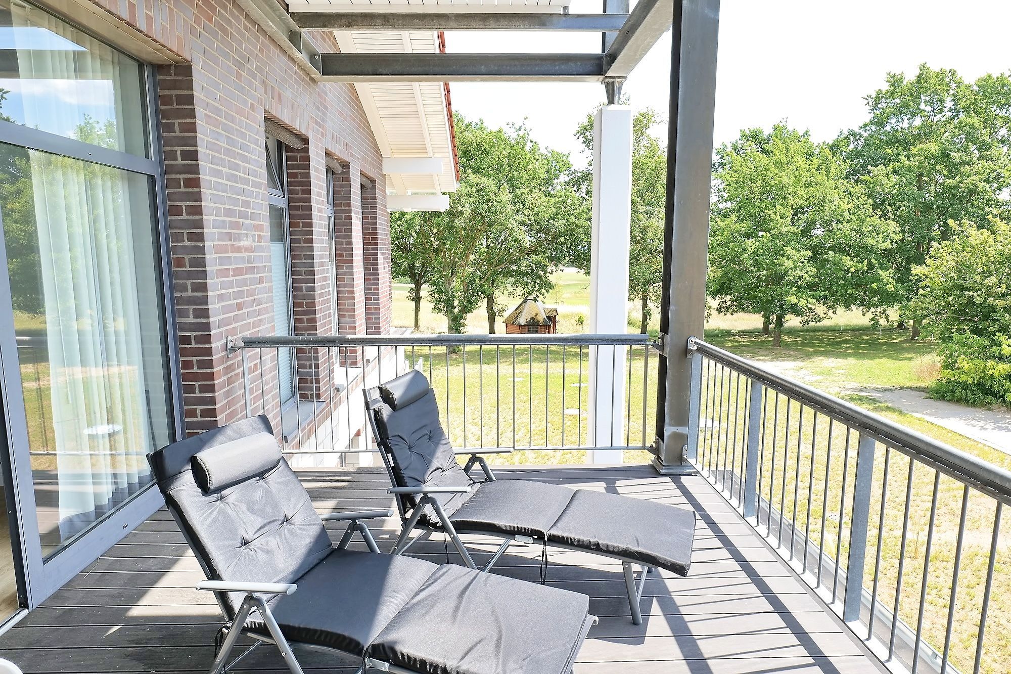 - großer Balkon mit 2 Stühlen, Tisch und 2 Sonnenliegen