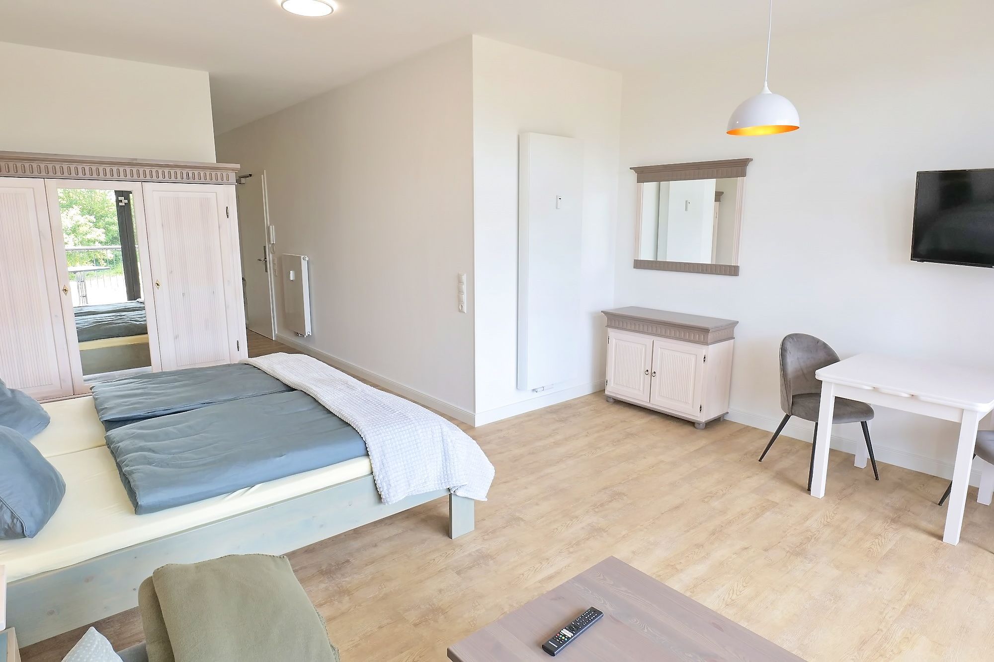 - großes Wohn-/Schlafzimmer mit Doppelbett, Couch, Low-Board, Flat-TV