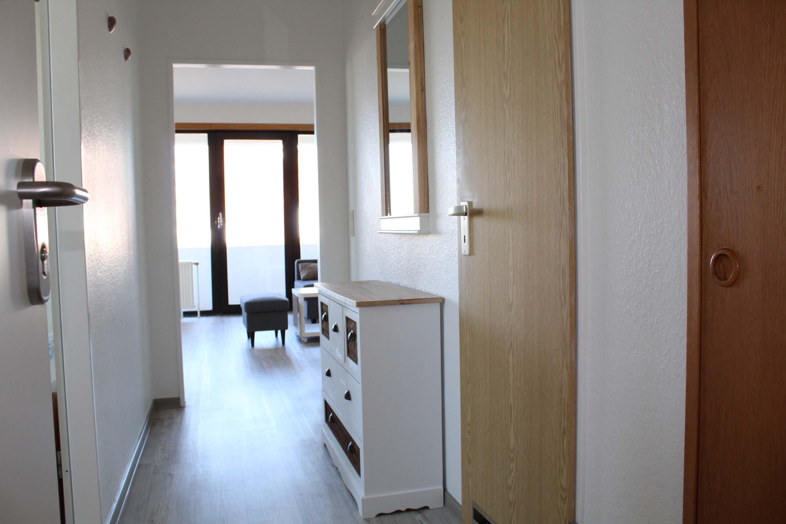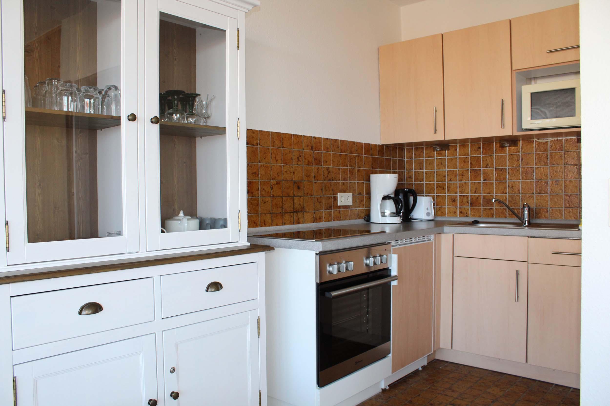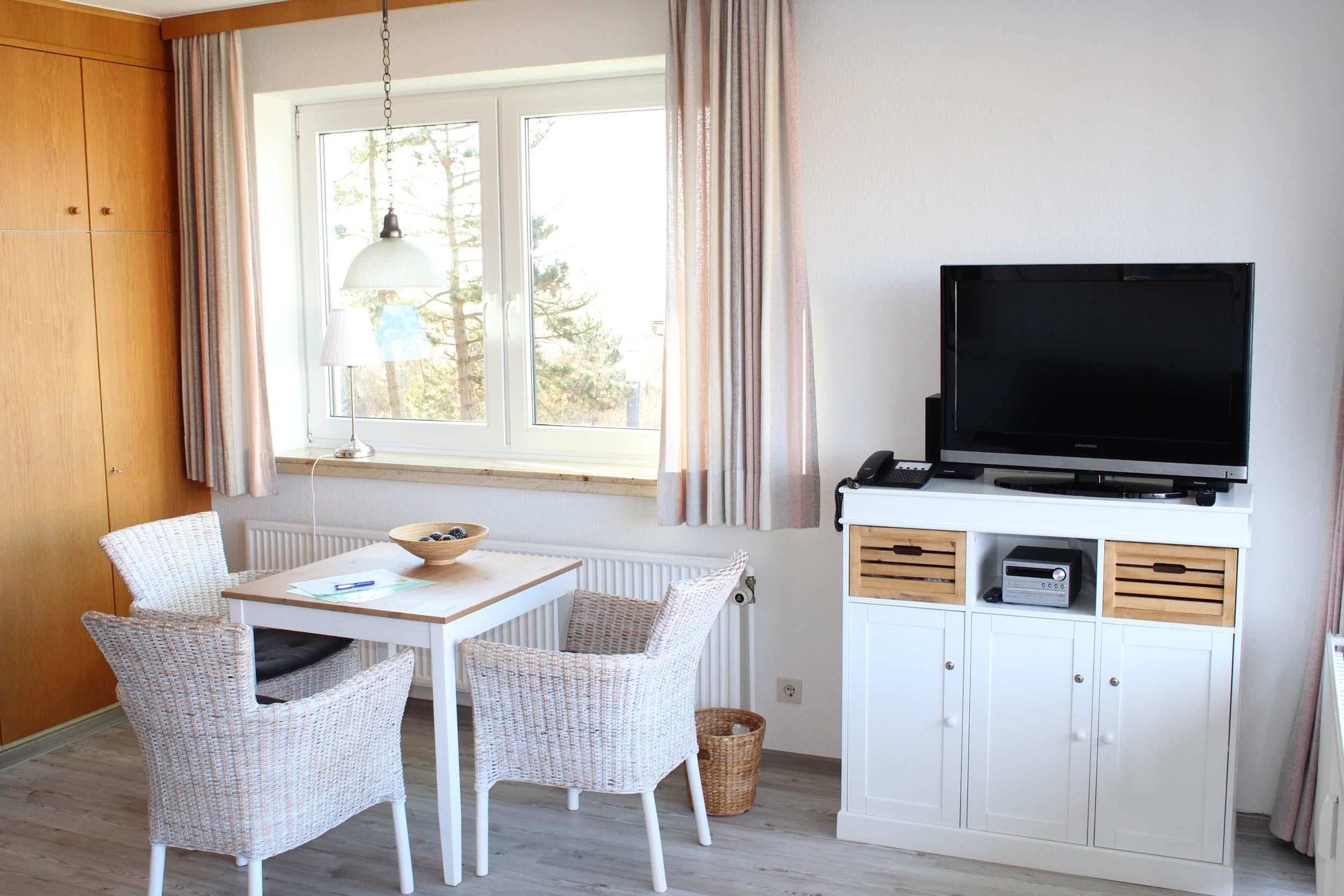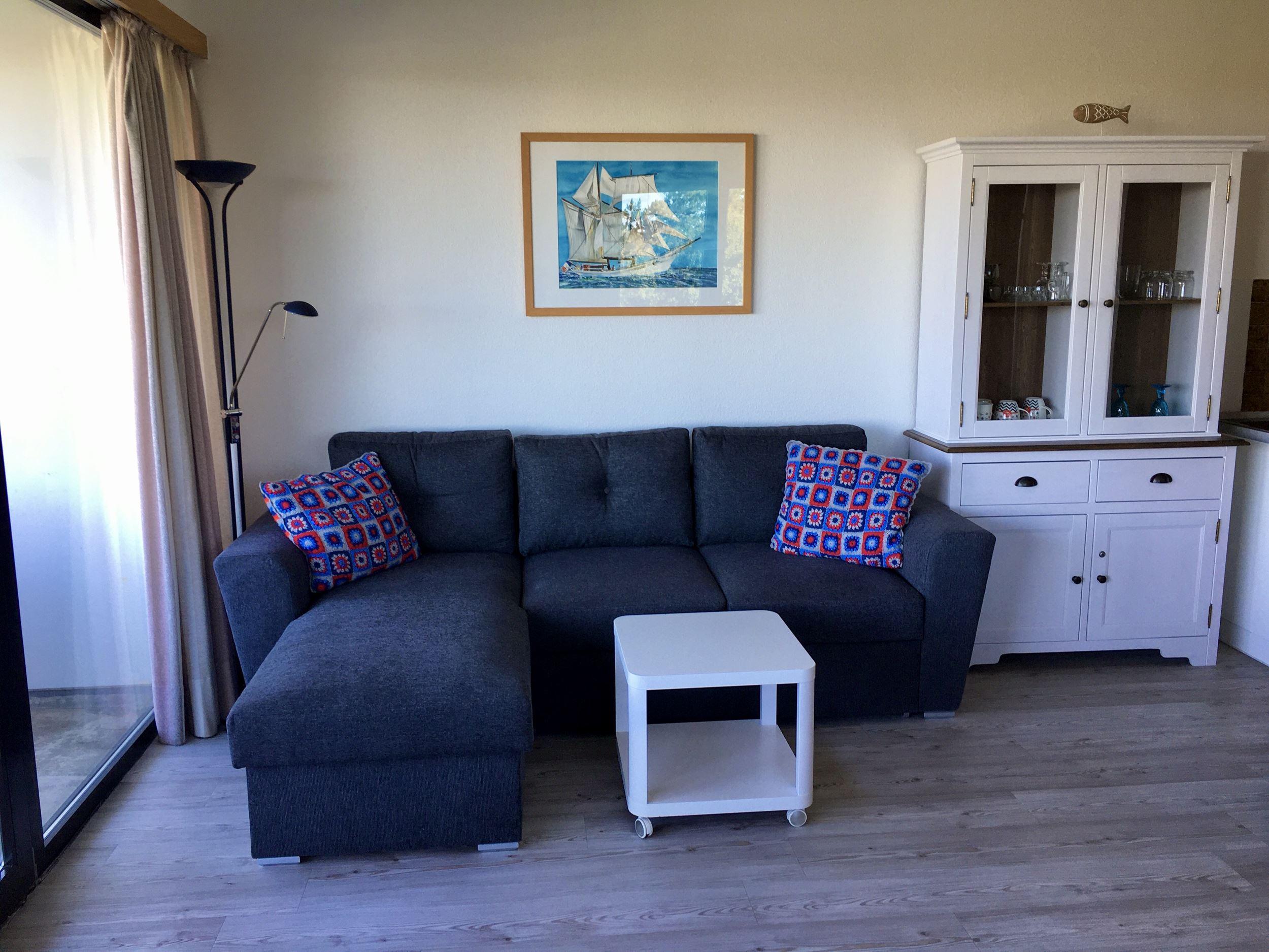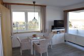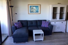 Schlafraum mit 2 Einzelbetten (je Bett 190 x 90), Wohn-Schlafraum mit Schlafcouch (200 x 80) für 1 Person, Essecke, Küchenzeile mit Mikrowelle, Backofen und Geschirrspüler, PVC-Boden, Dusche/WC, Kabel-TV, Durchwahltelefon, Balkon, PKW-Platz-Nr. 38, Aufzug und Fahrradkeller vorhanden. Rezeption, Brötchenservice, Schwimmbad, Sauna kostenpflichtig, kostenfreier Internetzugang (LAN1-Germania).