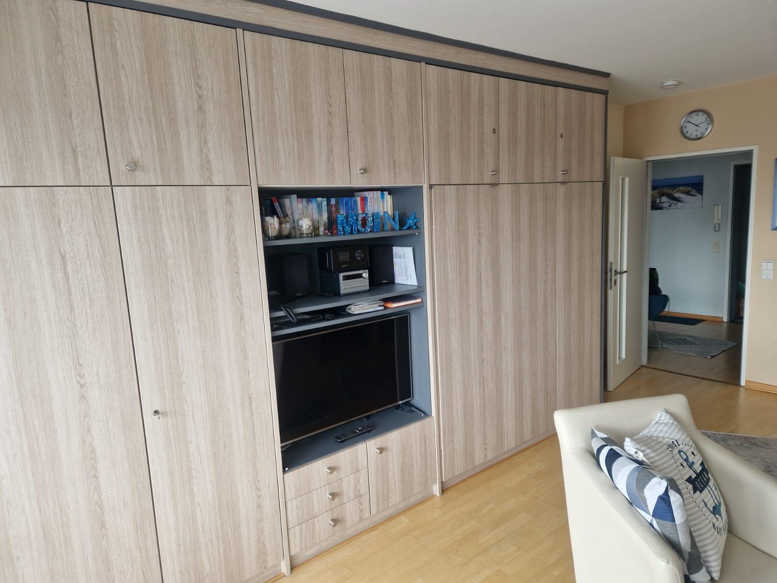 Schlafraum mit 2 Einzelbetten, Wohn-Schlafraum mit 2 Wandschrankbetten, Parkettfußboden, Sitzecke, Essecke, Küchenzeile mit Backofen, Geschirrspüler, Dusche/WC, Kabel-TV, Durchwahltelefon, Balkon, PKW-Platz-Nr. 46, Aufzug und Fahrradkeller.