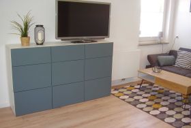 Großzügiger offener Wohn-/Essbereich mit moderner, hochwertiger Wohnlandschaft, grosser Flachbildfernseher mit SAT-TV. Esstisch mit Bestuhlung.
