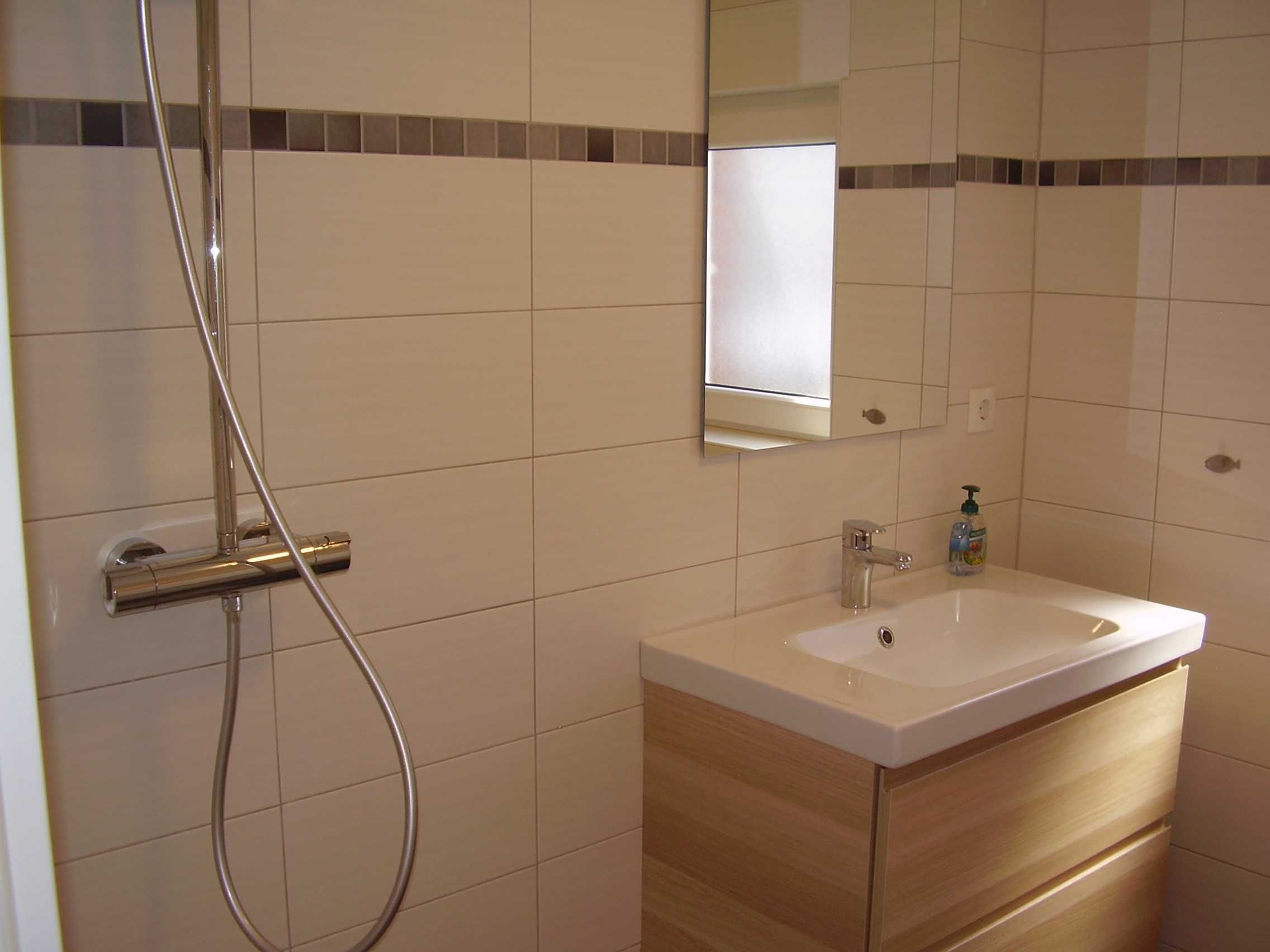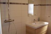 Tageslicht Badezimmer mit ebenerdiger Dusche und WC.