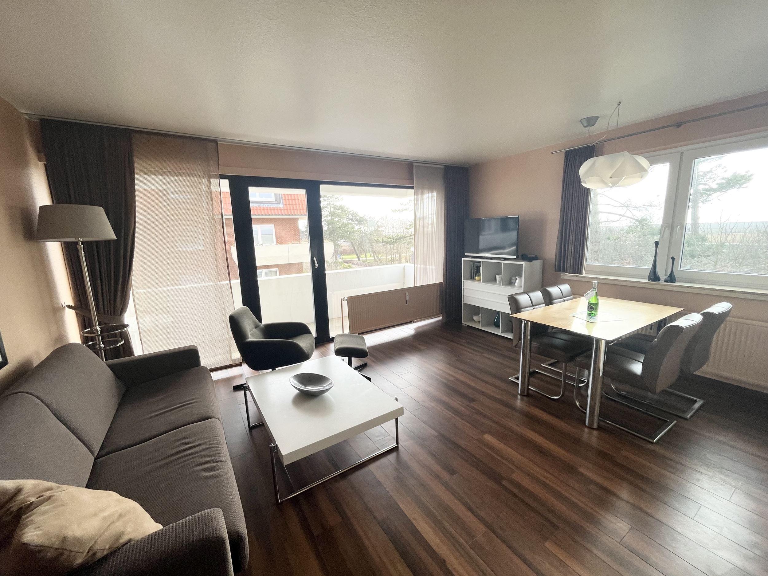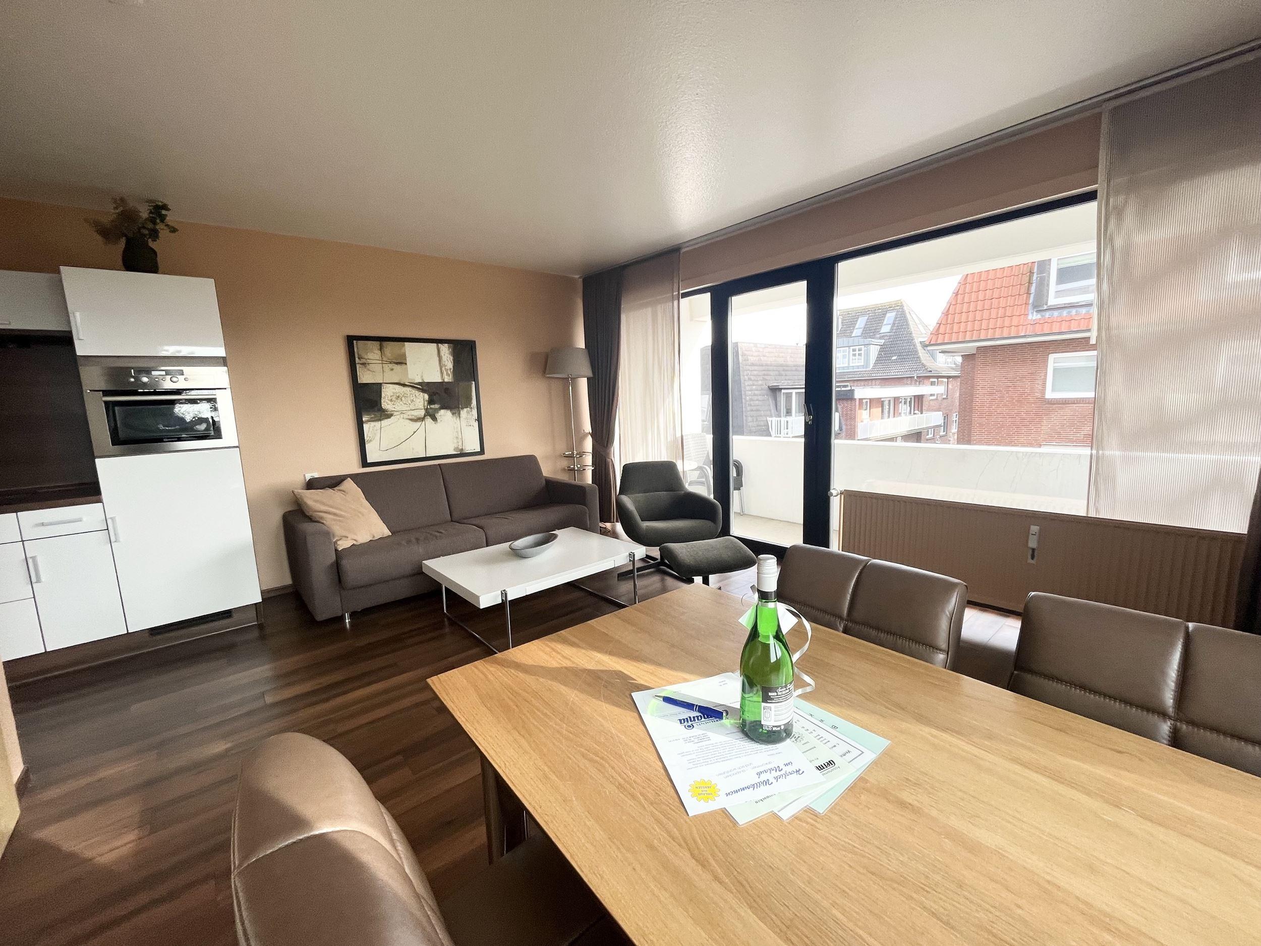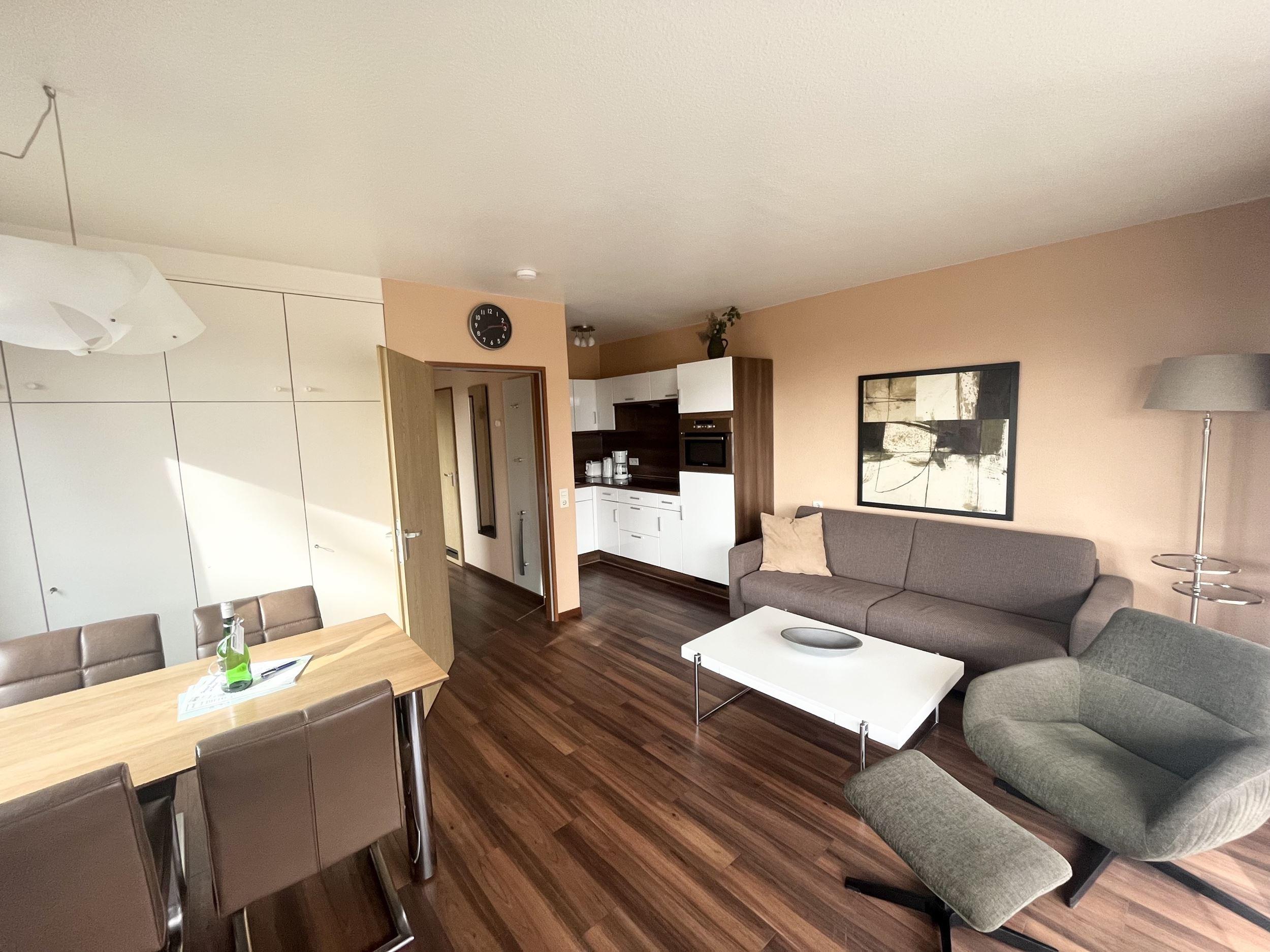 Schlafraum mit 2 Einzelbetten (je Bett 90 x 190), Wohn-Schlafraum mit Doppel-Schlaf-Couch, PVC-Fußboden, Essecke, Küchenzeile mit Mikrowelle, Backofen und Geschirrspüler, Dusche/WC, Kabel-TV, Durchwahltelefon, Balkon, PKW-Platz-Nr. 37, Aufzüge und Fahrradkeller vorhanden. Rezeption, Brötchenservice, Schwimmbad, Sauna kostenpflichtig, kostenfreier Internetzugang (LAN1-Germania).